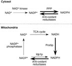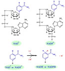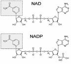 | Nikotinamit adenin dinükleotit fosfat: Bazı oksidasyon-redüksiyon reaksiyonlarında hidrojen atomları ve elektronların taşıyıcısı olarak işlev gören koenzim, NADP. Hücrelerde anabolik tepkimelerde, örneğin yağ asidi ve nükleik asit sentezinde, bir indirgeyici olarak kullanılır. NADP NADP+'nın indirgenmesiyle elde edilir, NADP+ de NADPH'nin yükseltgenmiş halidir. |