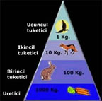 Besin zinciri dizinindeki her fert kendisinden bir öncekini yer ve kendinden bir sonraki tarafından yenir. Besin zincirinin en alt basamakta yer alan; fotosentez yapan ototrof canlıların (kendi belek/bitkiler) birim alandaki toplam biyomass ağırlığı bir üst basamaktakilere göre (ot oburlara/ot yiyen/herbivor)daha fazladır. En üst basamakta yer alan (et oburlar/karnivorlar/piramidin tepesinde ) toplam biyomas oranı en az olanlardır. |