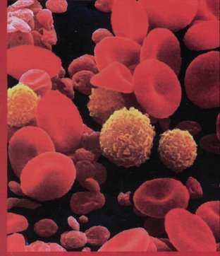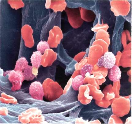 Kanın renklendirilmiş taramalı elektron mikroskobuyla alınmış görüntüsünde kırmızı ve beyaz hücrelerle, pıhtı pulcukları görülüyor. Kırmızı kan hücreleri "eritrosit", her iki yüzeyi de, karakteristik içe doğru çökmüş görüntüleriyle ve yüksek sayılarıyla hemen belli oluyor. Bu hücreler hemoglobin adlı kırmızı bir pigment içeriyorlar. Okisjen hemoglobine bağlanarak dokulara ulaşıyor. Görüntüde sarı küreler biçiminde izlenen akyuvarlarlar "lökositler" yüzeylerinde ipliksi yapılar bulunan küre biçimli hücreler. Bunlar vücudun bağışıklık tepkisinde önemli rol oynuyorlar. Pulcuklar (pembe) kan pıhtılaşmasında önemli rol oynayan görece küçük hücreler.