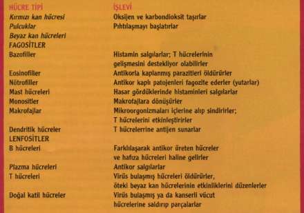 eritrositler), beyaz küreler (lökositler ve lenfo-sitler), trombositler olarak üç gruba ayırabiliriz, itrositlerin başlıca görevi dokulara oksijen ta-.şırmak ve dokuda yakılan oksijenin atığı olan kar-bondioksiti dışarıya atılmak üzere akciğerlere taşımaktır. Eritrositler disk şeklinde göbek kısmı riye doğru basılmış son derece esnek hücredir. Esnek yapıları eritrositlerin en küçük doya kadar gidebilmesine ve en ince damarlar nde bile dolaşabilmesine olanak sağlar. Beyaz reler çeşit çeşit. Kabaca lökositler ve lenfosit-diye ayırabiliriz. Lökositler parçalı çekirdek-i olan hücreler, eosinofiller, bazofiller, makro-lar, monositler diye gruplanabilir. Bunlar ve trositler köken olarak aynı soydan gelen hüc-er. Bu grup hücrenin temel fonksiyonu, mik-ropları tanıyıp fagosite ederek ya da salgılarıyla eritmek. Lenfosit grubu beyaz küreler, lökosit ubu hücrelerle aralarında uzak akrabalık bu-nmasına karşın ayrı bir soydan gelirler. Bu creler bağışıklık sisteminin temel hücreleridir, as fonksiyonları mikropları ve vücuda yabancı r şeyi tanımak, bunları unutmamak ve ileriki manlarda tekrar karşılaşırlarsa hatıralarına yanarak hemen yanıt vermek (hafıza hücrele-ve yabancıyla savaşmaktır. Bu hücreler bizi, bize yabancı her şeye karşı savunurlar. Yabancı her şey deyimiyle kastedilen, yabancı mikroplar, başka insanlara ait doku ve yapılar ve yabancı her şey. Bu fonksiyonlarını yabancıya yapışıp onu tahrip edecek maddeler salgılayarak (hücresel immû'nite) (başlıca T lenfositler olarak bilinen bir alt grubun işidir) ya da yabancıya ait yapıları tanıyıp onlara karşı salgılar üreterek uzaktan uzağa onları tahrip etmek suretiyle (humoral immünite) (başlıca B lenfositler olarak bilinen bir alt grubun işidir) yaparlar. Trombositlerse damar sisteminde oluşan bir travma sonrası kan damar dışına çıkacak olursa o bölgede toplanıp yarayı tıkamak, daha sonra başlayacak pıhtılaşma reaksiyonları için salgılar üretmek görevini yapan hücrelerdir. Başka bir deyişle trombositler, pıhtılaşma ve yara tamiri konularında ilk tepkiyi veren hücrelerdir.