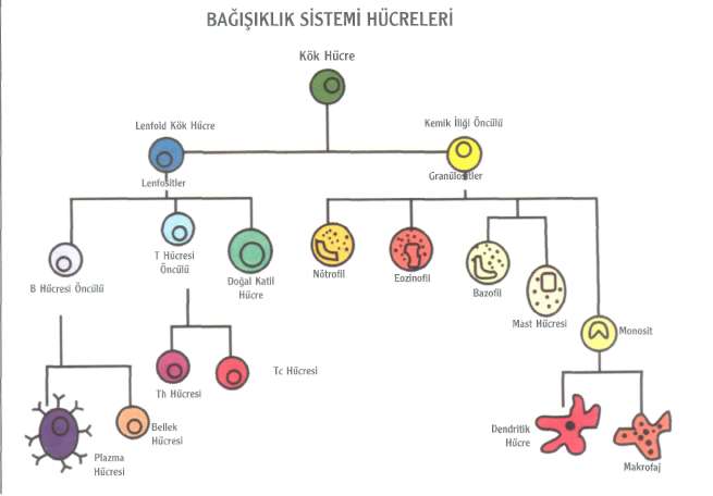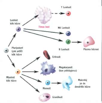 lar. Bu salgılar yabancı hücreye yapışarak onların ya doğrudan doğruya ya da bağışıklık sistemine ait özelleşmiş diğer hücreler tarafından yok edilmesine yararlar. Bu tür bağışıklık sistemine de humoral immünite denilir. Kan yapan kök hücrenin len-foid kolu bu hücreleri yapar. Bu sırada T lenfositleri yabancı hücreyi tanımak fakat bu arada kendine ait yapıları kollamak ve onları yabancıdan ayırmak için ve fonksiyonları sırasında işin dozunu kaçırmadan nerede duracağını kontrol edecek hücre alt gruplarını da oluşturmak için eğitimden geçirilirler. Bu eğitimin yeri timus'tur.
