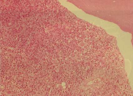 altta küre biçimli beyaz kan hücreleriyle bir kemik trabekulası (kahverengi) görülüyor. Kemik iliği, sünger