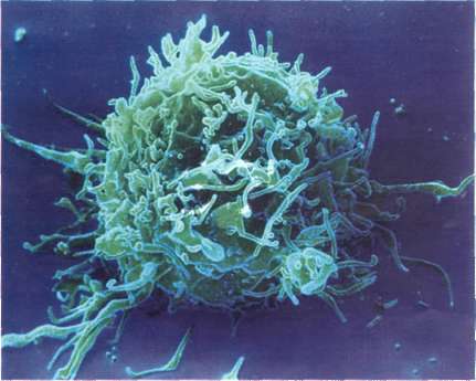 Beyaz kan hücrelerinden biri olan T-lenfosit ya da T-hücresinin renklendirilmiş taramalı elektron mikroskop görüntüsü. Bu hücrelerin bir özelliği, hücre yüzeyinden uzanan uzun "mikrovillus"lar. T-lenfositleri, AİDS