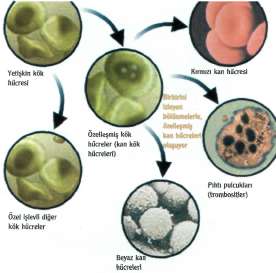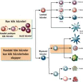 oluşturabilme yeteneğindedirler. Aynen bir tohumdan bir meyve ağacı ve sonunda meyvelerin oluşması gibi kök hücreler de hangi kan hücresini oluşturacaklarsa o hücrenin tohumu gibi hareket ederek bir yandan o kan hücresinin değişik olgunlaşma evrelerinden geçerken, bir yandan da çoğalırlar. Bu değişim sırasında erken gelişme evrelerinde çoğalma fonksiyonu çok fazlayken daha sonra hücrenin olgunlaşma ve normal fonksiyonlarını kazanabilme için uğraşısı daha önemli bir yer tutar. Kök hücre o sırada hangi kan hücresine ne kadar gereksinim varsa onu yapmak için farklılaşır ve çoğalır. Bu eylem içinde tümüyle hiyerarşik bir zincir izlenir. Kök hücrenin hangi hücreyi oluşturacağı ve ne kadar hücre oluşturacağı bu olgunlaşma sürecinde hem ara kademeleri kontrol eden, hem de daha kök hücre düzeyinde etkiyen bazı hücre salgıları (büyüme faktörleri, sitokinler) tarafından kontrol edilir ve belirlenir. Bu salgılar hem olgun bazı kan hücreleri tarafından, hem de kemik iliğinde kök hücre ve ondan olgunlaşmakta olan kan hücrelerine ev sahipliği yapan hücreler tarafından salınır. Anlaşıldığı gibi, kemik iliği değişik kan hücrelerinin değişik olgunlaşma evrelerinde yapılageldiği zengin çeşitlilik gösteren bir üretim yeri. Bu üretim başlıca iki ana koldan yürür. Bunlardan birisi sonunda eritrositler, löko-sitler ve trombositleri oluşturan myeloid kol, di-ğeriyse sonunda lenfositleri oluşturan lenfoid koldur. Bu olgunlaşma ve çoğalma sürecinde hücreler yeterli olgunluğa gelince en ince kılcal damarların içine girerek dolaşıma katılırlar. Artık hücreyle içinde bulunduğu çevre hücreler arası bazı bağlar ve belirteçlerdir. Bu düzenin aksamadan yürümesi, kök hücre ve kemik iliğinin ev sahibi hücrelerinin ve değişik olgunlaşma kademelerini kontrol eden mekanizmaların hatasız ve bir saat dakikliği ve bir kuyumcu titizliğinde çalışması sayesinde mümkün olur.