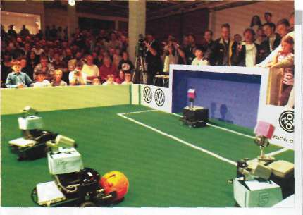 ROBOT FUTBOLCULAR: Robotlar arası futbol turnuvaları son zamanlarda oldukça gözde. Futbol robotları, sensörler sayesinde oyun alanı üzerinde yönlerini bulabiliyor ve topu tanıyabiliyor ve birbirleri arasında haberlesiyor, pozisyonlarını ve izlenimlerini bildiriyor ve böylece yardımlaşmalı bir oyun oynayabiliyorlar. Birbiriyle yardımlaşan İlk robotlar endüstride