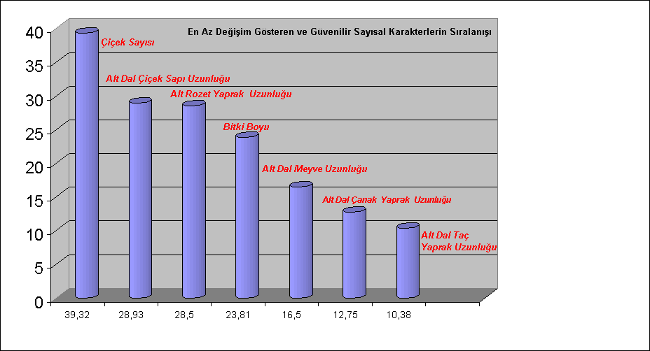 ����������� Bu verilere dayal� olarak taksonlar�n �zg�n ve ortak �zellikleri saptanarak, literat�rde az bilinen; morfolojik �zellikleri, �i�eklenme d�nemleri, yay�l�� y�kseklikleri hakk�nda daha ayr�nt�l� ve sa�l�kl� bilgi verilmi�tir. Draba cappadocica ���Boiss. & Ball and Draba rosularis Boiss t�r�n�n, bu �al��ma dayal� son betimleri ortaya ��km��t�r. T�rlerin, populasyon, tan�mlay�c� ve kuru materyal resimleri �ekilmi� veya scan edilmi�tir. Bitki boyu, yaprak boyu / eni, �anak yaprak boyu / eni, ta� yaprak boyu / eni, meyve boyu / eni ve di�er baz� �zellikleri bak�m�ndan incelenen bu iki t�re ait say�sal veriler(Tablo 1,); SPSS �paket program� ile analiz edilerek (Tablo 2,3) de�erlendirilmi�tir.�statistik analizleri ile; en �ok de�i�iklik g�steren karakterden en az de�i�iklik g�sterene do�ru, de�i�im katsay�lar�na dayal� olarak en g�venilir (en az de�i�ken) say�sal �zellikleri saptanm��t�r(Grafik 1, 2).Ayr�ca taksonlar�n halk aras�nda ki yayg�n isimleri de bildirimizde yer almaktad�r. �