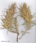 | B. trifida (Vahi) C.A.Meyer, Verz. Pfl. Cauc. 108 (1831). Syn: Rhinanthus trifidus Vahi, Symb. l :44 (1790); Bungea szovitsii Gand. in Bull. Soc. Bot. Fr. 11:45 (1914). Ic: Takht. & Fedorov, Fl. Erevana ed. 2: t. 75 (1972). Figure 24, p. 771. Map 59, p. 773. Caespitose perennial with a woody rootstock. Stems several, 6-23 cm, erect or ascending, simple, leafy to apex, mostly fertile, with an eglandular arachnoid indumentum. Leaves opposite, at least below, 2-4.5 cm, sessile, trifid, segments linear, to 3-5 cm. pilose. Inflorescence a condensed spike; flowers solitary in leaf axils. Bracteoles 2, as long as calyx. Pedicels 1-3 mm. Calyx with short tube, membranous between veins, c. 10 mm, persistent; teeth linear-acuminate, 25-30 mm, exceeding corolla. Corolla pale yellow, pilose; tube 15-25 mm; lobes 9-12 mm, lower exceeding upper. Capsule 12-20 x 4-9 mm, with long beak. Fl. 5-7. Dry, rocky igneous and limestone slopes, loamy hills, pastures, 940-2500 m. Type: [E. Anatolia?] 'Pedicularis orientalis supina folio trifido flore magno flavescentia', Tournefort (holo. C-Vahl, photo! iso. P-Tourn. 984, photo! B-Willd. 11165, photo!). Inner Anatolia. A4 Ankara: Hacikadin valley nr Keçiören, D. 18773 ! A6 Sam-sun: Murat Su, Andrasovszky 667. A8 Erzurum: Aras river gorge, 1700 m, Tobey 2100! A9 Erzurum: Horasan, 1600 m, D. 29382! B2 Uşak: Uşak, Bal. B3 Eskişehir: Eskişehir, Warburg & Endlich 215. B4 Ankara: Ankara,- Bodrıım. 1892:3085! B5 Nevşehir: c. 14 km from Ürgüp to Akköy, 1400 m, Coode & Jones 1302! B6 Kayseri: Pinarbaşi, 1300 m, Stn. & Hend. 5142! B7 Elaziğ: Harput, Sint. 1889:239! B9 Bitlis: Kambos Da., above Hurmuz, 2440 m, D. 23478! B10 Kars: Pamuk Da., 20 km from Iğdir to Doğubayazit, 1600 m, D. 43867! C3 Burdur: 10 km S. of Burdur. Hub.-Mor. 5734. C4 Konya: 8 km S.W. of Konya, 1300 m. Sorger 66-41-67. C9 Hakkari: Beytuşşebap to Uludere, 2500 m, Ri.x 2340! C10 Hakkari: Sat Da., nr Varegöz, 1850 m, D. 45741 ! Anti-Lebanon, Soviet Armenia, N., N.W., W. & C. Iran. Ir.-Tur. element. A distinctive species easily recognized on general facies and the bibracteolate calyces; superficially similar to some Labiatae such as Ajuga. |