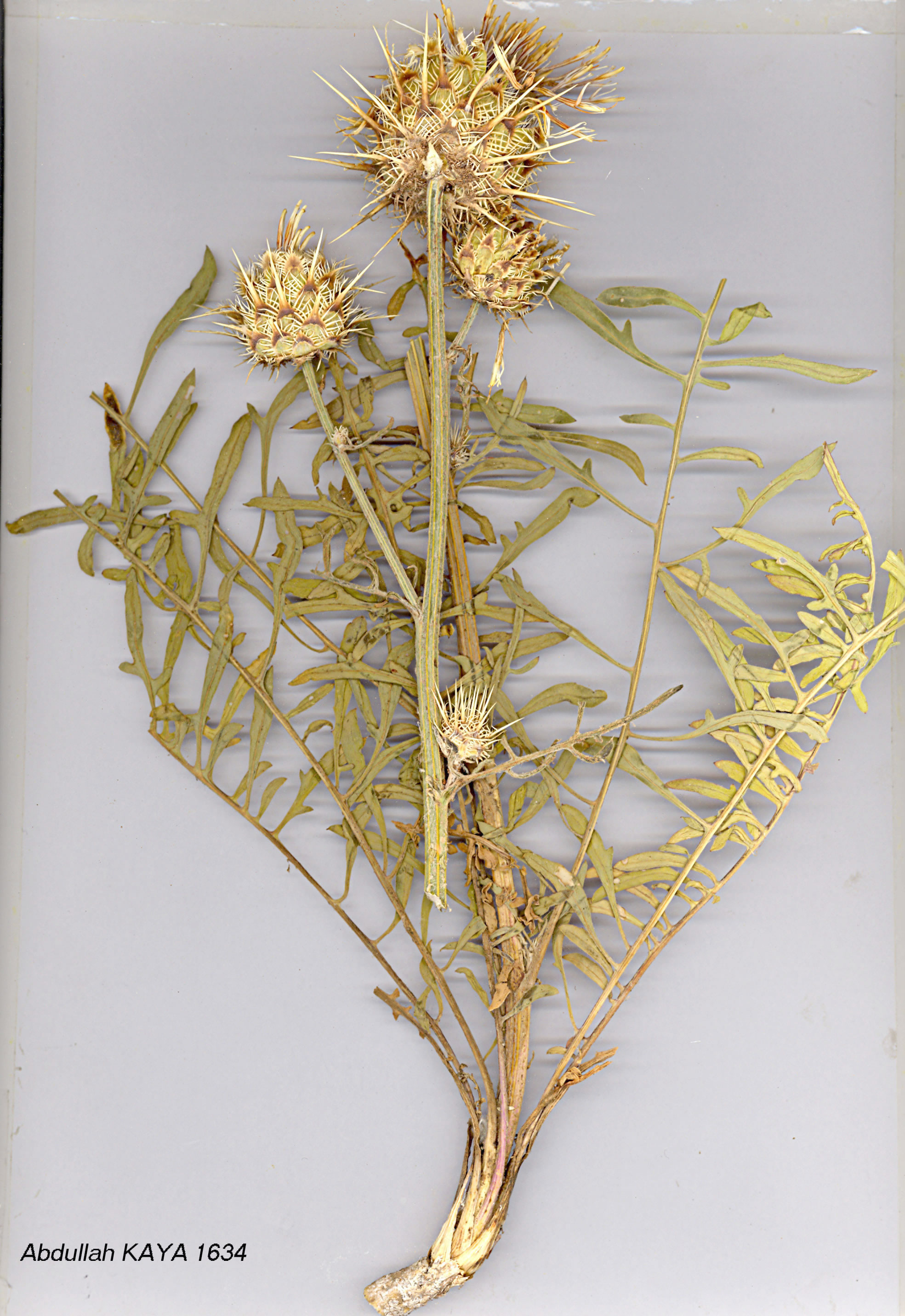| C. carduiformis DC., Prodr. 6:590 (1838). Biennial (or more rarely perennial) with thickened taproot, stem erect, (10-)20-90 cm, usually branched only in upper part with 3-5 capitula (sometimes branched more profusely). Stem and leaves (especially below) hispid or arachnoid-tomentose. Leaves l-2-pinnatisect, larger segments l.5-8(-12) mm broad, terminal equal or only slightly larger, small segments usually present between large ones. Involucre 17-25(-30) x(15-)20-25(-30) mm, ovoid. Appendages only partly concealing basal part of phyllaries, triangular, gradually narrowed into spine, 10-30 mm (incl. spine), dark to light brown, with numerous cilia on each side ( ± ascending the spine), (l.5-)4-5(-8) mm. Flowers rose-purple or whitish (nerves usually orange). Achenes 5-6(-8) mm; pappus (6-)7-10 mm, inner row 1.5-2.5 mm. 1. Stem and leaves not hispid, arachnoid (floccose)-tomentose; appendages 4-6 mm broad at base subsp. orientalis 1. Base of stem and lower side of leaves hispid with septate hairs; appendages 2.5-3.5(-4) mm broad at base subsp. carduiformis 2. Appendages (incl. spine) usually more than 15 mm, cilia 3-5(-8) mm var. carduiformis 2. Appendages 10-15 mm, cilia 1.5-2 mm var. thrinciifolia subsp. carduiformis. var. carduiformis. Syn: C. zederbaueri Hayek in Ann. Nat. Hofmus. Wien 20:425 (1905)! C. thrinciifolia DC. var. incanescens Bornm. in Feddes Rep. Beih. 89:381 (1944)! Colymbada carduiformis (DC.) Holub in Folia Geobot. & Phyto-tax. 7:315 (1972)! Figure 3, p. 11. Fl. 6-7. Steppe, fallow fields, 500-2200 m. Type: [Turkey] Armenia, Aucher 3137 (G-DC!). Mainly C. Anatolia. A3 Ankara: between Nallihan and Cayirhan, 630 m, Buttler 13741! A4 Çankiri: nr Çankiri, 800-900 m, Bornm. 1929:14321! A5 Amasya: Ak Da. nr Amasya, 600-700 m, Bornm. 1889:545! A6 Sivas: 26 km W. of Suşehri, 1600-1700 m, Sorger 69-34-10! A8 Gümüşane: 13 km from Bayburt to Aşkale, Rech. 37710! B3 Eskişehir: 28 km from Polatli to Sivrihisar, 800 m, Coode & Jones 2259! B4 Konya: Cihanbeyli, D. 18638! B5 Kayseri: Erciyas Da., Al Da., 1400-1800 m, 13 vii 1902, Zederbauer (type of C. zederbaueri)! Kayseri/ Yozgat: between Kayseri and Yozgat, 1400 m, Bornm. 1890:2243'(type of C. thrinciifolia var. incanescens)*. B6 Malatya: N. of Darende, 950-980 m, Hub.-Mor. 9486! B7 Erzincan: 13 km W. of Erzincan, 1400 m, 8 vii 1963, M.Zohary! C4 Konya: 38 km from Karaman to Çumra, 1030 m, Hub.-Mor. 8679! C5 Niğde: 24 km N. of Pozanti, 28 viii 1959, M.&D.Zohary! |