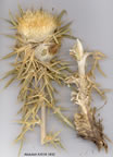 | C. macrobotrys (C.Koch) Boiss., Fl. Or. 3:532 (1875). Syn: Epitrachys macrobotrys C.Koch in Linnaea 24:399 (1851). Map 43, p. 389. Biennial, 30-200(-300) cm. Stem unbranched, unwinged, arachnoid. Median cauline leaves semi-amplexicaul, oblong, pinnatisect, lateral lobes bifid, 3-8-paired, triangular to narrowly triangular, lateral and terminal lobes with weak to moderately stout 3-14 mm apical spine; spinose-strigose above with setae 0.2-2.5 mm, otherwise glabrous; arachnoid below. Uppermost leaves 6-10, longer or shorter than involucre. Involucres erect, subsessile, spicate, (3-)5-12 at stem apex, subglobose-ovoid or angulate-ovoid to broadly obovoid, 20-35 mm. Phyllaries glabrous below, arachnoid at apices, c. 8-10-seriate; outer longer than or equal in length to median; median c. 13-19 mm incl. weak reflexed, recurved or ± erect c. 1-2 x 0.1 mm apical spine. Corollas ochroleucous (A8 & A9), whitish-pink (C9) or purplish-pink (B7 & B8), 23-28 mm. Achenes c. 5.5 mm. Pappus 22-24 mm. Fl. 7-9. In cultivated fields (lucerne), pastures, waste land, 1067-3200 m. Type: [Turkey B8 Erzurum] im armenischen Hochlande, in den Gauen 'Gokssu und Chynys', C.Koch (B). E. Anatolia, except Mesopotamia. A8 Erzurum: Erzurum to Bayburt, 1750 m, Buttler 15924! Gümüşane: Bayburt, 1067 m, Balls 2035! A9 Kars: Yağmurlu Da., 2250 m, D. 32610! Erzurum: Oltu, Abussar Da., Koenig. B7 Erzincan: Sipikör, Sint. 1890:3293! B8 Erzurum: Palandöken Da., 2000-2150 m, D. 47412! Bingöl: 85 km W.S.W. Erzurum towards Tercan, Rech. 15134! Muş: 24 km E. of Muş, D. 24779! B9 Van: Çuk, 1900 m, Nábělek s.n. C9 Hakkari: Kara Da., 3200 m, D. 24452! C10 Hakkari: Mons Harefta, Gulamerik (Hakkari), 2000 m, Nábělek 3542. Soviet Azerbaijan, Caucasus, N. Iran (Talysh). Distinguished from C. lappa-ceum by its biennial habit and large sessile involucres with long outer phyllaries. |