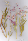 | E. angustifolium L., Sp. PI. 347 (1753) excl. syn. Syn: Chamaenerion angusti-folium (L.) Scop., Fl. Carn. ed. 2:271 (1772); E. spicatum Lam., Fl. Fr. 3:482 (1778). Ic: Ross-Craig, Draw. Brit. PI. 9: t. 38 (195S). Stout erect perennial; stems simple, 50-250 cm, arising from a thick rootstock, ± strigose above to entirely glabrous. Leaves narrowly lanceolate to lanceolate, 2.5-13 x 0.5-3 cm, glabrous though sometimes pubescent on the underside of the midrib, ± obscurely denticulate. Inflorescence a simple elongate lax raceme. Flowers drooping in bud; petals 8-18 mm, deep pink or magenta; styles much-longer than stamens. Capsule 2.5-8 cm; seeds 1-1.4 mm, smooth. FL 6-8. Forests, open grassland, rocky slopes, etc., 650-3050 m. Described from Sweden (Hb. Linn. 486/1, photo!). Widespread, though rare in C. & E. Anatolia. A1(E) Kirklareli: nr. Velike köprüsü, A. Baytop 13887! A2(A) Bursa: Mt. Olympus (Ulu Da.), Boiss. A3 Bolu: Ala Da., Kartal Kaya, 2000 m, Khan et al. 507! A4 Ankara: Hacikadin dere, Frères E. C. 519! A5 Sinop: Çangal, Kertil, c. 1550 m, viii 1945, Kasapligil. A6 Ordu: below Cambaşi, 1500 m, Tobey 1273! A7 Giresun: Kulak kaya ormani, c. 1600 m, Duygu. A8 Trabzon: N. side of Soğanli Da., above Bayburt, 2000-2200 m, D. 32129! A9 Kars: Kisir Da., above Susuz, 2000 m, D. 30526! Bl Balikesir: Mt. Ida (Kaz Da.) nr. Kereikos, Sint. 1883:763! B2 Kütahya/Bursa: 50 km from Tavşanli to Inegöl, 1200-1400 m, Dudley, D. 36171! B5 Kayseri: Erciyas Da., 2225 m, Bal. 360! B8 Erzurum: 20 km from Hinis to Pasinler, 1950 m, D. 46276! B9 Bitlis: Kotum, 1900 m, D. 22412! B10 Kars/Ağri: Ağri Da. (Grossheim 6: map 285). C2 Antalya: Elmali, Koçeva, Demirdöğen 2585! C3 Isparta: Dedegöl Da., 1400 m, Sorger 68-43-82! C4 Antalya: Han Boğaz, nr. Geyik Da., 1600 m, D. 14718! C5 Adana: Cilician Gates (Gülek Boğazi), 19 viii 1855, Bal.! C6 Hatay: Gavur Da., Kusliji Da., 1500-2000 m, Haradj. 2543! C9 Van: Botan Çay nr. Çatak, 1500 m, Nábèlèk. Eurasia? N. America. Two cytological subspecies, which are not always distinguishable on the basis of their morphology alone, have been recognized in N. America. These are subsp. angustifolium-2n = 18, and subsp. circumvagum Mosquin-2n = 36, 54 (vide Mosquin in Brittonia 18:167, 1966). Mosquin has referred two of the Turkish specimens available to him (from A7 Gümüşane: pass between Köse and Gümüşane, 2000 m, D. 31948! and A9 Kars: Sarikamiş, 2100 m, D. 32644!-an aberrant, grazed specimen) to subsp. angustifolium. The remainder he referred to subsp. circumvagum. Since no chromosome counts have been obtained from Turkish material, the validity of these two subspecies in Turkey cannot be ascertained. |
