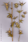 | E. falcatum Delar., Eryng. Hist. 40, t. 13 (1808). Ic: Boul, Fl. Lib. Syr. t. 151 (1930). Slender perennial. Stems 20-70 cm, usually branched above the middle. Basal leaves withering at flowering time, narrowly triangular with cordate base, 2.5-6 x 1.5-4.5 cm, subcoriaceous, crenate-muticous. Cauline leaves subsessile, 3-5-sect into oblong-linear, spiny-margined segments. Inflorescence glaucous, racemose to narrowly paniculate; capitula (l-)4-28, hemispherical, 8-15 mm diam. Bracts 5, linear, pungent, 2-4 x capitulum, bearing 2 slender deflexed spines at base. Outer bracteoles tricuspidate; inner entire or tricuspidate. Fl. 7-9. Rocky slopes, open woodland, macchie, s. 1.-900 m. Type: [Lebanon] in monte Libano, Labillardiere. S. Anatolia. C2 Antalya: d. Kaş, Demre gorge, 3 m, Khan et al. 187! C3 Antalya: Yenice Khave to Termessus, D. 13936! C5 Adana: S. end of Ulukişla pass, 900 m, Findlay 242! C6 Hatay: Dörtyol, 150 m, Darrah 544! Gaziantep: Gaziantep, Hb. Post.! W. Syria. E. Medit. element. |