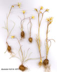 | G.bulbifera (Pallas) Schultes & Schultes fiL, Syst. Veg. 7:552(1829). Syn: Omithogalum bulbiferum Pallas, Reise 2:736 (1773)! G. bulbifera (Pallas) Salisb. var. nuda Regel in Acta Horti Petrop. 6:511 (1879);G. bulbifera (Pallas) Schultes & Schultes .OL var. armena Miscz. in Fl. Cauc. Crit. 9(8): 175 (1912). Ic: Reichb., Ic. FL Gem. 10: t. 481 f. 1056(1848). Bulb with pale brown tunic extended into a short neck, usually entwined with thickened roots. Basal leaves 1 or 2, filiform, 1-2 mm broad. Inflorescence simple, forked (or cymose), 1-15 cm, with crisped hairs. Cauline leaves many, alternate, filiform, hairy at base, crowded in lower part of stem, each with a single leafless bulbil in its axil. Flowers l-2(-5). Perianth segments yeEow with a central green stripe outside, narrowly oblanceolate, 9-12 mm, glabrous. Capsule narrowly ovoid. FL 4-6. Stony slopes, rocks, cemeteries, 1350-3000 m. Type: [USSR] in aridis limosis ad Wolgam et laicum, Pallas (iso. BM!). E. Anatolia. A7/8 Gümüşane: Gümüşane to Bayburt, 1500 m, Stainton 8350! A9 Kars: Kağızman, Sauer 264/57! B7 Erzincan: Çaplayan, Çukur mezrası, Munzur Da., 1350-1600 m, Yildirimli 2587! B8 Erzurum: Çiflik village, University farm, Erzurum, 14 v 1967, J.G. Ross! B9 Erzurum: Tahir Da. nr Aktaş, 2000 m, T. Baytop (ISTE 34909)! Bitlis: Tatvan, Ortatepe, 2600 m, Pes/nen 2735! Van: Çuh pass, N.W. of Başkale, 3000 m, Watson et al. 1531! B10 Kars: N.E. slope of Ağri Da. nr Serdar Bulak, 2500 m, D. 43749! Ağri: by palace E. of Doğubayazit, 1890 m, D.M. Brown 405! Romania, S. Russia, Caucasia, Iran, C. Asia, W. China. Euro-Sib, element. The records of Andrasovsky from B4 Ankara (in rupestribus vallis Indije-su [incesu] prope oppidum Angora; ad fines Galatiae et Lycaoniae pxope pagum Sejid Achmedli) are possibly misidentificatioss. |