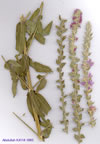 | L. salicaria L., Sp. PI.446 (1753).Syn:L. tomentosum DC,Cat.Horti Monsp. 123 (1813); L. cinereum Gris., Spic. 1:110 (1843). Ic: Hegi, I1I. Fl. Mittel-Eur. 5(2): t. 188 (1925); Ross-Craig, Draw. Brit. PI. 11: t. 15 (1958). Stout, ± densely pubescent perennial; stems 20-180 cm, winged, sparingly branched. Leaves 10-70 mm, ovate to narrowly lanceolate, truncate to sub-cordate at base, sessile. Inflorescence a ± dense verticillate spike. Flowers 3-8, in axillary cymose whorls, trimorphic; hypanthium 4-5 mm, broadly tubular in flower and fruit; epicalyx segments 2.5-3-5 mm, subulate; sepals 0.5-1 mm, del-tate; petals 8-12 mm, purple: stamens 12. Capsule 3-4 mm, ovoid, included within the hypanthium. FI 6-8. Wet places by lakes and streams, dry river beds, etc., 100-2000 m. Described from Europe (Hb. Linn. 626/1, photo!). Widespread in Turkey, local. A1(E) Tekirdağ: Gölcük Köyü, A. Bay top 13497! A1(A) Çanakkale: Assos, Sint. 1883:434! A2(E) Istanbul: nr. Prinkilliç, T. Baytop 13145! A3 Bolu: Abant G., Khan et al. 543! A4 Kastamonu: Kastamonu to Tosya, 1200 m, Khan et al. 646! A5 Kastamonu: Tosya, Sint. 1892:4750! A6 Tokat: Tokat to Artova. D. 24857! A7 Giresun: 25 km S. of Giresun, 500 m, Sorger 63-23-37! A8 Rize: Karadere to Güneyce, 500 m, D. 20825! A9 Kars: Gorge above Kötek, 36 km from Benliahmet to Kağizman, 1500 m, D. 46656! Bl Izmir: nr. Smyrna (Izmir), 19 x 1867, J. Ball! B2 Balikesir: Dursunbey, Cendere, 900 m, Büyüksomer 264! B3 Konya: nr. Akşehir G., Findlay 295! B4 Ankara: Beynam Ormani, D. 13033a! B6 Sivas: 15 km N.W. of Divriği, 1200 m, Sorger 69-43-1! B7 Erzincan: plain E. of Erzincan, 1250 m, D. 31848! B8 Muş/ Bingöl: Muş to Solhan, 1300 m, D. 24785! B9 Ağri: Eleşkirt to Tutak road, Tong381! C3 Antalya: Antalya, Atay 40! C4Konya: Konya, Andrasovszky 530a. C5 Konya: Ereğli, Andrasovszky 530. C6 Hatay: Antioch (Antakya) 7 viii 1882, Hb. Post! C7 Diyarbakir: Diyarbakir, 1857, Holmes! C9 Hakkari: Çölemerik, 1600 m, D. 24350! C10 Hakkari: 12 km from Yüksekova, 1950 m, Duncan & Tait 152! Eurasia. Euro-Sib, element. Somewhat variable in the density of its indumentum. |