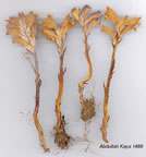 | O. purpurea Jacq., Enum. Stirp. Vindob. 108 (1762). Syn: Phelipaea coerulea (Vill.) C.A. Meyer, Verz. Pfl. Cauc. 104 (1831). Ic: Beck, Monogr. Orob. t. 2 f. 28 (1890); Ross-Craig, Draw. Brit. Pl. 23: t. 22 (1966). Usually unbranched, 15-60 cm tall, scurfy or mealy-glandular. Bracts and calyx scurfy-glandular. Calyx teeth lanceolate, acuta, usually shorter than tube, rarely longer, middle vein thick, purplish or leaden-grey. Corolla inclined forward, 18-32 mm, usually sparingly and extremely shortly glandular-pilose. Anthers glabrous or bearing a tuft of hairs. Fl. 7. Usually on Anthemis, Artemisia and Achillea, nr S.I.-2300 m. Type: [Austria] in collibus et montosis siccis agri Vindobonensis, Jacquin (holo. W!). N.W. Turkey, C. & S., Anatolia, Islands. A2(E) Edirne: Bosnaköy, Stojanov & Urumov. A2(E) Istanbul: Saray N.W. of Istanbul, Stojanov & Urumov. A2(A) Istanbul: Çatal Da., nr Alem Da., 5 vi 1892, Azn.! A4 Ankara: Kizilcahamam, 1960, Fitz! A5 Amasya: Ak Da., 800-1400 m, Boram. A6 Sivas:, Yildizdağ, 2300 m, Sorger 76-8-79! B3 Konya: Sultan Da., 1000 m, Boram. 1899:5416. C2 Antalya: nr Elmali. Bourgeau. C5 Adana: Karakilisse to Guyuk Su (Göksu), 10 vii 1906, B. Post! C6 Maraş: 10 km N. of Andirin, 900 m, Sorger 73-14-34! Is: Samos, Fors.-Maj. 397. Canary Islands, N. Africa, C. & S. Europe, Transcaucasia, Syria, N. Iran, Afghanistan, E. India. Sect. Orobanche (Syn: Osproleon Wallr.) Flowers with 1 bract, but without bracteoles. Spike and stem nearly always unbranched. Calyx cleft into two lateral halves, each of them entire or with 2 teeth, the halves rarely connate near base. |