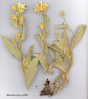| S. latifolia (Fisch. & Mey.) DC, Prodr. 7:124 (1838). Syn: Lasiospora latifolia Fisch. & Mey. in Ind. Sem. Horti Petrop. 30 (1835); Scorzonera panicu-lata Boiss., Diagn. ser. 1(7): 8 (1846); S. lasiospora Boiss. & Bal. in Boiss., Diagn. ser. 2(6): 118 (1859)! Ic: Lipschitz, Fragm. Monogr. Gen. Scorz. 1: t. 45 (1935). Map 63, p. 769. Erect caulescent perennial 15-60 cm; rootstock cylindrical. Leaves 7-14 x 2-2.5 cm, lanceolate, 3.5-6 x as long as broad, sparsely villous to glabrous, margin undulate; lower leaves amplexicaul or tapering into a c. 3.5 cm petiole. Inflorescence lax; capitula 10-25(-many) per stem, 18-24 mm long. Inner phyllaries 15-16 mm, narrowly lanceolate, villous; outer 5-7 mm, sparsely villous. Flowers yellow. Achenes 6-9 x 1 mm; densely hairy; pappus plumose. Fl. 7. Hillsides, fallow fields, 1200-3100 m. Syntypes: [Caucasia, Nakhichevan] in montosis herbidis Persiae valle Kad-schadera prov. Nakistchevan et [N.W. Iran] in montibus Seidschadschi prov. Aderbeischan, Szovits. E. Anatolia. A9 Erzurum: d. Oltu, Bardiz, 15 viii 1909, Roop. B5 Kayseri: Ali Da., 7 km S.E. of Kayseri, 1200 m, Bal. 862 (type of S. lasiospora)! B6 Sivas: 28 km N.W. of Divriği, 1500 m, Sorger 69-42-53! B7 Elazığ: Keban Maden, Sint. 1889:829! B8 Bingöl: 85 km W.S.W. of Erzurum on road to Tercan, Rech. 15109! Muş: Tepeko, 65 km from Muş to Erzurum, 5 vii 1963, M.Zohary! B9 Bitlis: Nemrut Da., 3100 m, Tong 136! C8 Diyarbakir: nr Diyarbakir, Kotschy. C9 Hakkari: 'mons Bestabije', Ashuti (Aşutka) to Çölemerik, 1600 m, Nábělek 3994. C10 Hakkari: Zab gorge, 6 km N. of Hakkari to Van and Yüksekova roads, 1800 m, D. 45836! N.W. Iran, Caucasia. Ir.-Tur. element. This species appears to be more variable outside Turkey than within. A flowering specimen from B9 Ağri (45 km fromKaraköse to Horasan, Rech. 14998!) with leaves 3-5 cm wide, may be referable to var. macrophylla Prilipko (apud Lipschitz, Fragm. Monogr. Gen. Scorz. 1 : 136, 1935). The species is distinguished from S. tomentosa by its hairy achenes and sparsely hairy leaves. This and the following four species form a complex of closely allied taxa, some of which may not be specifically distinct. A compre-hensive review of Caucasian material of this complex is required before the status of these taxa can be properly assessed. |