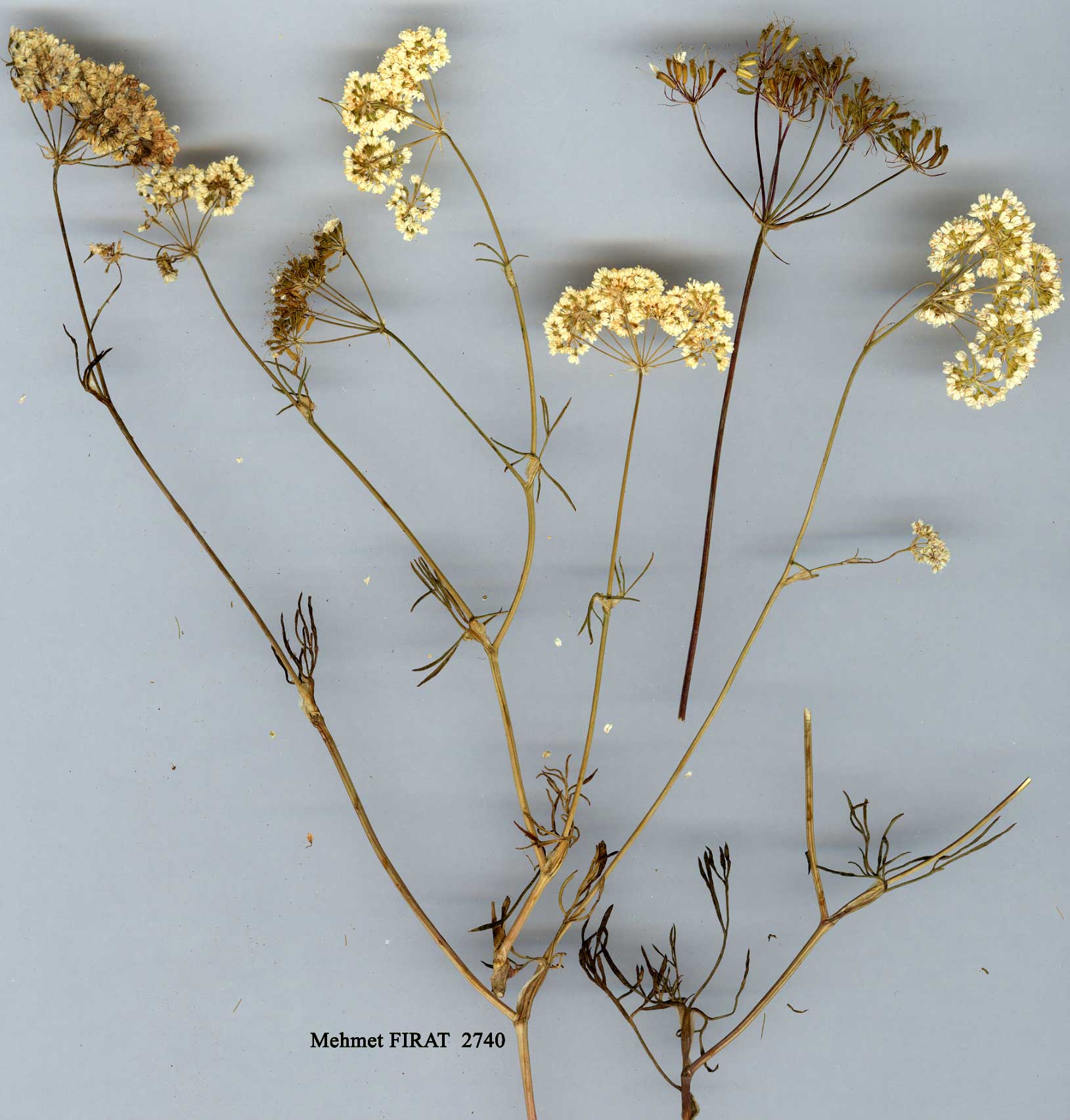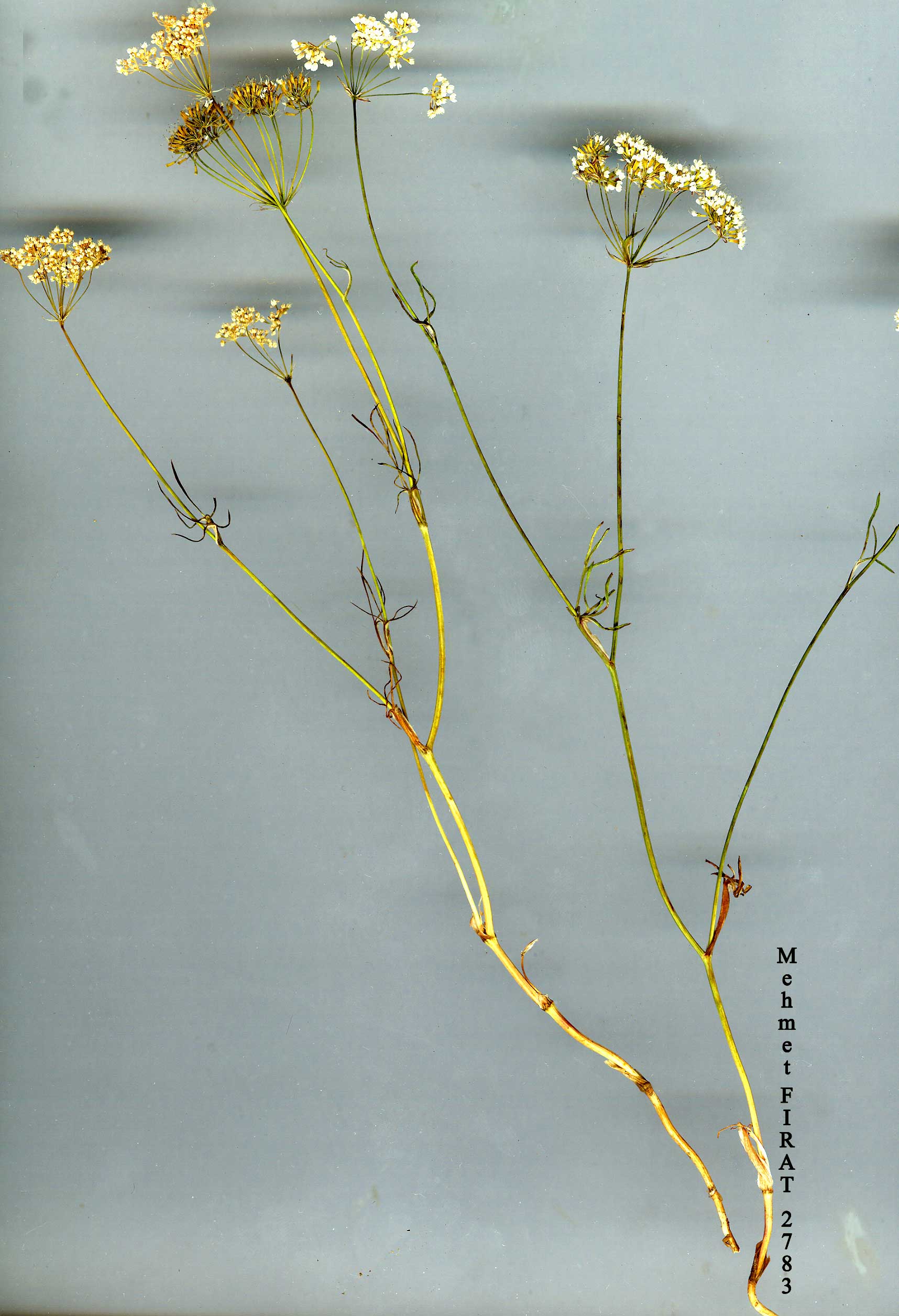 | B. paucifolium DC, Prodr. 4:117 (1830). Syn: Carum elegans Fenzl, Pug. 16 (1842); Bunium elegans (Fenzl) Freyn in Öst. Bot. Zeitschr. 3:83 (1892). Figure 7, p. 277. Map 53, p. 341. Glabrous ascending or erect perennial with branched terete finely ridged stems, 10-120 cm. Basal leaves triangular, up to 30x13 cm, 2-3-pinnate; ultimate segments linear, very variable in length. Upper cauline leaves 1-2-pinnate with linear to filiform segments and sheathing petioles. Rays 3-15, ± equal, 5-40 mm. Bracts 2-9, 1-20 x 0-5-2 mm. Bracteoles 1-7, 1.5-10 x c. 0.5 mm. Flowers white or pinkish, 5-20 per umbellule; petals not inflexed, c. 2 mm long. Fruits oblong, glabrous, c. 5x2 mm; styles 2-3 mm, spreading to defiexed; stylopodium ± flat. A common and very variable species in eastern Anatolia, easily recognized by the large petals and long fruiting styles. Many varieties have been recognized based on the variation or degree of branching, bract length, number of rays, length of pedicels, etc. Although many of these taxa completely intergrade, three are probably worth recognizing. 1. Rays short, 10-15 mm; pedicels stellately spreading and about as long as fruit var. brevipes 1. Rays 10-40 mm; pedicels not stellately spreading in fruit, shorter or longer than fruit 2. Stems unbranched below, much branched in inflorescence region; rays 3-6 var. junceum 2. Stems branched from base; rays 6-15 var. paucifolium var. brevipes (Freyn & Sint.) Hedge & Lamond. comb. nov. Syn: B. elegans (Fenzl) Freyn var. brevipes Freyn &. Sint. in Ost. Bot. Zeitschr. 42:83 (1892)! Fl. 6. Rocky slopes, 1730-2500 m. Type: [Turkey B7 Erzincan] Jarbaschi, near Kemaliye, Sintenis 1889:653 (iso. LD!). E. Anatolia. B7 Malatya: Kube Da. between Malatya and Pütürge, 1730 m, Hub.-Mor. 9439. C7 Adiyaman: Nemrut Da. at Kâhta, 2200 m, Hand.-Mazz. 2116. C9 Hakkari: 5 km from Hakkari to Kaval, 1850 m, D. 45409! CIO Hakkari: Bacirge to Yüksekova, 2500 m, Watson et al. 2960! Endemic? Ir.-Tur. element. |
