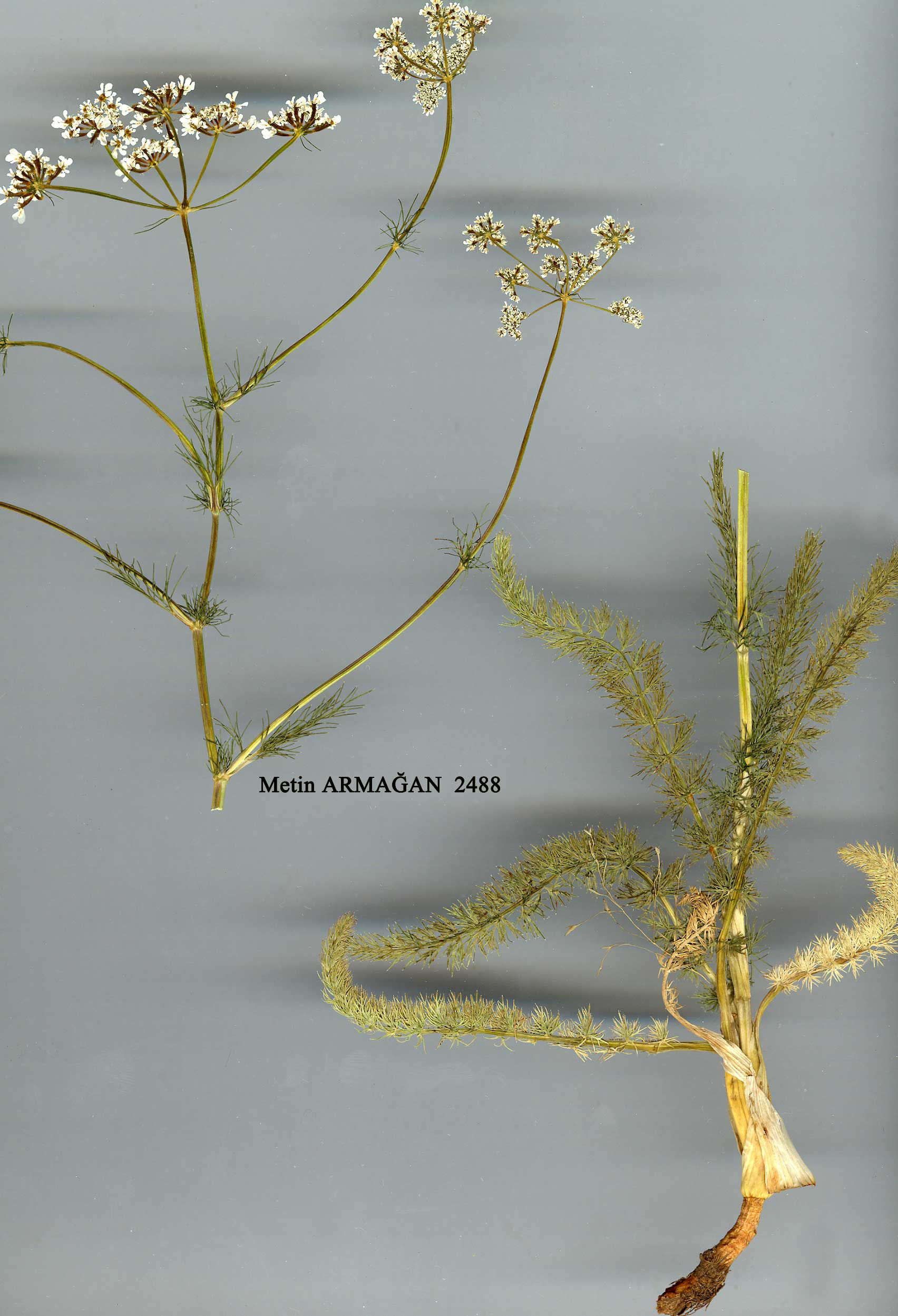 | G. daucoides DC, Mem. 5 (Umb.):62 (1829). Syn: G. aucheri Boiss. in Ann. Sci. Nat. ser. 3, 2:67 (1844); G. aucheri Boiss. subsp. pauciradiatum Freyn & Sint. in Üst. Bot. Zeitschr. 42:128 (1892)! Prionitis daucoides (Boiss.) Koso-Pol. in Bull. Soc. Nat. Mosc. n.s. 29:140 (1915); P. aucheri (Boiss.) Koso-Pol., loc. cit. Ic: Fl. URSS 16: t. 8 f. 1 (1950). Erect, branched ± glabrous plants with angled or ± terete stems, 25-55 cm. Basal leaves triangular, 11-17x2-3 cm, 2-pinnate: pinnae deeply pinnatisect, segments linear, 2-5 mm; lower leaves similar but narrower. Upper leaves 1-pin-nate, shorter, ± ovate, with ultimate segments to 10 mm. Rays 6-12, widely spreading, 2.5-7 cm. Bracts 5-7, pinnatisect with filiform segments, 5-15 mm. Bracteoles c. 6, entire or pinnatisect, c. 3-6 mm. Pedicels 1-6 mm. Sepals ± subulate. Umbellules with (l-)6-18 fruits. Fruit linear-oblong, 8-12 x c. 1 mm, unwinged. Style 2-3 mm. Fl. 5-6. Stony hillsides, damp meadows, 1200-2400m. Based on a specimen in Hb. Tournefort (no. 2783 in Hb. P)! Mainly E. Anatolia; rare in C. & S. Anatolia. A6 Sivas: Yildiz Da., 2200-2400 in, Bornm. 1890:2215. A7 Gümüşane: Aymene Bogaz, Sint. 1894:6222! A8 Gürnüşane: Beldak nr. Bayburt, 22 vii 1862, Bourgeau! A9 Kars: nr. Karakurt, vii 1912, Lonaczewiski. B6 Malatya: Kangal to Hekimhan, 1300 m, Stn. & Hend. 5387! 37 Erzincan: Egin, Jailabaschi, Sint. 1890:3505! B8/9 Muş/Bitlis: Muş to Tatvan, 1300 m. M. Zohary & Plitm. 2160-34! B9 Ağri: 2 km S.W. of Hamur (Murat valley) 1670 m', D. 44068! C4 Konya: Jelibel Da., Karaman to Ermenek, 1750 m, Hub.-Mor. 8201! C6 Gaziantep: Kurd Da., 1200-1530 m, Haradj. 1170! C7 Urfa/Diyarbakir: Karacadağ, 10 vi 1841, Kotschy. Georgia, Soviet Armenia, N. Iraq. Ir.-Tur. element. G. scabridum Boiss. (Ann. Sci. Nat. ser. 3, 2:66, 1844), described from 'Armenia' and based on Aucher 3606 (K! P!, one sheet as 'Persia') differs from G. daucoides in having longer pedicels and the petal oil-duct running the whole length of the petal. It is recorded from N. Iraq and N.W, Iran but apparently, despite the type locality given by Boissier, is not in Turkey. |