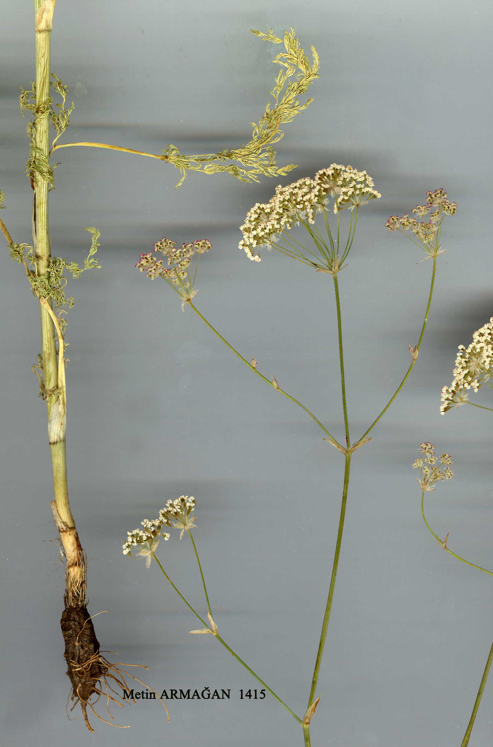 | S. glaucescens (D C.) Boiss., FI. Or. 2:877 (1872). Syn: Buniumglaucescens DC, Prodr. 4:117 (1830); Butinia glaucescens (DC.) Boiss. in Ann. Sci. Nat. ser. 3, 1:61 (1844); Elaeostictaglaucescens (DC.) Boiss., Diagn. ser. l(10):51 (1849); Carum glaucescens (DC.) O. Kuntze in Acta Horti Petrop. 10:190 (1887). Glabrous glaucous perennial with fusiform rootstock; stem 60-90 cm. Basal leaves lanceolate in outline, 3-pinnate; ultimate segments short, linear, sessile. Umbels 9-19-rayed; bracts and bracteoles 1-3 mm, ovate-oblong, scarious. Mericarps c. 2.5 mm, oblong, ridges obsolete. Type: [N.W. Iran] in convallibus herbidis ad Seidkhozi Persiae, Szovits. E. Anatolia, rare. A9 Kars: nr. Kağizman (Grossheim 7: map 53-1 record). B9 Van: gorge 20 km E. of Hasbaşi, 1920 m, Hub.-Mor. 10930. N.W. Iran, Soviet Armenia. |