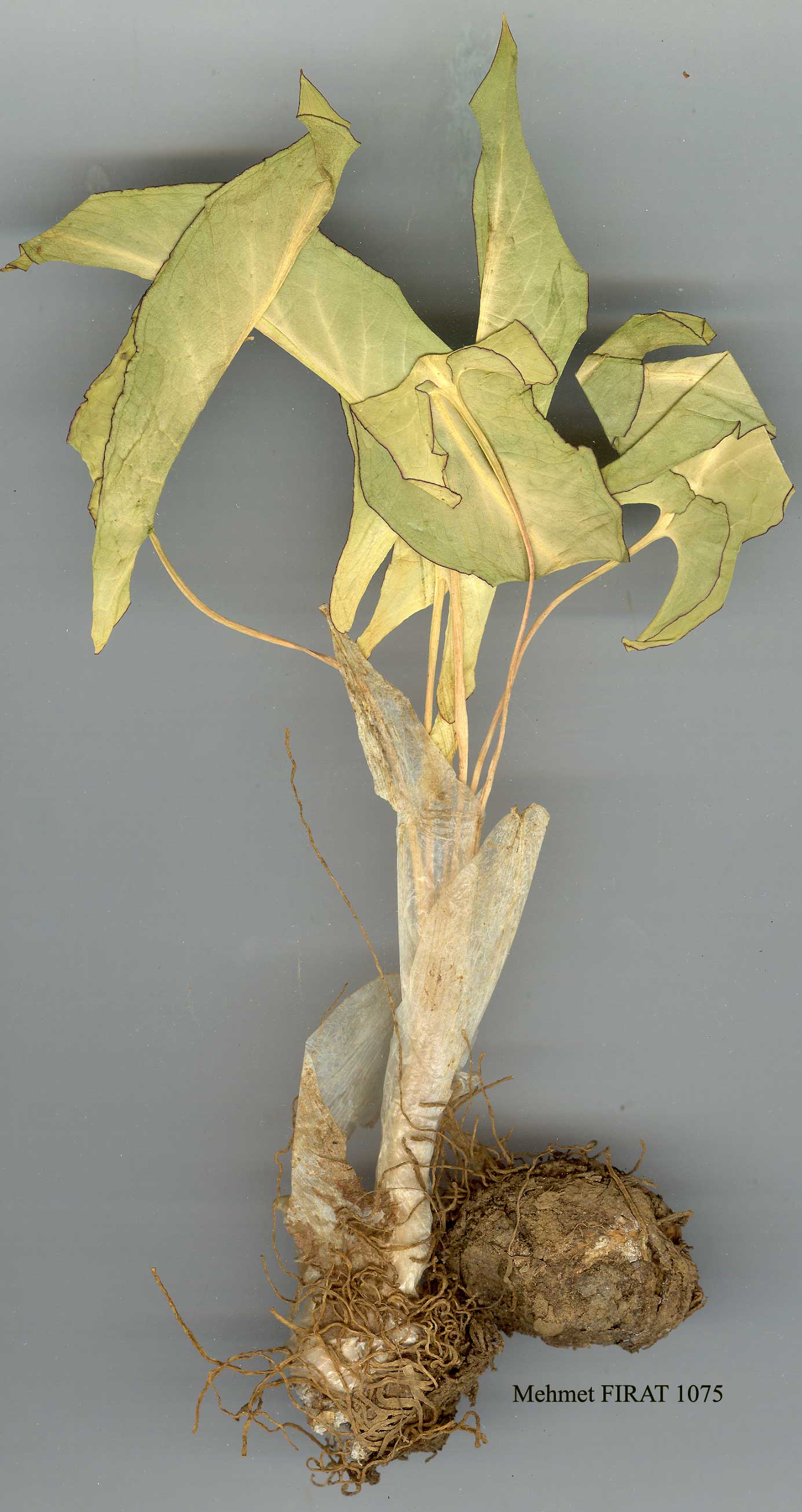 | A. detruncatum C.A. Meyer ex Schott, Prodr. Syst. Aroid. 80 (1860). [This account replaces those of A. conophalloides Kotschy ex Schott [8:50] and A. elongatum subsp. detruncatum (C.A. Meyer ex Schott) H. Riedl [8:49] in the main Flora.] Tuber vertical. Petiole of leaves (10-)l 5-45(-55) cm, uppermost with long sheath. Lamina oblong-hastate to -sagittate, 8-21(-25) x 4-16(-18.5) cm. Scape 10-60 cm. Spathe 11.5-38(-40) x l-6.5(-8) cm, narrowly lanceolate to lanceolate, green, tinged purple outside, green or rarely whitish inside (usually becoming purple within later); tube 2-6-5(-7) cm, pure white or whitish inside, without purple band. Spadix 8-24(-33) cm, (l/2-)3/5-3/4(-7/9) x spathe. Female zone (7-)10-25 mm, lower sterile zone(2-)4.5-9.5(-12)mm, male zone 3-11(-15) mm, upper sterile zone 2-6(-10) mm. Sterile filaments purple or violet, very rarely yellowish, 1.5-9 mm. Appendix shortly stipitate, 6-19(-27) cm; club 1.3-25 mm broad, violet, purple, chocolate-brown or yellowish-brown, becoming livid when old. Fl. (4-J5-7. Rocky places, steppe, roadsides, Quercus and Juniperus scrub, etc., (70-)400-2060 m. 1. Lamina of spathe greenish outside, and inside, not tinged purple (except rarely on margin); appendix of spathe yellowish-brown var. virescens 1. Lamina of spathe + purplish outside and especially inside; appendix of spadix usually purple or chocolate-brown 2. Spathe 28-38(-40) cm, broader towards middle var. caudatum 2. Spathe 11-5-30(-33) cm, broader near base var. detruncatum var. detruncatum. Syn: A. detruncatum C.A. Meyer ex Schott, Prodr. Aroid. 80 (1860); A. conophalloides Kotschy ex Schott, loc. cit. (1860)! A. rupicola Boiss. var. conophalloides (Kotschy ex Schott) Engler in DC, Mon. Phan. 2:588 (1879)! A. detruncatum var. conophalloides (Kotschy ex Schott) Boiss., Fl. Or. 5:36 (1882)! A. orientate Bieb. subsp. detruncatum (C.A. Meyer ex Schott) Engler, Pflanzenreich 73 (IV. 23F): 81 (1920); A. conophalloides Kotschy ex Schott var. typicum Engler subvar. purpureum Engler, op. cit. 76 (1920); A. elongatum Steven subsp. detruncatum (C.A. Meyer ex Schott) H. Riedl in Rech. fil., Fl. Iranica 1:5 (1963). For typification, specimen citations and external distribution, see the main Flora [8:49-50, as A. elongatum subsp. detruncatum and A. conophalloides]. Most extra-Turkish plants fall towards the 'conophalloides' end of the variation spectrum, with massive appendices. Typical 'detruncatum, with slender appendix, is not known outside Turkey apart from the type. |
