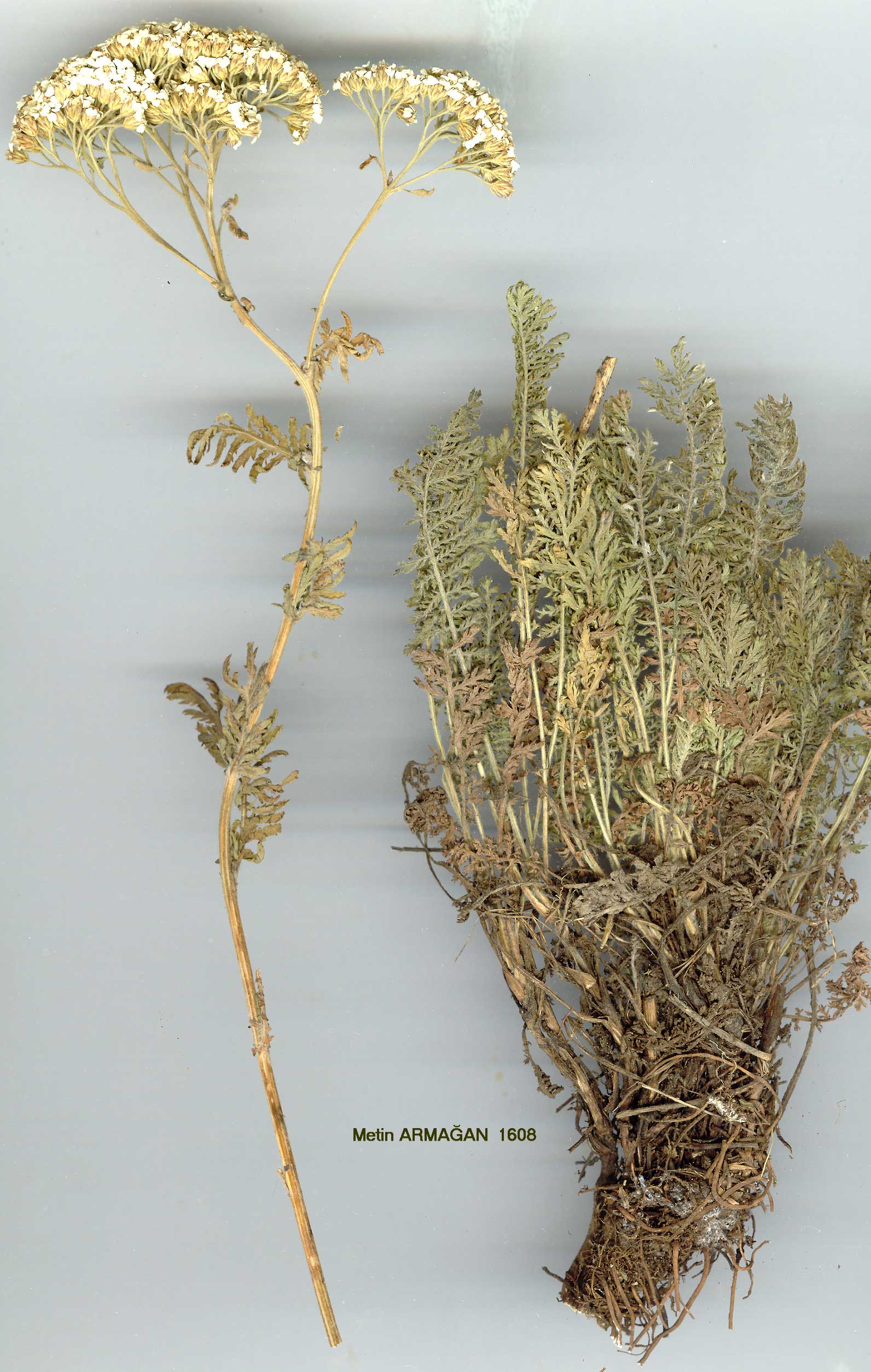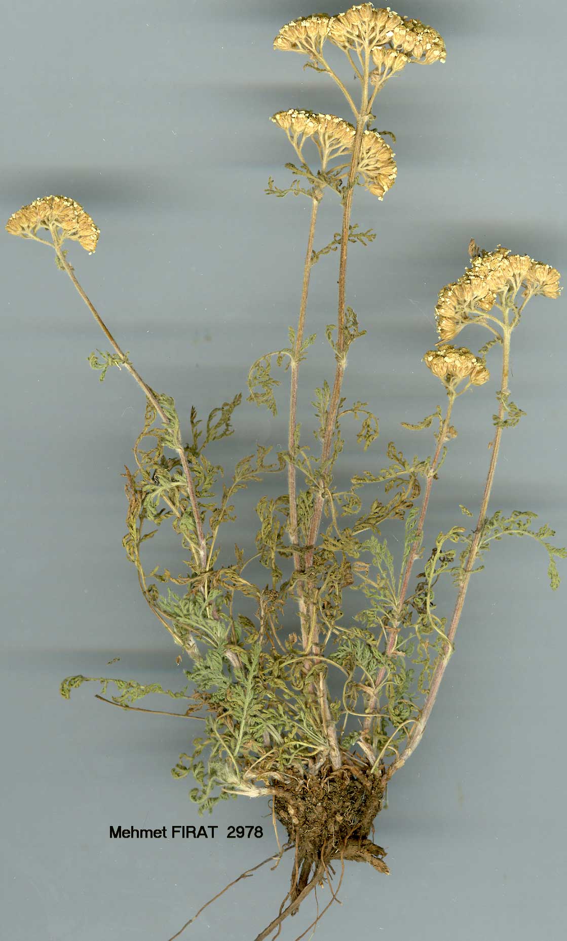 Height 12-40 cm. Rootstock with stolons. Stems terete, longitudinally striped, ± woolly-shaggy. Cauline leaves distinct from basal (leaves heteromorphic), loosely or densely woolly-villous; basal 2-3-pinnatisect, oblong-ovate, incl. petiole (1-4 cm) 3-10 x 1-3 cm, with linear-lanceolate segments, ultimate lobes acuminate, 0.5-0.7 mm broad, rachis narrow, entire or dentate; upper cauline small, oblong-ovate, 2-3 x 1-1.5 cm, mostly 1-pinnatisect, with lobes (0.3-)0.8-1.3 mm broad, rachis (0.5-)l-2 mm. Capitula 50-150 and more, corymbs 2-6 cm broad, peduncles 1-3 mm. Involucre obovoid to oblong, 3-3.5 x2-2.5 mm. Phyllaries lanceolate to lanceolate-oblong, acute to obtuse, with narrow scarious brownish margins, villous. Ligules 4-6, white, 1-2.5 mm; disc flowers 5-15. Fl. 6-8. Stony slopes, limestone rocks, alpine meadows, 1200-3000 m.