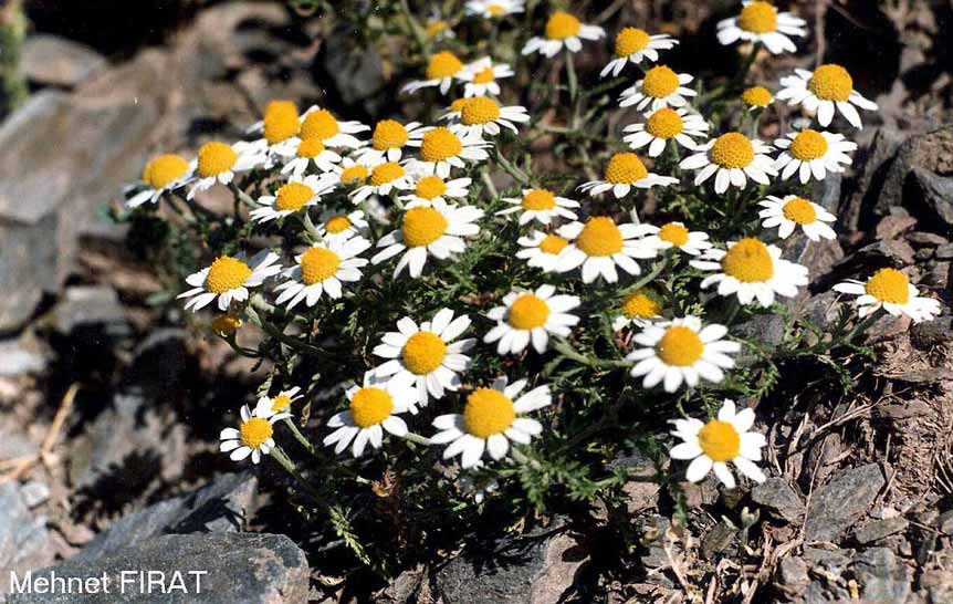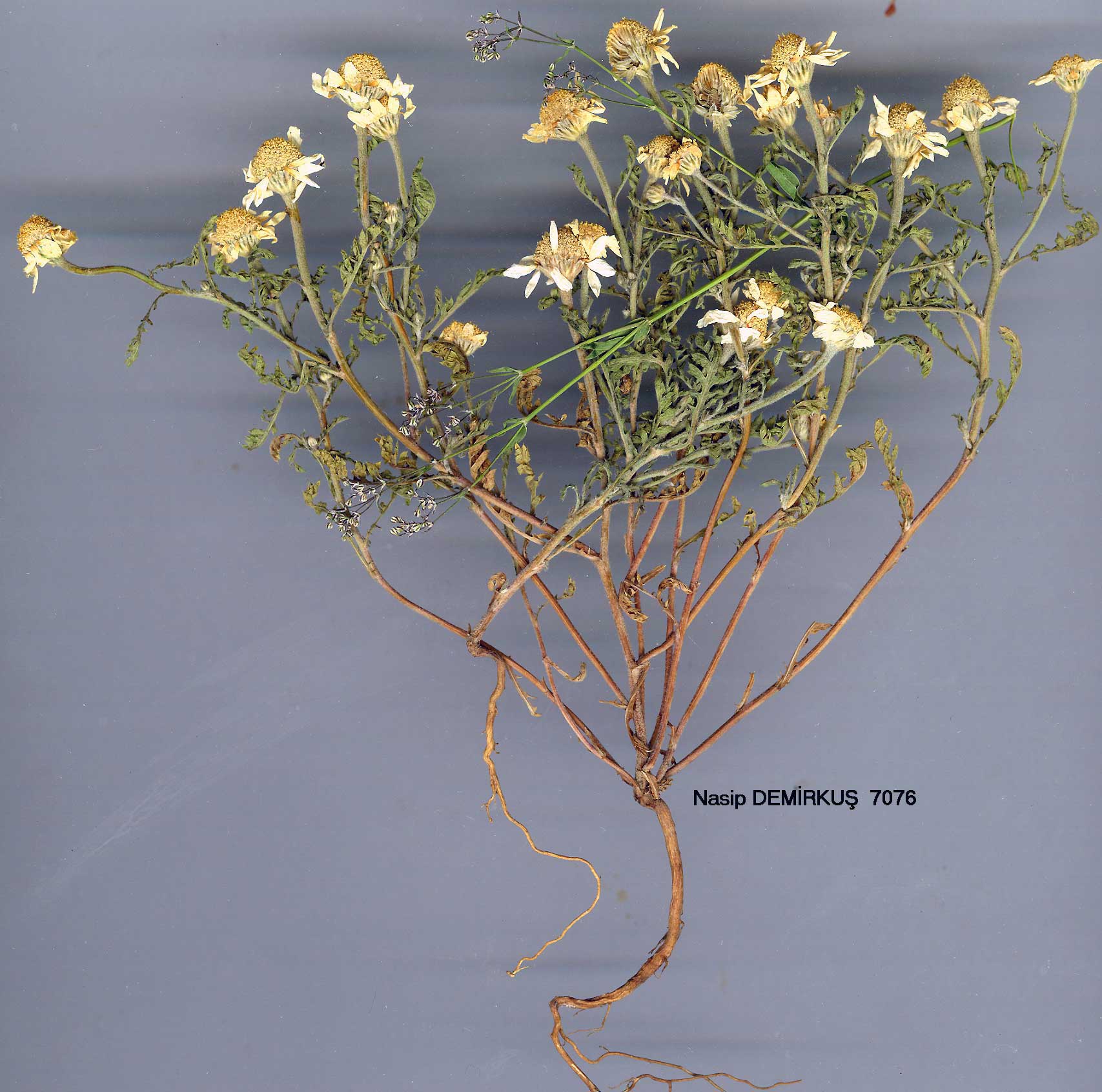 | A. wiedemanniana Fisch. & Mey. in Ind. Sem. Horti Petrop. 2:27 (1835). Syn: A. ormenoides Boiss., Diagn. ser. 1(4):6 (1844); Cota ormenoides Boiss., Diagn. ser. 2(5): 109 (1856). Figure 10, p. 183. Ascending or decumbent; greyish pubescent annual. Stems usually much branched and radiating from base, 5-20 cm. Leaves narrowly oblanceolate in outline, 1.5-3 cm, ± l-pinnatisect, segments oblong, 2-5 x 0.75-1.5 mm, simpleor margins sharply serrate. Capitula radiate; peduncles becoming thickened. Involucre 0.5-0.75 cm broad; outer phyllaries ovate-acuminate, inner oblong, narrowly scarious at apex. Receptacle conical; paleae ovate-oblong, shortly acuminate. Ray flowers 10-15, sterile; ligules 0.5-0.75 cm. Disc corollas c. 2.5 mm, not becoming inflated at base. Achenes cuneate, compressed, c. 1.5 mm, dark brown, almost smooth, unribbed; apex truncate, ecoronate. Fl. 5-6. Lime-stone slopes and steppe, 400-1800 m. Type: [Turkey] in Natolia, Wiedemann (LE?). W., S. & Inner Anatolia, Islands. A4 Ankara: Hacikadin valley nr Keçiören, D. 18803! A5 Amasya: Siaret, 400 m, Bornm. 1890:3109! Bl Izmir: Yamanlar Da., 700-900 m, Bornm. 1906:9649! B2 Uşak: c. 6 km S. of Uşak, 800 m, Coode & Jones 2399! B3 Eskişehir: between Söğüt and Eskişehir, 2 km from Oluklu, 950 m, Hub.-Mor. 12373! B4 Konya: 30 km N. of Konya, 1300 m, Sorger 66-40-25! B5 Nevşehir: Ürgüp, 1100 m, Sorger 71-56-1! B6 Malatya: 35 km S.E. of Darende, 1700 m, Sorger 71-47-2! B7 Elazığ: Kharput (Harput), Sint. 1889: 605! B9 Van: 20 km from Timar to Van, 1800 m, D. 44218! C2 Antalya: Elmali, Bourgeau 1860:163! C3 Isparta: Kurutepe, 1300 m, Sorger 67-4-38! C4 Konya: 18 km from Konya to Sarayönü, 950 m, Hub.-Mor. 14597! C8 Mardin: nr Khanaki, Sint. 1888:739! Is: Lesvos, Lepitymnos above Ypsilo-metopon, 500 m, Rech. 5786b. Endemic. A very distinct species which appears to be without close relatives. It agrees with A. pestalozzae in its small size and conical receptacle, but is unlike that species in the dissection of its leaves (which rather approaches A. tinctoria) and in its unribbed, ecoronate achenes. |
