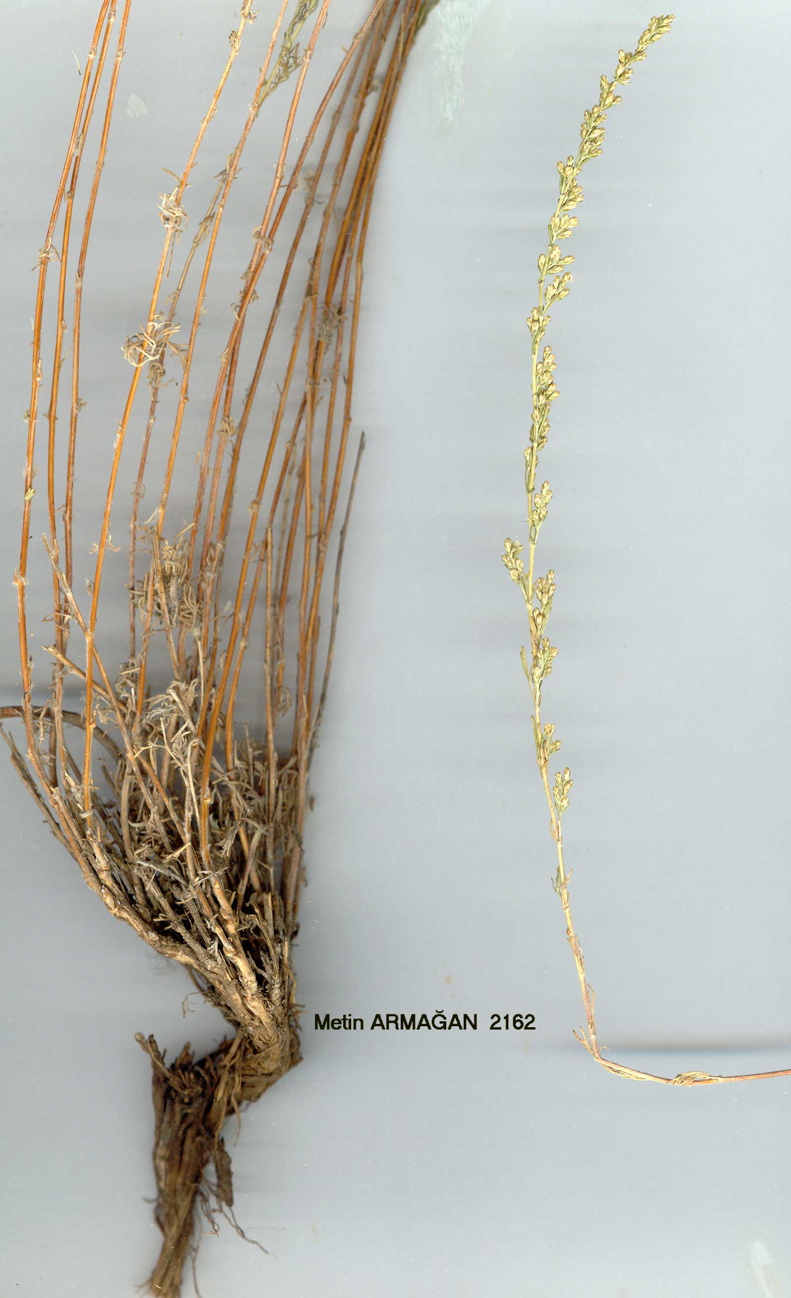 | A. spicigera C.Koch in Linnaea 24:345 (1841). Syn: A. macra Boiss. & Hausskn. in Boiss., Fl. Or. 3:364 (1875)! Figure 15, p. 315. Map 29, p. 321. Like A. santonicum but stock stout, woody, rosettes often present at flowering, leaves not strongly canescent, segments less crowded, inflorescence branches short, strict, adpressed to or curved upwards towards main axis, capitula usually erect, rarely somewhat nodding, bracts simple. Fl. 6-9. Dry slopes, steppe, rarely in salty areas, 300-2000 m. Type: [Turkey A9 Kars] Gaue Kaghysman, auf Trachyt, c. 1500 m hoch, C.Koch. Inner Anatolia. A3 Ankara: Beypazarı, 1000 m, Uluscak (ISTO 1099)! A4 Ankara: Çubuk Baraj, 1000 m, Markgraf! A5 Sinop, Boyabat, 300 m, D. 25024! A8 Erzurum: 5 km from Tortum, 1550 m, Buttler 16054! A9 Erzurum: E. of Horasan, 1600 m, D. 32619! B4 Konya: Tuz G., Rech. 15260! B6 Maraş: Elbistan, Soisalle, Hausskn. (type of A. macra)! B7 Erzincan: road from Erzincan to Çobanli, 1610 m, Buttler 15711! B9 Bitlis: between Tatvan and Erciş, 1720 m, Buttler 15986! B10 Ağri: Doğubayazit, 2000 m, Rech. 14978! C9 Hakkari: Çölemerik, 1600 m, D. 24351! Soviet Armenia. Ir.-Tur. element. More or less replacing A. santonicum as asteppe dominant east of 36°E, though with a broad zone of overlap. Some specimens are like A. spicigera overall, but have the spreading panicles of A. santonicum: B4 Konya: Acituzgölü, nr Kirkişla, 900 m, D. 16639!; B6 Sivas: 3 km E. of Bulakbaşi Köyü on road to Zara, 1300 m, Buttler 15629! A similar specimen occurs from much further east: B10 Ağri, 7 km N. of Doğubayazit, 1510 m, Butter 14431! The status of-these intermediates requires further investi-gation. A. macra Boiss. & Hausskn. is a small, rigid-leaved variant. |
