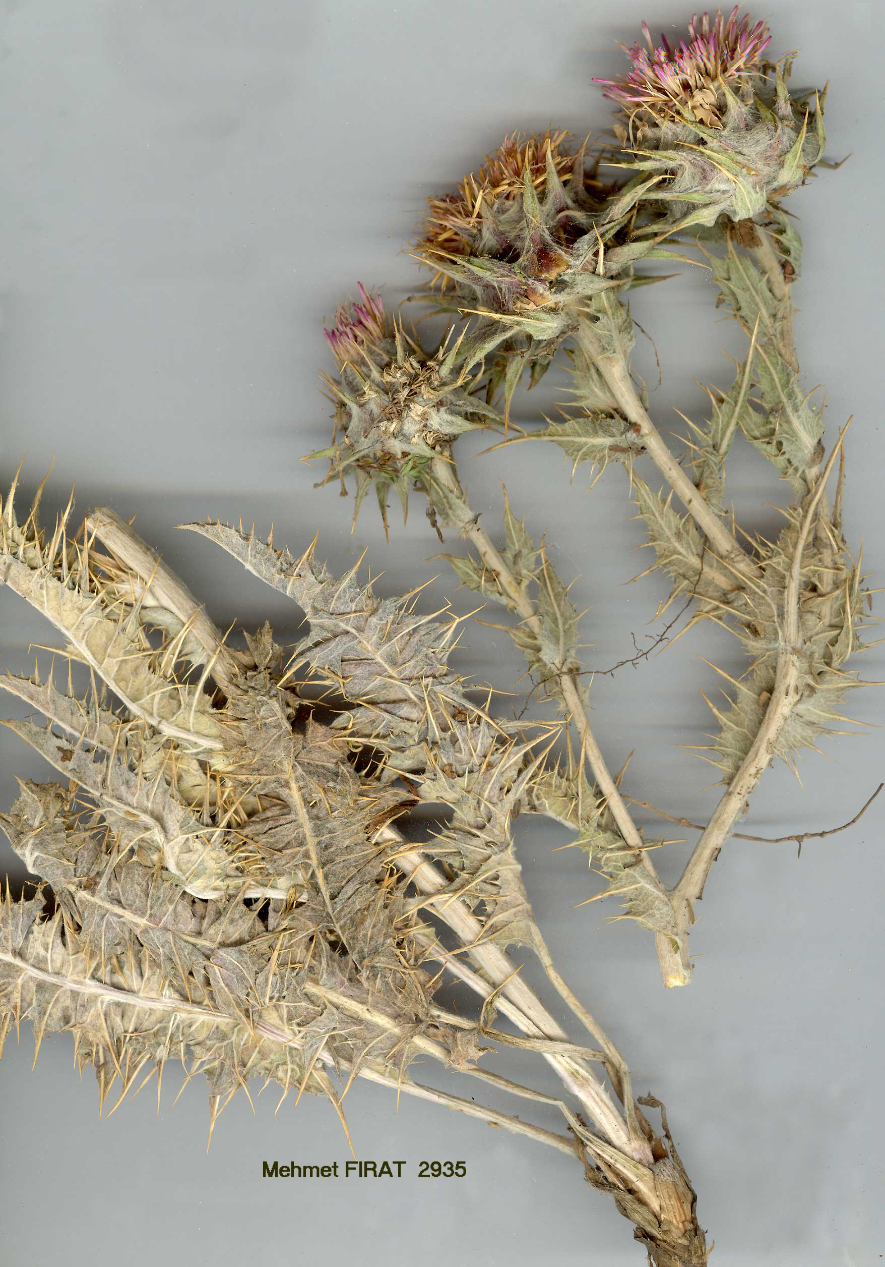 | C. lanuginosus Willd., Sp. PL 3:1648 (1803). Syn: Onopordon acanthifolium C.Koch in Linnaea 24:390 (1851); ? Carduus pannosus Trautv. in Acta Horti Petrop. 3(2): 271 (1875); C. lanuginosus Willd. subsp. kotschyi Kazmi in Mitt. Bot. Staatssamml. München 5:350 (1964)! Ic: Kazmi, op. cit. 506, f. 11, 12. Map 45, p. 433. Perennial, 20-50 cm. Stems (like leaves) densely adpressed white-tomentose, leafy throughout, sinuate-winged with triangular spiny-margined lobes, corym-bosely few-headed. Cauline leaves pinnatifid to ½-¾, equally tomentose on both surfaces, primary segments 3-4-fid into triangular or lanceolate, ± stoutly spine-tipped lobes (spines 2-10 mm). Capitula solitary on ± short, unarmed or spinu-lose peduncles. Involucre densely arachnoid, depressed-globose, 20-30 mm long (incl. spines); phyllaries lax, median ovate-lanceolate, prominently 1-nerved, patent and attenuate into a long subulate spine. Corollas zygomorphic, pink, 19-22 mm. Achenes 4-5 mm; pappus c. 20 mm. Fl. 7-8. Rocky limestone slopes. screes, eroded places and wash-outs, 2250-3100 m. Described from 'Armenia'. N.E., E. & S. Anatolia. A7 Giresun: Balabandağlari above Tamdere, 2300-2800 m, D. 20511! Gümüşane: Karagöl Da., Sitit. 1894:7166! A9 Kars: Killik Da., W. of Akçay to Cumaçay road, 2250-2500 m, Watson et al. 3426! B7 Tunceli: Munzur Da. above Ovacik, 2800 m, D. 31276! B8 Erzurum: Palandöken Da., 2350-2560 m, Battler 16132! C5 Niğde: d. Ulukişla, Bulgar Da. nr Sari Tepe Y., 2700 m, D. 16581! Ala Da., 3100 m, Ellenberg 266, 343. Içel/Niğde: Bulghar Da., nr Koschan G., 2590 m, Kotschy 300, 331 (syntypes of subsp. kotschyi)! Endemic. Confined to open mountain habitats. The only very distinct species of Carduus in Turkey, readily distinguished by its pannose indumentum. C. pannosus Trautv. (described from B8 Erzurum: Palandöken Da.) is probably a short-spined form of this species. |