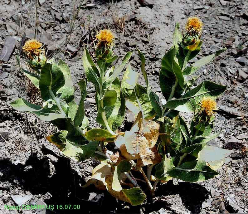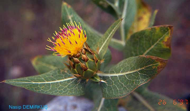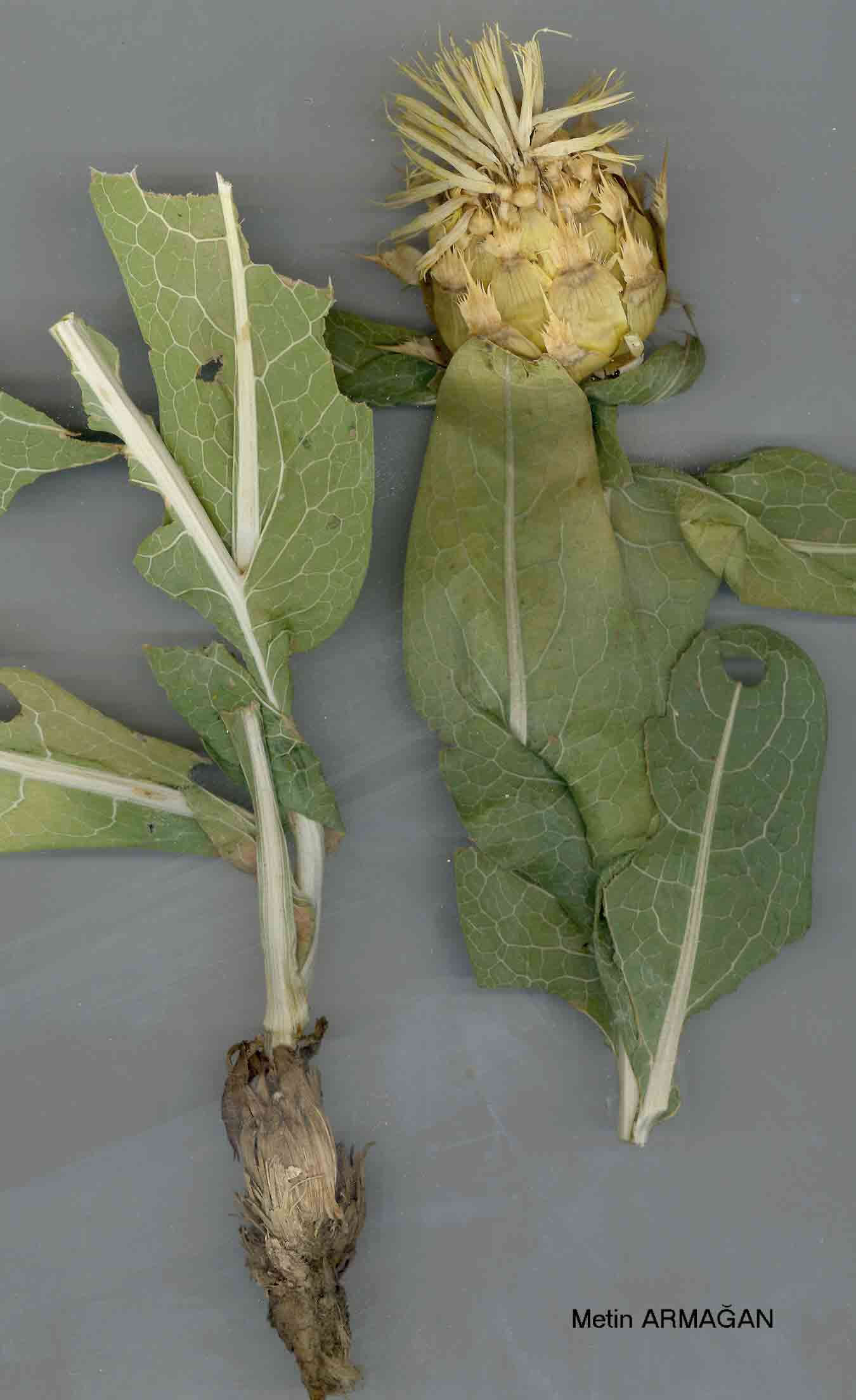 | C. albonitens Turrill in Kew Bull. 1930:427 (1930). Syn: Amberboa cartha-moides DC, Prodr. 6:561 (1838)! Phaeopappus carthamoides (DC.) Boiss., Diagn. ser. 1(6): 125 (1845)! Centaurea carthamoides (DC.) Schultz Bip. in Linnaea 19:326 (1847)! non C. carthamoides Chevall. (1827); Tomanthea carthamoides (DC.) Takht. in Trudy Molod. Nauchn. Rabotn. Armyan. Fil. AN SSSR 1939:243 (1939)! Ic: Bot. Jahrb. 82:176 & t. 17 (1963). Perennial, stem 23-31 cm, erect, simple, nearly glabrous and conspicuously ivory-white. Leaves very firm with prominent veins, petiole and mid-nerve white; basal and lower nearly orbicular to oval or broadly lanceolate, petiolate, median and upper lanceolate, decurrent. Involucre 25-35 x 23-40 mm. Appendages only partly concealing basal part of phyllaries, firm, brown, triangular or mostly rectangular in lower part, upper part with 4-6 pairs of cilia directed towards apex and a central spinule 4-7 mm, sometimes appendage only dentate. Flowers yellow. Achenes 6 mm; pappus 10-14 mm (inner row longest). Fl. 7-8. Steppe, dry stony slopes, 1640-2400 m. Type: [Iran] Plain west of Tabriz, 23 vi 1929, Gilliat-Smith 2568 (holo. K!). S.E. Anatolia. B9 Muş: 23 km from Patnos to Malazgirt, 1640 m, Hub.-Mor. 10861! Van: 34 km from Gürpinar to Hoşap, 2150 m, D. 45961! N.W. & W. Iran. A very characteristic Irano-Turanian species, which cannot be confused with any other. The only species showing a close relationship is C. heratensis Rech. fil. from Afghanistan. |