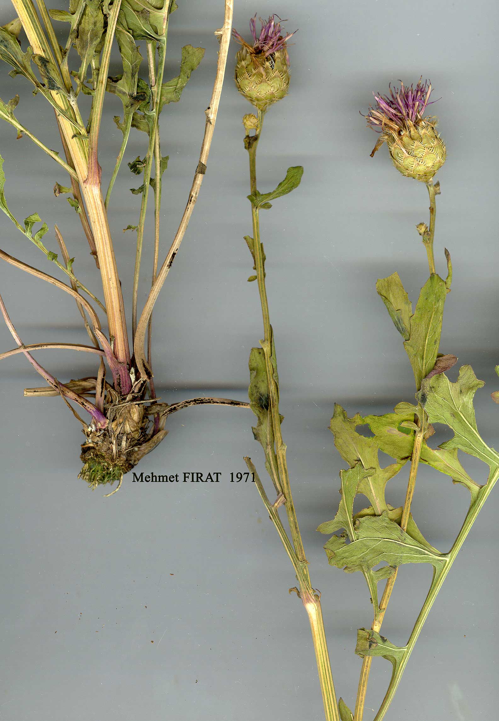 | C. pseudoscabiosa Boiss. & Buhse in Nouv. Mém. Soc. Nat. Mosc. 12:131 (1860). Perennial, 15-90 cm, stem erect, simple or with few branches, hispid or slightly tomentose to subglabrous. Basal and lower leaves usually lyrate with 1-3 pairs of lanceolate lateral segments and a much larger terminal segment or more rarely lanceolate, undivided or like median leaves pinnatisect to pinnatifid with 2-4 pairs of lateral segments, segments entire or (especially terminal) dentate. Involucre (17-)20-28 x 14-25 mm, oblong-ovoid to subglobose. Appendages covering only part of phyllaries, dark brown, triangular with a decurrent ciliate margin and a short, 1-5 mm, terminal spine. Flowers purple, marginal scarcely radiant. Achenes 5-6(-7) mm; pappus -10(-11) mm, inner row (l.5-)2-3 mm. 1. Appendages very small, cilia only 1.5-2(-3) mm; involucre usually only 15-17 mm broad subsp. araratica 1. Appendages larger, cilia (2-)3-5 mm; involucre usually broader 2. Plant usually over 40 cm, branched in upper part subsp. pseudoscabiosa 2. Plant usually up to 35 cm, unbranched or branched from near base subsp. glehnii subsp. araratica (Azn.) Wagenitz in Willdenowia 6:501 (1972). Syn: C. araratica Azn. in Mag. Bot. Lap. 17:15 (1918)! Colymbada araratica (Azn.) Holub in Preslia 45:143 (1973)! Fl. 7-8. Steppe, fields, 1400-2800 m. Type: [Turkey B1O Kars] entre Aralykh (Aralik) et Takalty, 10 vii 1910, B. V. D.Post 2030 (holo. G!). E. Anatolia. A9 Erzurum: Horasan, 1600 m, D. 32628! B8 Erzurum: S. of Aşkale, 1900 m, Hub.-Mor. 15889! Muş: S. foot of Bingöl mts., 1500 m, Kotschy 1859:302! B9 Muş: 30 km from Patnos to Muş, 5 km E, of Malazgirt, 1670 m, Buttler 16008! Erzurum: Ağri to Horasan, 2150 m, Lamond 2567! Bitlis: Nemrut Da., B.Post 675! 2400 m, McNeill 558! Ağri: Ağri to Horasan, 2000-2500 m, Rech. 32800! B/C9 Van: Ispiriz Da., 2800 m, D. 23745! B10 Kars: Iğdir, Ağri Da., 1550 m, Demiriz 3332! Ağri: Iğdir to Doğubayazit arasi, 2000 m, Baytop 4844! Distribution of species: Transcaucasia, N.W. Iran. Ir.-Tur. element. Related to the C. scabiosa group. (Records of 'C. scabiosa L.' from Turkey belong to this species.) The delimitation of the subspecies is not easy and they show no clear geographical or ecological distribution pattern. Sect. Aegialophila (Boiss. & Heldr.) O.Hoffm. Perennials with very short stem and few medium-sized capitula. Leaves lyrate or undivided. Involucre ovoid. Appendage a decurrent entire membranous border ± dilated above and ending in a spinule. Flowers pink, marginal slightly radiant. Achenes medium-sized, densely hairy; pappus easily deciduous, barbellate to plumose, inner row short. |