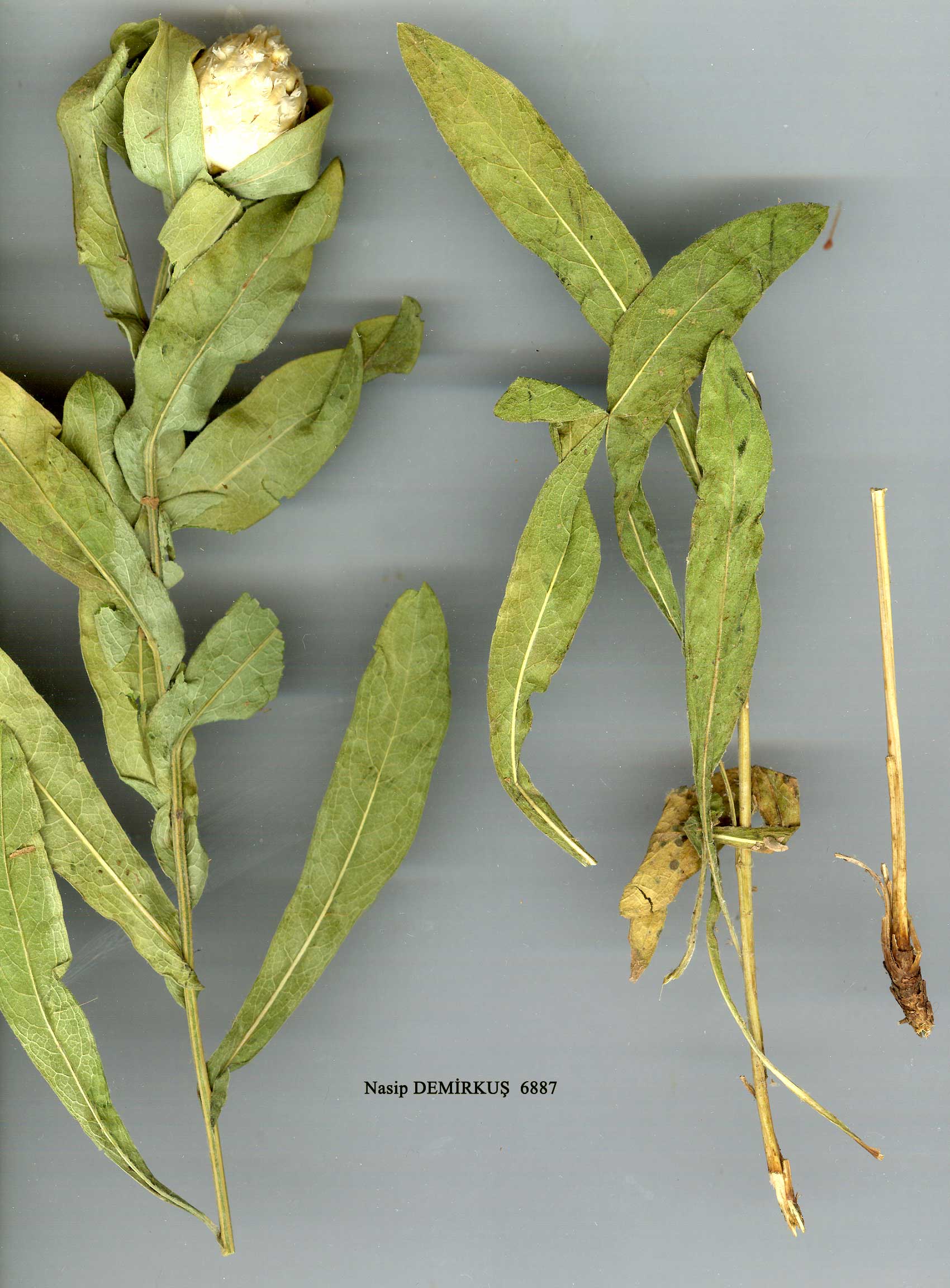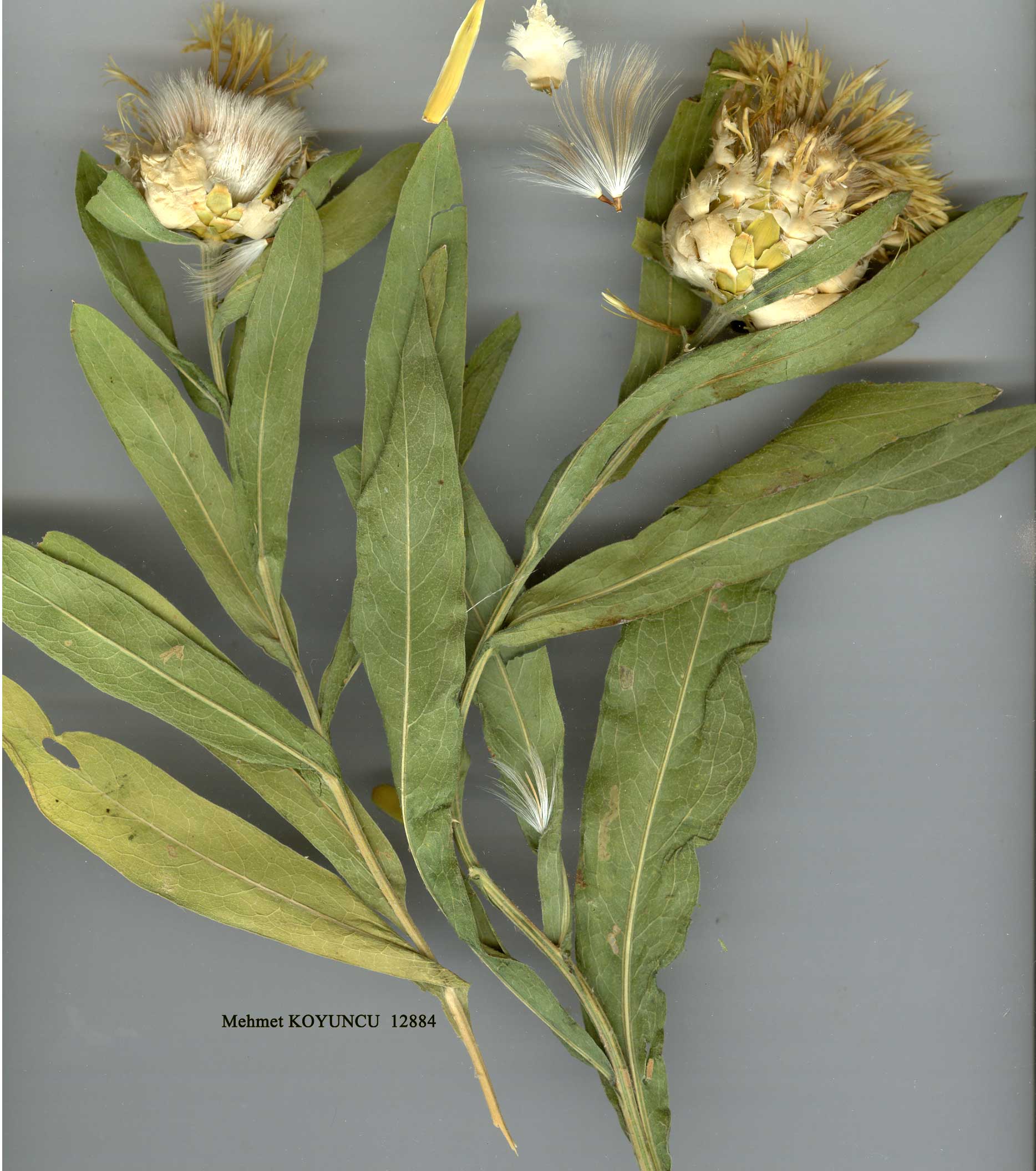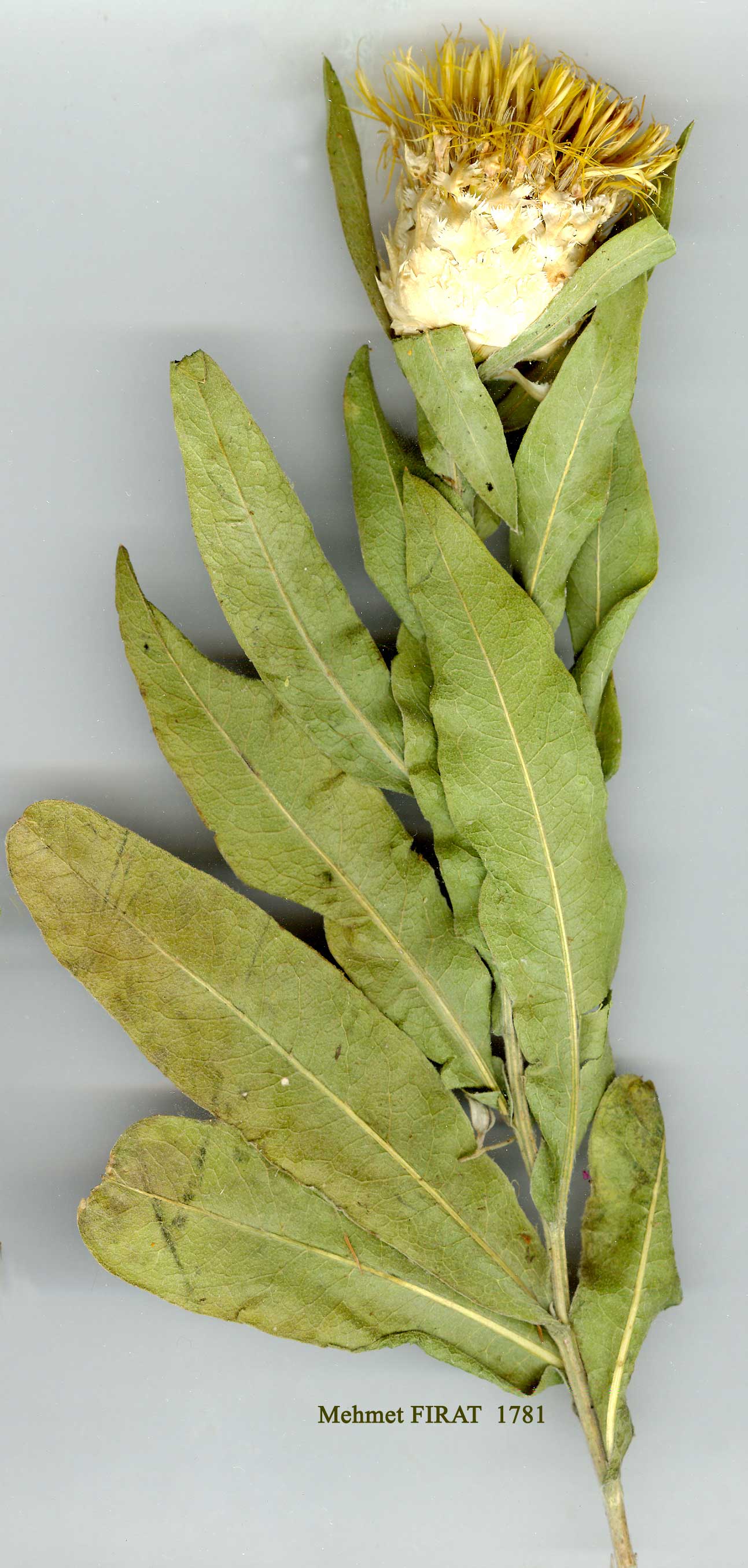 | C. saligna (C.Koch) Wagenitz in Bot. Jahrb. 82:172 (1963). Syn: Chartolepis saligna C.Koch in Linnaea 24:421 (1851); Centaurea schizolepis Trautv. in acta Horti Petrop. 2:553 (1873); Phaeopappus salignus (C.Koch) Boiss., Fl. Or. 3:596(1875). Perennial, stems 20-70 cm, erect or slightly bent at base, simple or with several one-headed branches. Leaves firm, scabrous with septate hairs, nerves elevated; lower leaves lanceolate, narrowed into a short petiole, median and upper oblong-lanceolate (rarely linear-lanceolate), sessile with half-clasping base or shortly decurrent, uppermost ± enveloping capitula. Involucre 28-30 x 25-35 mm, nearly globose. Appendages very large, totally concealing basal parts of phyllaries, strawy, irregularly lacerate to ciliate, ending in a short 1-4 mm mucro. Flowers yellow, marginal not radiant. Achenes 6-8 mm; pappus (16-)20-25(-28) mm, plumose. Fl. 7-8. Steppe, rocky slopes, 1400-2000 m. Type: [Turkey B9 Erzurum] im Gaue Gökssu auf Kalk und Trachyt, c. 1830 m, C.Koch (destroyed in B). E. Anatolia. B6 Maraş: Şar Da. nr Elbistan, 14 viii 1865, Hausskn.! B7 Elaziğ: above Gölcik at Gölcik G., 1450 m, Hand.-Mazz. 2617! B8 Muş: d. Varto, nr Ketsian, 1500 m, Kotschy 1859:319! Bingöl/Muş: between Zyaret Tschengli and Boglan, 1400 m, Kotschy 1859:499 (differing by the very narrow leaves and the short pappus)! B9 Van: 5 km W. of Gevaş, by Van G., 1670-1700 m, Hub.-Mor. 11733! C9 Hakkari: Cilo Da., Diz De., 1600 m, D. 23920! C10 Hakkari: 26 km from Yüksekova to Şemdinli, 2000 m, D. 45124! Endemic. Ir.-Tur. element. A very distinct and isolated species. There is an interesting similarity with the S.W. Anatolian C. ensiformis, but the pappus is different. Sect. Rhizocalathium Tzvelev (Sect. Acrocentron § Rhizanihae Boiss. pro parte). Perennials, stem very short, simple or branched, capitula medium-sized. Leaves Iyrate or pinnatipartite or sometimes undivided, ± densely hirsute with multi-cellular hairs. Involucre ovoid to subglobose. Appendages very variable: a simple mucro or spinule or triangular to ovate and ciliate, not decurrent or very slightly so, often easily deciduous. Flowers yellow, marginal not radiant. Achenes medium-sized; pappus scabrous, short. |