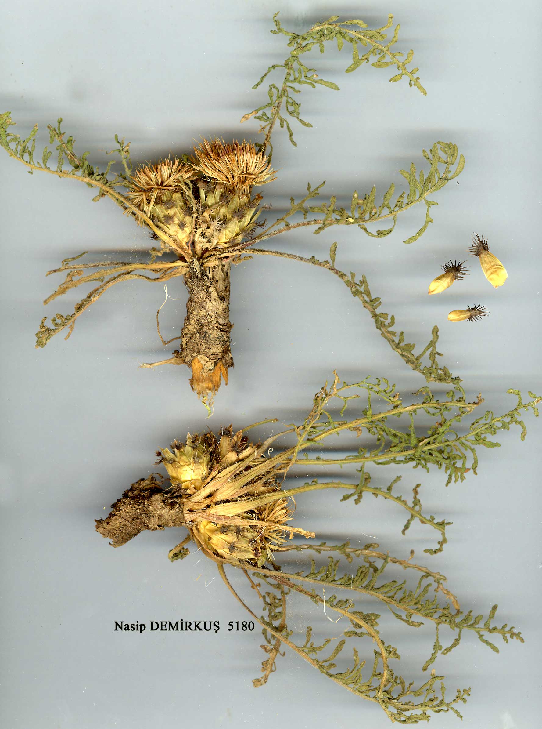 | C. vanensis Wagenitz in Notes R.B.G. Edinb. 33:223 (1974). Perennial, capitulum solitary, sessile or nearly sessile (on stem up to 1.5 cm) in a rosette of leaves. Leaves hirsute with septate hairs, petiolate, pinnatipartite with numerous larger and smaller segments, larger pinnatipartite or pinnati-lobate, ultimate segments linear, c. 2 mm broad, mostly with undulate margins. Involucre 20-22 x 20-28 mm, nearly globose. Appendages rather large, but concealing only part of the greenish phyllaries, dark brown or blackish, broadly triangular, sometimes slightly decurrent, palmately cilate, cilia (4-)6-ll on each side, 3-5 mm, terminal scarcely longer. Flowers creamy white. Achenes 4-4.5 mm; pappus 1.5-2.5 mm. Fl. 5-6. Stony slopes, steppe, 1750-2750 m. Type: Turkey B9 Van: 20 km from Hoşap to Başkale, 2750 m, S.W. stony slope N. of pass, 9 vi 1966, Davis 44632 (holo. GOET! iso. E! K!). S.E. Anatolia. B9 Van: Van, Noé 130! ibid., vi 1912, Kulzer! BIO Van: 6 km from Özalp to Saray, 2250 m, D. 44289! N.W. Iran. Ir.-Tur. element. Most closely related to C. ustulata DC. from N.W. and N. Iran and Transcaucasia but apparently quite distinct. Some of the records for C. ustulata cited by Boissier belong to this species. Sect. Grossheimia (Sosn. & Takht.) M.Dittrich (Syn: Sect. Jacea DC. § Macrocephalae Boiss.). Perennials with erect stout simple or sparingly branched stems and large to very large capitula. Leaves undivided, broadly lanceolate, upper sometimes shortly decurrent, uppermost enveloping capitula. Involucre hemispherical to subglobose. Appendages very variable but never decurrent or truly spiny (spinulose in C. helenioides). Flowers yellow, marginal not radiant or only slightly so. Achenes large; pappus about as long as achenes, scabrous; inner row short. |