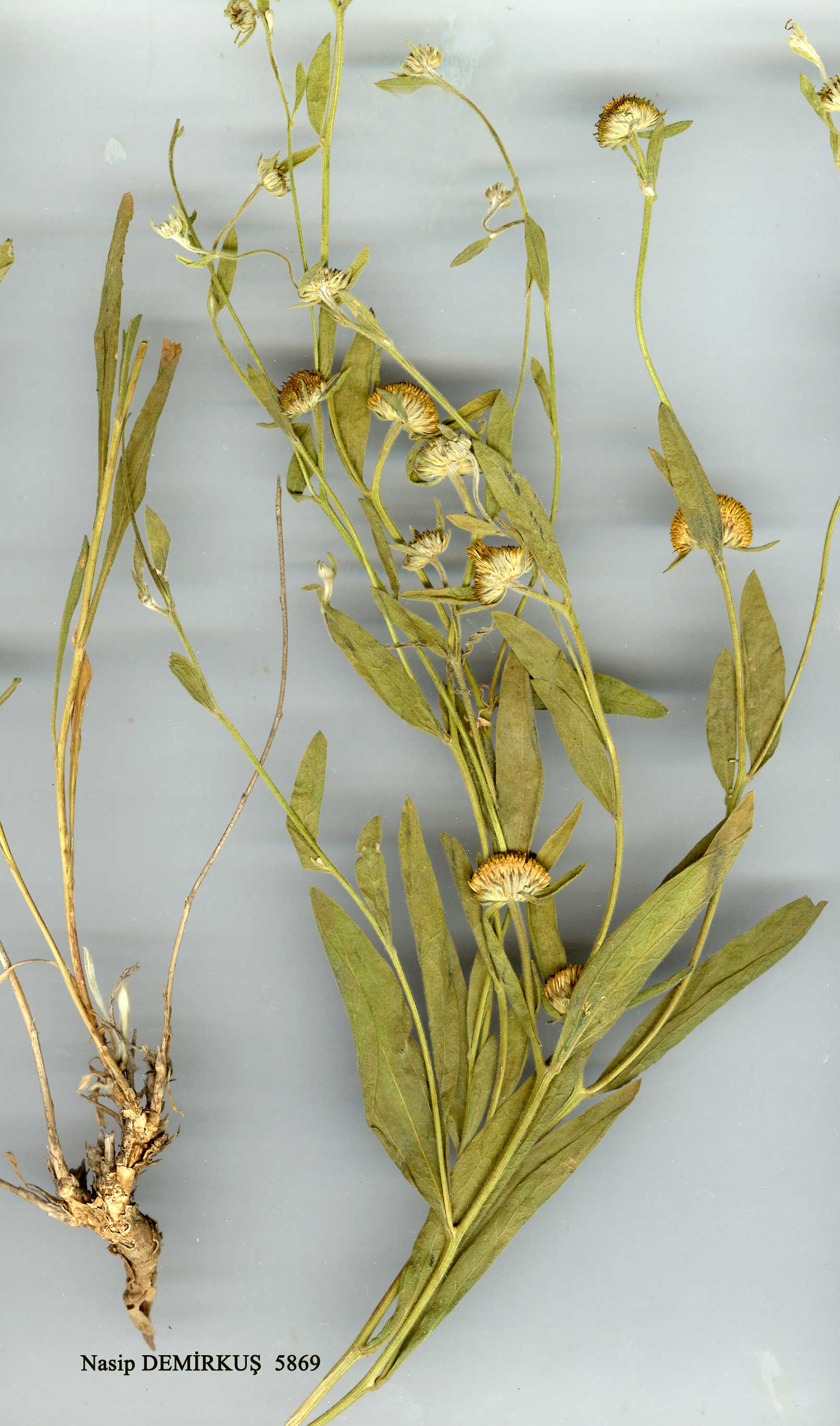 | C. montanum (DC.) Boiss., Diagn. ser. 1(11):4 (1849). Syn: Cemana montana DC, Prodr. 7:287 (1838); Chrysophthalmum sternutatorium Schultz Bip. ex Boiss., Fl. Or. 3:182 (1875) pro syn. Map 3, p. 59. Stems erect, 20-40 cm, ± densely and silkily pubescent. Leaves elliptic or oblanceolate, 4-10 x 0∙4-1∙8 cm, acute, attenuate, subpetiolate at base, margins entire, ± prominently veined, minutely glandular and, particularly young basal leaves, densely sericeous. Involucre 0∙75-1 cm broad. Phyllaries linear-lanceolate, 3-4∙5x0∙ 75-1 cm, adpressed-pubescent and glandular. Paleae linear, c. 4 x 0∙25 mm. Female flowers few, corollas c. 4 mm; corollas of hermaphrodite flowers 4∙5-5 mm. Achenes 2 mm, dark brown, glabrous, rather glossy. Pappus white, c. 0∙4 mm. Fl. 7-9. In rock crevices and limestone cliffs, 750-2200 m. Type: [Turkey C6 Gaziantep] circa Aintab (Gaziantep), Aucher 3228 (iso. K! BM!). S. & E. Anatolia. B6 Malatya: d. Doğanşehir, Eskiköy, 1900-2000 m, Peşmen 2290! Maraş: Elbistan, 1400 m, D. 20437b! B7 Erzincan: Egin (Kemaliye), Kemergoep (Gemergop), Sint. 1890:2597! B9 Van: Artos Da. above Gevaş, 2135 m, D. 22691! C5 Niğde: E. of Maden, 1524 m, Darrah 494! Adana: Feke between Süphandere and Belanköy, 900 m, D. 19545! C6 Adana: Düldül (nr Haruniye), 1525-2135 m, Haradj. 2333! Maraş: Akher Da. (Ahir Da.), 1830-2135 m, Haradj. 1636! C6/7 Malatya: 74 km S.W. of Malatya, 1550 m, Sorger 71-45-9! C8 Siirt: Mar Goria, 750 m, Nábêlek 3918; Mardin: Deir Zafran, Sint. 1888:1091! C9 Mardin: Hessana, at S. foot of Cudi Da., 900 m, D. 42771! N. Iraq. Ir.-Tur. element. |