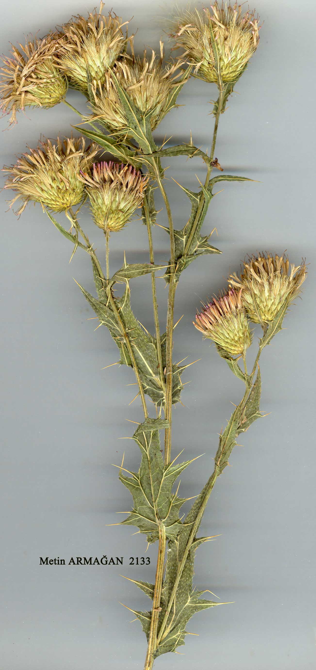 | C. aduncum Fisch. & Mey. ex DC, Prodr. 6:636 (1838). subsp. bashkalense Davis & Parris in Notes R.B.G. Edinb. 33:414 (1975). Many-stemmed perennial, 100-150 cm. Stems branched, unwinged, glabrescent or sparsely arachnoid. Median cauline leaves oblong, pinnatisect, lateral lobes unequally bifid, c. 4-5-paired, triangular to long-triangular, lateral and terminal lobes with 4-10 mm apical spine, sparsely spinose-strigose above, setae c. 5 per 2 mm square, 0.2-2.2 mm, otherwise glabrous or very sparsely arachnoid; glabrous below or very sparsely arachnoid. Lateral branches short, c. 5-11, with many-capitulate racemes or racemose panicles, uppermost leaves 2-4, usually shorter than involucre, rarely equal to or longer than it, involucrate. Involucres erect, obconical-cylindrical to obconical-obovoid, 10-15 mm. Phyllaries arach-noid, c. 8-seriate; median 7-12 mm incl. ± erect to reflexed 0.5-1.3 x 0.1-0.15 mmapical spine. Corollas pink, 16-17 mm. Achenes 4.5-5.0 mm. Pappus 11-14.5 mm. Fl. 8. Steppe, fields and hillsides, 2200-2500 m. Type: Turkey B9 Van: 10 km N.W. of Başkale, 2500 m, 18 viii 1954, Davis 24520 (holo. E! iso. BM!). S.E. Anatolia. B9 Van: between Hoşap and W. foot of Keper Da., 2200 m, D. 24528! Endemic? Differs from subsp. oduncum (Caucasus, Transcaucasia, N.W. Iran, N. Iraq) in having involucres with obconical rather than rounded base. However, an illustration in Fl. URS S (28: t. 5 f. 1, 1963) closely matches subsp. bashkalense in involucre shape. |