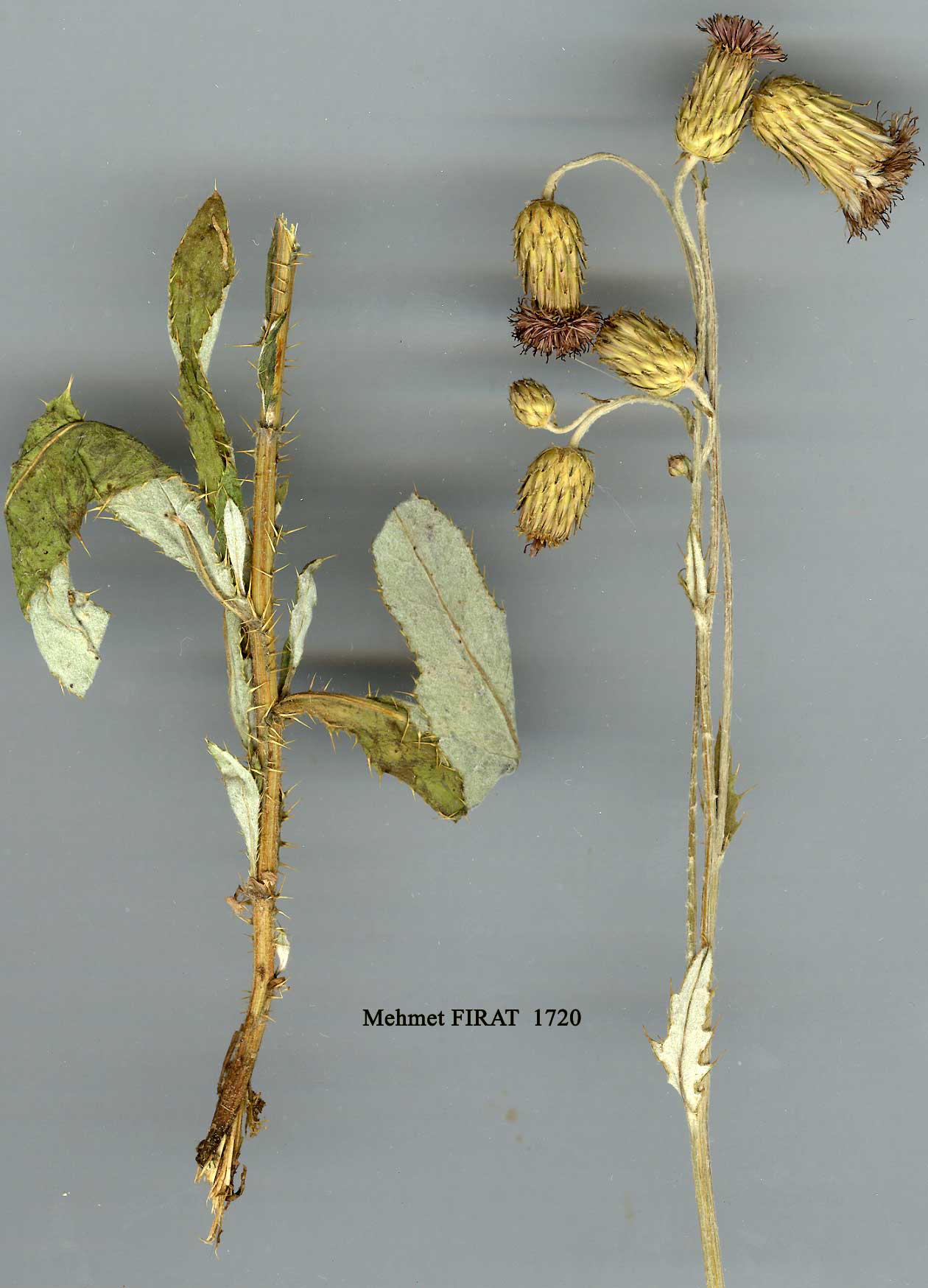 | C. arvense (L.) Scop., Fl. Carn. ed. 2, 2:126 (1772). Many-stemmed, dioecious perennial, 20-100 cm, with adventitious shoots from deep wide-creeping roots. Stems unwinged, usually branched, glabrous to floccose-arachnoid. Median cauline leaves sometimes shortly decurrent, ovate to oblong, entire to pinnatisect, with weak marginal spines 1-5 mm, without setae on upper surface, glabrous to sparsely floccose-arachnoid above; glabrous to tomentose below. Involucral leaves absent. Involucres obovoid-hemispherical, solitary to c. 11 on each branch; erect, 10-25 mm. Phyllaries -9-seriate, sparsely arachnoid, with prominent vitta; median 4-10 mm incl. 0.5x0.1 mm apical spine. Corollas light purple, 14-20 mm. Achenes 2.5-3.5 mm. Pappus 21-35 mm. Fl. (5-)6-9(-J0). Roadsides, riverbanks, ditches, pastures, cultivated land, wheat and cornfields, tea plantations, steppe, Quercus infectoria-Q. castanea (sic) wood, 15-2500 m. 1. Leaves ± glabrous above and below subsp. arvense 1. Leaves tomentose below, usually sparsely arachnoid above subsp. vestitum subsp. vestitum (Wimmer & Grab.) Petrak, in schedis (1913). Syn: Serratula incana Gmelin, Reise Russl. 1:155 (1770); S. ciliata Bieb., Fl. Taur.-Cauc. 2:267 (1808); Cirsium incanum (Gmelin) Fisch. ex Bieb., Fl. Taur.-Cauc. 3:561 (1819); Charadze in Fl. URSS 28:211 (1963); C. arvense var. vestitum Wimmer & Grab., Fl. Siles. 2, 2:292 (1829); C. arvense (L.) Scop., Boiss., Fl. Or. 3:552 (1875) pro parte; C. arvense var. incanum (Gmelin) O. &B.Fedtsch., Consp. Fl. Turkestan 4:287 (1911); C. arvense subsp. incanum (Gmelin) Iljin, Fl. Yugo-Vost. SSSR 6:408 (1936). Ic: Gmelin, Reise Russl. 1, t. 36 (1770). Described from Poland. A1(E) Edirne: Sinit, A.Baytop (ISTE 22417)! A2(E) Istanbul: Vigne Fenerli, Thérapia (Tarabya), Azn.! (leaves ± entire). A2(A) Bursa; Ulu Da., 1800 m, A. &. T. Baytop (ISTE 20990)! A3 Zonguldak: 7 km W. of Kozlu, 20-30m, D. 37615! (leaves ± entire). A4 Zonguldak: Kel Tepe above Yenice, 1200 m, D. 37781! A5 Kastamonu: Tosya, Karadere to Devrendi, Sint. 1892:4972 (leaves ± entire). A6 Samsun: Samsun, 15 m, Tobey 863! A7? Trabzon: Trabzon, Turkevicz! (leaves ± entire). A8 RizHub.-Mor. 15952! A9 Kars: Kars, Tong 389! B3 Eskişehir: 10 km N. of Eskişehir, M.&D.Zohary 418! B6 Sivas: Sivas to Suşehri, 1580 m, Buttler 13991! (leaves ± entire). 38 Erzurum: 4 km N. of Erzurum, 1800 m, D. 47488! B9 Ağri: between Ağri and Horasan, 2500 m, Rech. 15079! B10 Kars: 5 km E. of Iğdir, 800 m, D. 43829! C2 Muğla: Girdev Da., 2000 m, D. 13866! C3 Isparta: 6 km S. of Karaağaç, 1500 m, Sorger 68-40-5! C4 Içel: Karaman to Mut, 1380 m, Hub.-Mor. 17315! C5 Niğde: Ulukışla, 1450 m, Siehe 439! C. Europe, Balkans, S. Russia, Crimea, Caucasus to C. Asia. Except where indicated, Turkish collections have leaves lobed to c. half their width. e: Güneyce, Ikizdere to Çamlik, 1200 m, Hub.-Mor. 15952! A9 Kars: Kars, Tong 389! B3 Eskişehir: 10 km N. of Eskişehir, M.&D.Zohary 418! B6 Sivas: Sivas to Suşehri, 1580 m, Buttler 13991! (leaves ± entire). 38 Erzurum: 4 km N. of Erzurum, 1800 m, D. 47488! B9 Ağri: between Ağri and Horasan, 2500 m, Rech. 15079! B10 Kars: 5 km E. of Iğdir, 800 m, D. 43829! C2 Muğla: Girdev Da., 2000 m, D. 13866! C3 Isparta: 6 km S. of Karaağaç, 1500 m, Sorger 68-40-5! C4 Içel: Karaman to Mut, 1380 m, Hub.-Mor. 17315! C5 Niğde: Ulukışla, 1450 m, Siehe 439! C. Europe, Balkans, S. Russia, Crimea, Caucasus to C. Asia. Except where indicated, Turkish collections have leaves lobed to c. half their width. Putative Hybrids A few possibly hybrid plants have been collected, but the putative parent species were in no cases collected with the possible hybrids. The pollen appears to be largely sterile. |