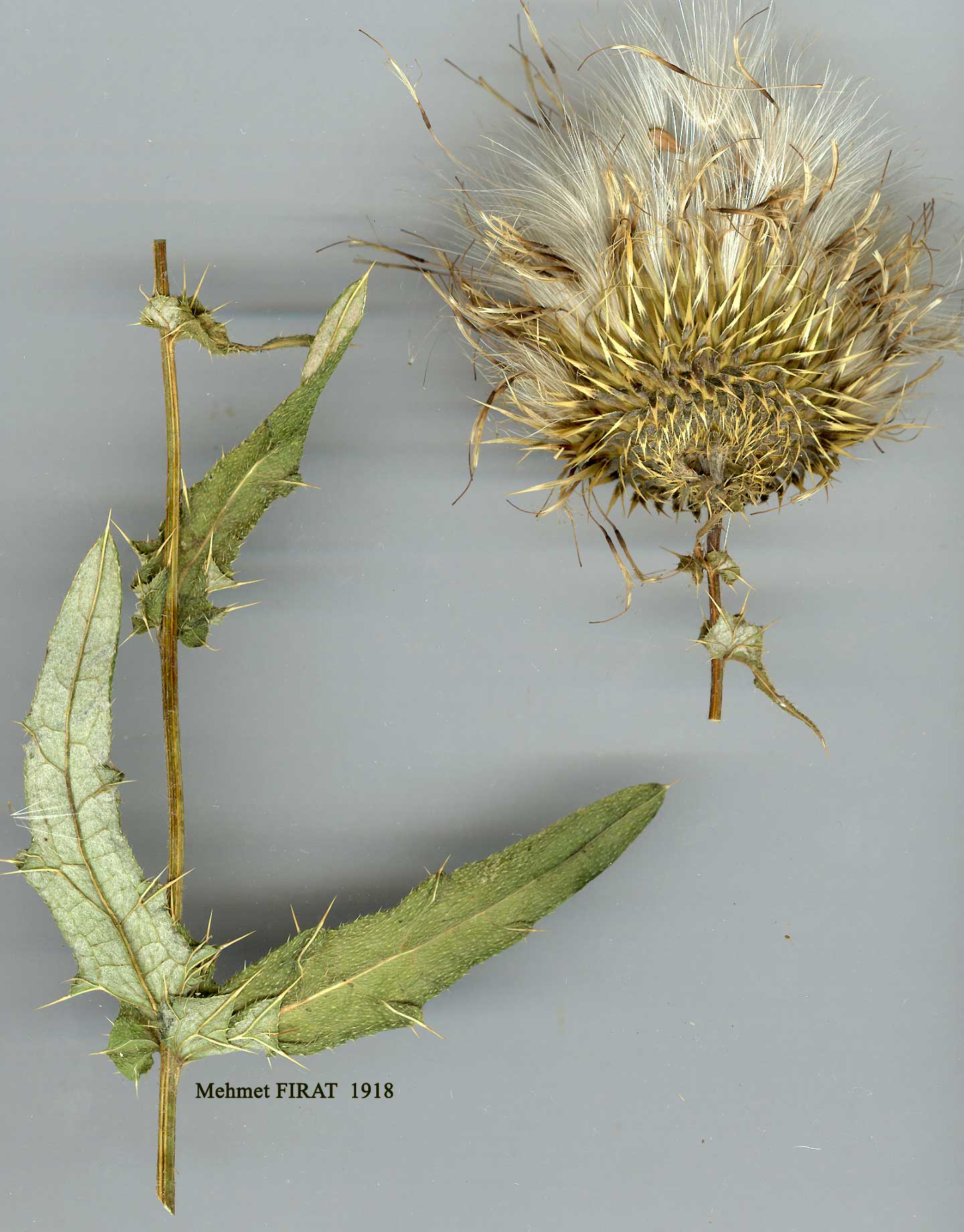 Biennial (?), c. 90-120 cm. Stem branched, unwinged, sparsely arachnoid. Median cauline leaves semi-amplexicaul, oblong, pinnatisect, lateral lobes bifid, 3-7-paired, triangular to lanceolate, as in C. ligulare, lateral and terminal lobes with usually slender 2-13 mm apical spine; spinose-strigose above with setae 0.3-1.3 mm, otherwise glabrous; arachnoid below. Lateral branches 2-8, 1-8-capitulate; uppermost leaves 1-4, somewhat reflexed, shorter than involucre. Involucres erect, depressed-globose to broadly obovoid, 30-40 mm. Phyllaries glabrous, 9-16-seriate; outer reflexed with flattened 0.4-1.0 mm marginal spinules below apical spine, c. 2 mm broad where reflexed; median as outer but sometimes erecto-patent rather than reflexed, bicolorous (centre purplish, margin stramineous), 11.5-16 x 1.5-3 mm incl. stramineous 1.5-3 mm apical spine; inner with shorter spinules, narrower, apex erecto-patent or patent, usually purplish. Corollas pink or purple, 28-40 mm. Achenes 4.5-5.5 mm. Pappus 27-29 mm. Fl. 7-8. Fallow fields and ditches, roadsides, 1800-2500 m.