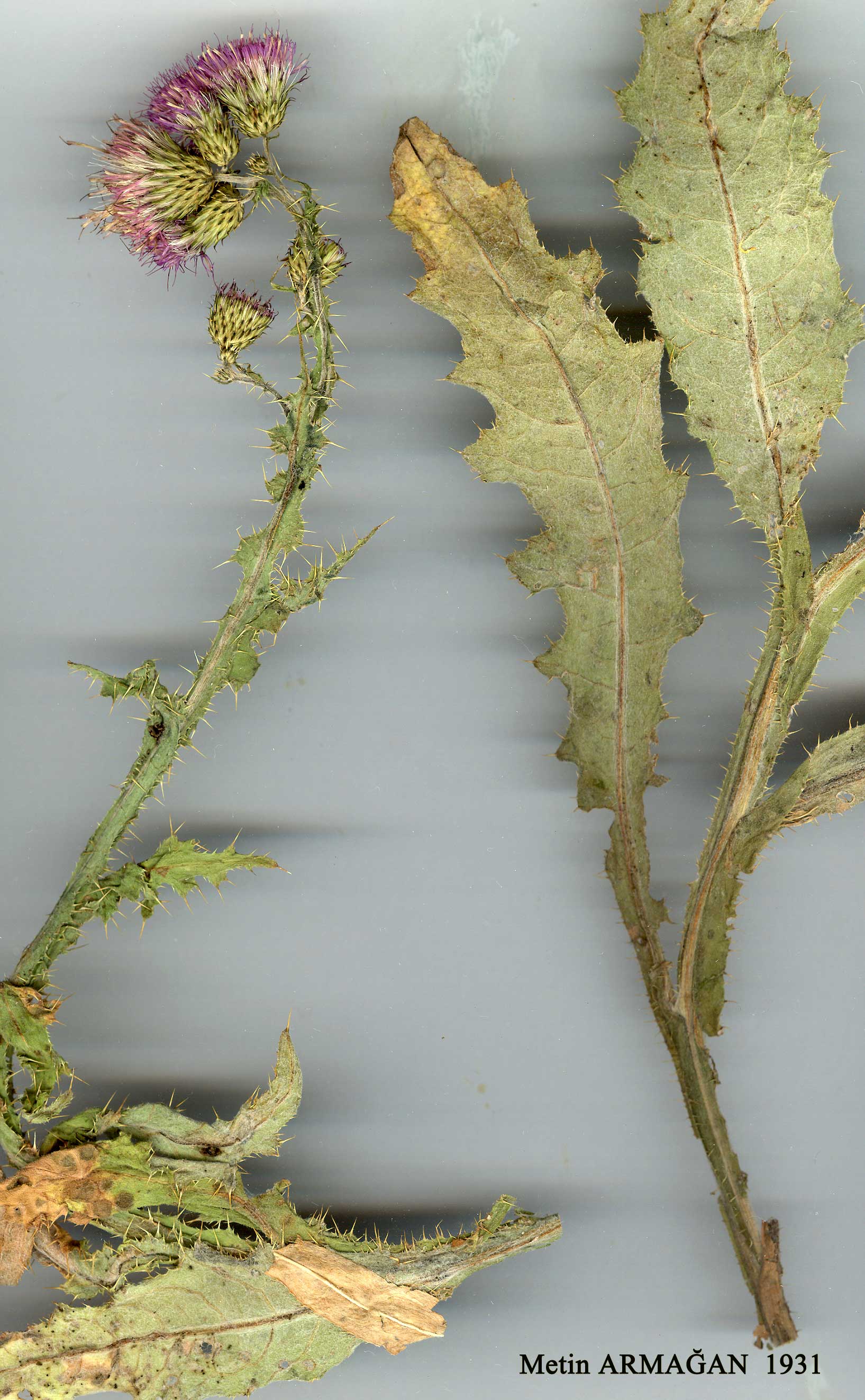 | C. elodes Bieb., Fl. Taur.-Cauc. 3:555 (1819). Syn: C. elodes Bieb. var. indivisum DC, Prodr. 6:642 (1838); C. subinerme Fisch. & Mey. in Mem. Acad. Sci. Pétersb. ser. 6 sci. nat. 6:55 (1849); C. elodes Bieb. var. floccosum Freyn in Bull. Herb. Boiss. 3:468 (1895)! Tall perennial, 60-180 cm. Stems broadly and continuously winged, minutely spinulose to conspicuously spined, sparsely paniculate above. Median cauline leaves oblong-elliptic, 10-18 x 3-6 cm, entire to sinuate lobed to less than ½-way (lobes usually more numerous than in the 3 following spp.), spinulose to spinose with 1-5 mm spines, herbaceous, densely arachnoid-tomentose (sometimes floccose) to sparsely arachnoid (hairs unicellular, slender). Capitula pedunculate to subsessile, borne near top of stem or branches, not subtended by involucrate leaves. Involucres hemispherical, 12-16 mm. Phyllaries 6-8-seriate, ± arachnoid distally, outer and median ovate to oblong-lanceolate, apex subacute, blackish-vittate, bearing a yellowish or blackish, erect or patent 0.5-1.5 mm spine. Corollas 14-17 mm, purplish-pink. Achenes immature. Pappus 12-14 mm. Fl. 6-9. Water meadows, streamsides and springs, 1300-2440 m. Type: no locality designated (see below). Inner Anatolia and Anti-Taurus. A4 Çankiri: d. Ilgaz, nr Topali, 1300 m, Hub.-Mor. 12866! A5 Amasya: Abadschidagh (Abaci Da.), 1300-1500 m, Bornm. 1889:1491! A7 Gümüşane: Büyükdere above Artabir, Sint. 1894:7168 (type of var. floccosum Freyn & Sint.)! A8 Erzurum: Kop Da. pass, 2440 m, Furse 3753! B6 Maraş: Binboğa Da. on Işik Da., 1900 m, D. 20092! B7 Erzincan: Sipikör, Göl De., Sint. 1890:3289! Tunceli: d. Hozat, foot of Munzur Da., 1500 m, D. 31461! B8 Erzurum: Erzurum, Aucher 3389! B9 Van: 5 km S. of Başkale, 2300 m, D. 23789! C6 Adana: nr Hadjin (Hacin), B.Post 566! C10 Van/Hakkari: c. 50 km from Başkale to Hakkari, 1800 m, McNeill 688! Caucasia, N.W. & W. Iran, N. Iraq. Ir.-Tur. element. Very variable in leaf shape and amount of indumentum; forms with subentire leaves have been called var. indivisum (e.g. D. 20092 from B6), but every transition to pinnatilobed occurs. Type material of C. subinerme is evidently a weak-spined shade form of C. elodes, the spines being long and conspicuous on the petioles of the basal leaves; McNeill 688 from B9 is a good match. Material in LE, determined as the 'type' of C. elodes and collected by Bieberstein at Schamachy in Caucasia, is glabrous and does not match Bieberstein's original description of C. elodes; it is apparently C. alatum. |