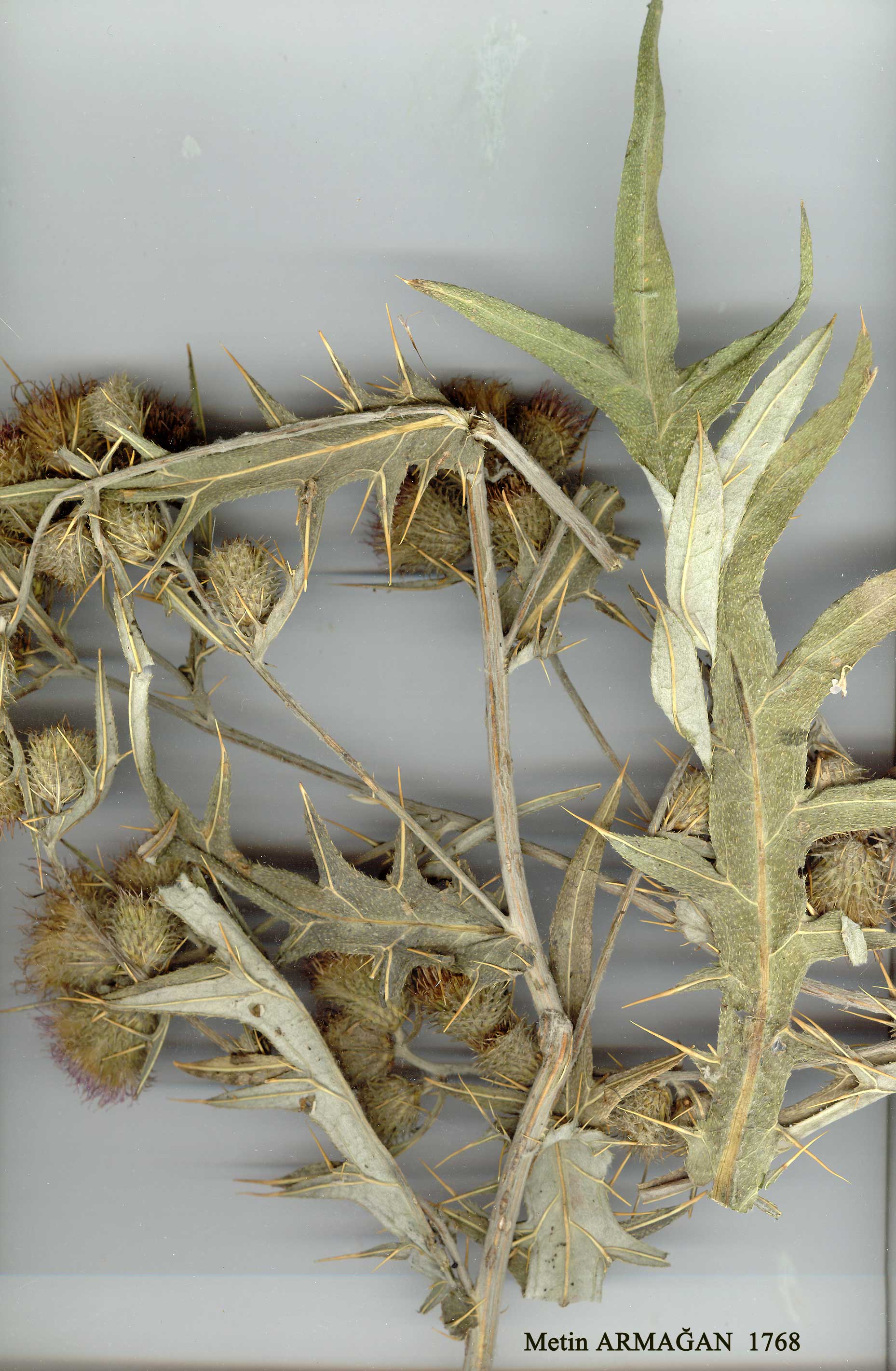 | C. haussknechtii Boiss., Fl. Or. 3:535 (1875). Syn: C. chynisicum Boiss., Fl. Or. 3:536(1875)! Several-stemmed perennial, c. 75-130 cm. Stems branched, unwinged, floccose-arachnoid. Median cauline leaves semi-amplexicaul, oblong, pinnatisect, lateral lobes bifid, 4-8-paired, triangular to lanceolate-triangular; lateral and terminal lobes with moderately stout 3-13 mm apical spine; spinose-strigose above with setae 0.3-1.2 mm, otherwise glabrous; arachnoid below. Lateral branches many, very short, 1-10-capitulate; uppermost leaves 2-4, usually shorter than involucre, sometimes longer, involucrate. Involucres erect in racemose panicle, campanulate-obconical to broadly obovoid, 10-15 mm. Phyllaries sparsely arachnoid, c. 7-9-seriate; median 4-10 mm, including slightly reflexed 0.5-1.0 x 0.1-0.2 mm apical spine. Corollas pink to purple, 11-18.5 mm. Achenes c. 5 mm. Pappus 12-14 mm. Fl. 8-9. Field drain, dry waste ground, 1140-1950 m. Type: [Iran] ad rivulos regionis alpinae montium inter Awiheng (Avihang) et Sihna (Sanandaj) et in monte Schahu (Shahkuh) Kurdistaniae Persiae, 1830-3050 m, Haussknecht (G). E. (& rarely C.) Anatolia. A4 Ankara: 54 km from Ankara to Çankiri, 1140 m, Buttler 15549! B6 Malatya: Doğanşehir, Dedeyazi Köyü Çanakçı, 1400 m, Peşmen 1043 (EGE 8469)! B8 Erzurum: nr Chynys (Hinis), C.Koch (type of C. chynisicum Boiss.)! Muş: S. side of Bingöl Da., 1402 m, Kotschy! B9 Van:between Goulou (Van G.) and Norkeuy (Norgüh), G.&B.Post 721! C10 Hakkari: Yüksekova, 1950 m, Duncan & Tait 174! N. Iraq, W. Iran. Ir.-Tur. element. Turkish material differs from the type description in having a glabrous rather than canescent upper leaf surface. The species is distinguished from C. lappaceum by its smaller involucres which are narrowed (rather than rounded) at base. |