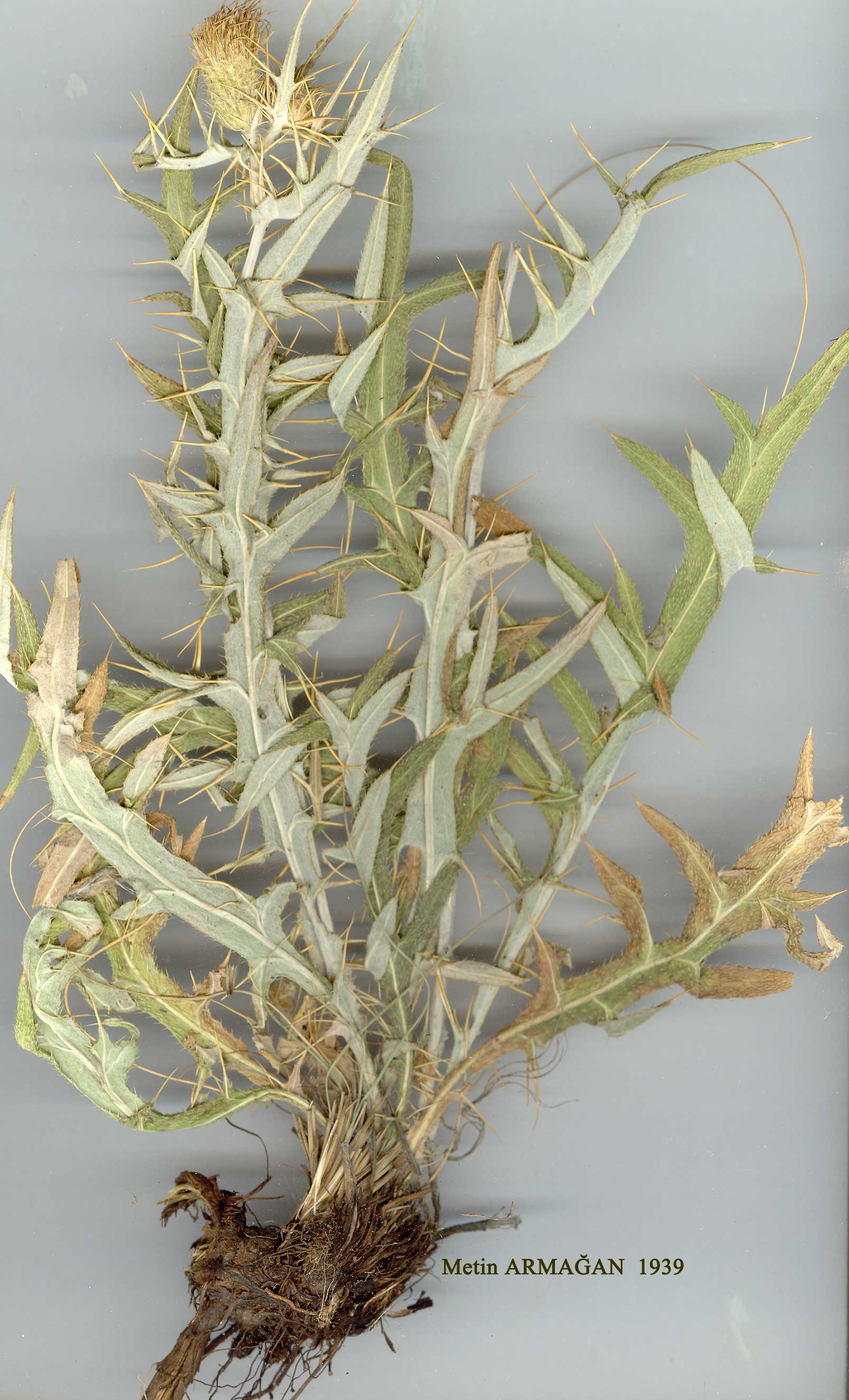 | C. macrobotrys (C.Koch) Boiss., Fl. Or. 3:532 (1875). Syn: Epitrachys macrobotrys C.Koch in Linnaea 24:399 (1851). Map 43, p. 389. Biennial, 30-200(-300) cm. Stem unbranched, unwinged, arachnoid. Median cauline leaves semi-amplexicaul, oblong, pinnatisect, lateral lobes bifid, 3-8-paired, triangular to narrowly triangular, lateral and terminal lobes with weak to moderately stout 3-14 mm apical spine; spinose-strigose above with setae 0.2-2.5 mm, otherwise glabrous; arachnoid below. Uppermost leaves 6-10, longer or shorter than involucre. Involucres erect, subsessile, spicate, (3-)5-12 at stem apex, subglobose-ovoid or angulate-ovoid to broadly obovoid, 20-35 mm. Phyllaries glabrous below, arachnoid at apices, c. 8-10-seriate; outer longer than or equal in length to median; median c. 13-19 mm incl. weak reflexed, recurved or ± erect c. 1-2 x 0.1 mm apical spine. Corollas ochroleucous (A8 & A9), whitish-pink (C9) or purplish-pink (B7 & B8), 23-28 mm. Achenes c. 5.5 mm. Pappus 22-24 mm. Fl. 7-9. In cultivated fields (lucerne), pastures, waste land, 1067-3200 m. Type: [Turkey B8 Erzurum] im armenischen Hochlande, in den Gauen 'Gokssu und Chynys', C.Koch (B). E. Anatolia, except Mesopotamia. A8 Erzurum: Erzurum to Bayburt, 1750 m, Buttler 15924! Gümüşane: Bayburt, 1067 m, Balls 2035! A9 Kars: Yağmurlu Da., 2250 m, D. 32610! Erzurum: Oltu, Abussar Da., Koenig. B7 Erzincan: Sipikör, Sint. 1890:3293! B8 Erzurum: Palandöken Da., 2000-2150 m, D. 47412! Bingöl: 85 km W.S.W. Erzurum towards Tercan, Rech. 15134! Muş: 24 km E. of Muş, D. 24779! B9 Van: Çuk, 1900 m, Nábělek s.n. C9 Hakkari: Kara Da., 3200 m, D. 24452! C10 Hakkari: Mons Harefta, Gulamerik (Hakkari), 2000 m, Nábělek 3542. Soviet Azerbaijan, Caucasus, N. Iran (Talysh). Distinguished from C. lappa-ceum by its biennial habit and large sessile involucres with long outer phyllaries. |