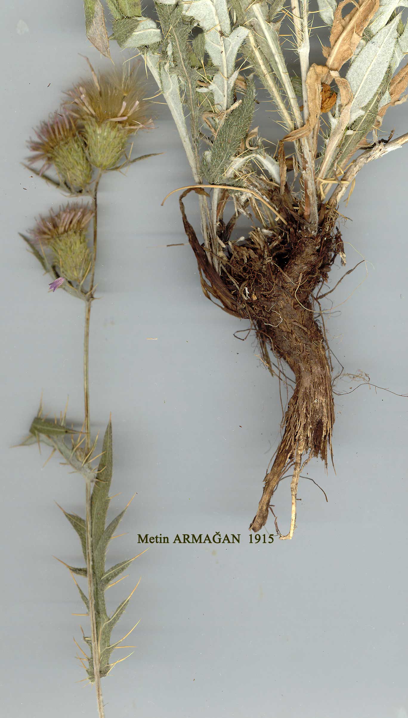 | C. tomentosum C.A. Meyer, Verz. Pfl. Cauc. 69 (1831). Syn: C. munitum (Bieb.) Bieb. var. tomentosum (C.A.Meyer) Boiss., Fl. Or. 3:533 (1875). Ic: Fl. URSS 28: t. 4 f. 2 (1963). Map 40, p. 387. Several- to many-stemmed perennial, c. 50-70 cm. Stems branched, unwinged, fioccose-arachnoid. Median cauline leaves oblong, pinnatifid to pinnatisect, lateral lobes bifid or trifid, toothed, 4-7-paired, triangular to lanceolate-triangular, lateral and terminal lobes with weak to moderately stout 3-14 mm apical spine, spinose-strigose above with setae 0.3-1.5 mm, otherwise arachnoid to tomentose on both sides. Lateral branches 2-6, usually short, 1-2-capitulate; uppermost leaves 3-7, usually overtopping involucre, semi-involucrate. Involucres erect in loose racemes, globose-ovoid to broadly obovoid, 10-20 mm. Phyllaries arach-noid, c. 6-8-seriate; median c. 10-12 mm, incl. recurved or + erect weak c. 2 x0.2 mm apical spine. Corollas pale pink, 17-20 mm. Achenes immature. Pappus 15-18 mm. Fl. 7-8. Stony slopes near streams, edge of flush, igneous scree, 2700-3000 m. Type: [E. Caucasus] in regione alpina Caucasi orientalis, 2560-2740 m, C.A.Meyer (LE). S.E. Anatolia. B9 Van: Güzeldere Tepe, 20 km N.N.W. of Başkale, between Halandurand and Kepir Da., 2800-2900 m, Watson et al. 3667a! d. Başkale, Ispiriz Da., 3000 m, D. 23682! C10 Hakkari: Sat Da., 2700 m, Duncan & Tait 16! Caucasus, Soviet Armenia & Azerbaijan, N. W. & N. Iran. Our concept of this species is based on that of Charadze in Fl. URSS. |