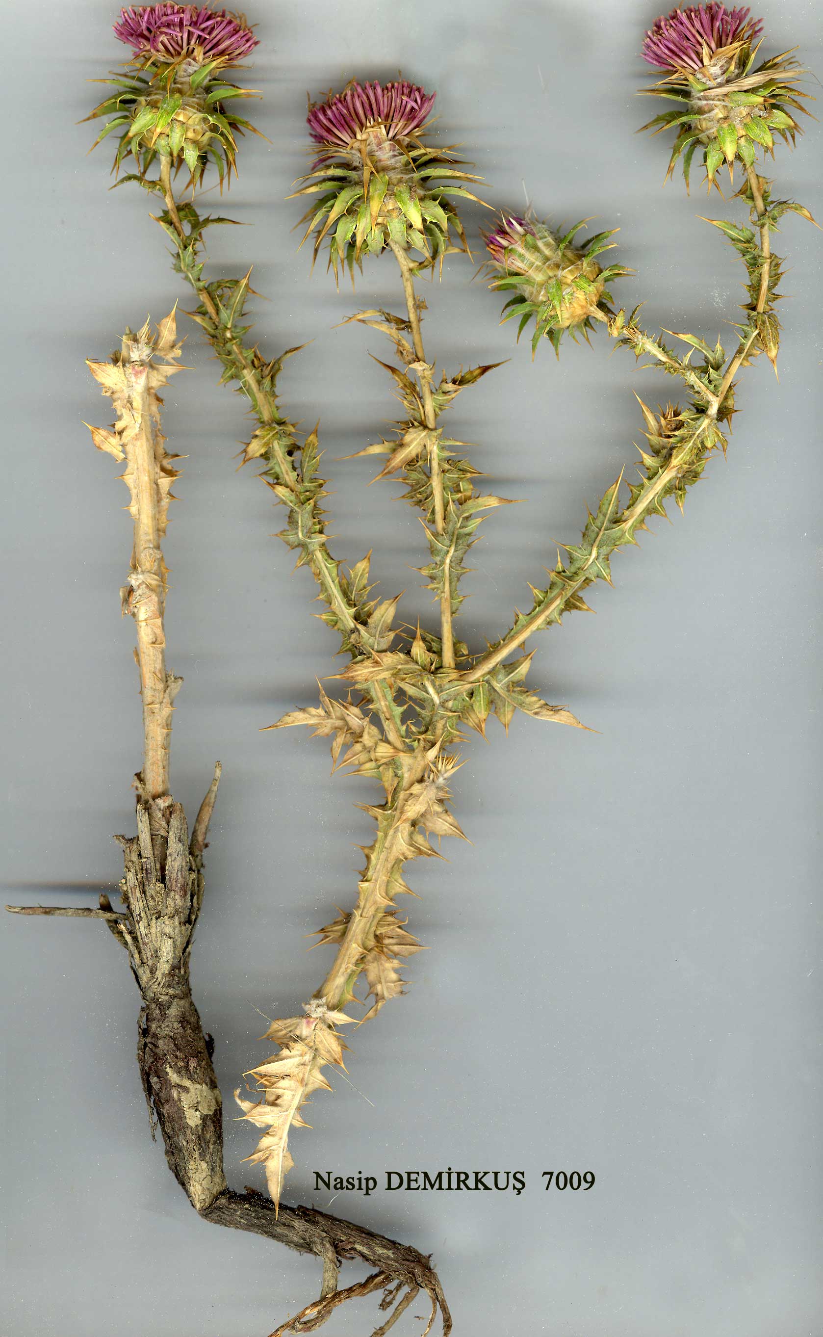 | C. vanensis Hub.-Mor. in Notes R.B.G. Edinb. 32:55 (1972). Figure2, p. 9. Map 33b, p. 341. Biennial or perennial, 10-50 cm, 5-20-headed. Stems slender, terete, striped lengthwise, with erect-spreading branches, arachnoid-woolly, soon glabrescent and glandular-dotted. Leaves leathery, white arachnoid-tomentose on both sides, often glabrescent and glandular-dotted, conspicuously reticulate-veined, with crowded spiny teeth, ± wavy-margined; basal leaves oblong, 5-15 x 2.5-3.5 cm, pinnately lobed or lyrately pinnatisect, with up to 8 pairs of triangular segments, terminal lobe not enlarged; stem leaves gradually smaller, ovate to lanceolate, shallowly lobed or entire, decurrent into wings up to 2(-4) cm long. Capitula 65-90-flowered. Involucre broadly ovoid to globose, 3.5-5 cm broad incl. spines; phyllaries 70-90, arachnoid-woolly, soon glabrescent, ± glandular; appendage reflexed, horizontally or erect-spreading, lanceolate, ovate, cordate or sagittate, 10-15 x 3-7 mm, with 5-15 mm terminal spine and 1-6 lateral prickles. Bristles of receptacle smooth. Flowers pink or purple, 20-25 mm. Achenes bright brown, oblong-cuneate, 5x2 mm, finely longitudinally striped, apex finely margined and indistinctly denticulate. Fl. 6-8. Dry, stony slopes, steppe, 1720-2500 m. Type: Turkey B9 Van: Toprak Rale, hill aber-Morath 8921 (holo. Hb. Hub.-Mor.!).ove Van, steppe, 1770 m, 30 vi 1949, A.Hub S.E. Anatolia. B9 Van: Gevaş to Edremit, D. 22609! Many records around Van. Endemic. Ir.-Tur. element. Related to C. odontolepis DC. from N. Iraq, but terminal lobe of basal leaves not enlarged, stem leaves less strongly decurrent. Sect. Pugioniferae Bunge. Biennials or perennials, monocarpic. Stems short or of medium size, mostly winged, corymbosely branched. Leaves mostly herbaceous, rarely coriaceous, pinnatisect, pinnatipartite or spiny-dentate. Capitula 8-50-flowered. Phyllaries (7-) 15-40, acuminate from a broad base into a keeled spine often longer than breadth of involucre. Flowers pink or purple, 7-15 mm. Achenes small, longitudinally striped or ribbed, often wrinkled, normally truncate and denticulate at apex. |