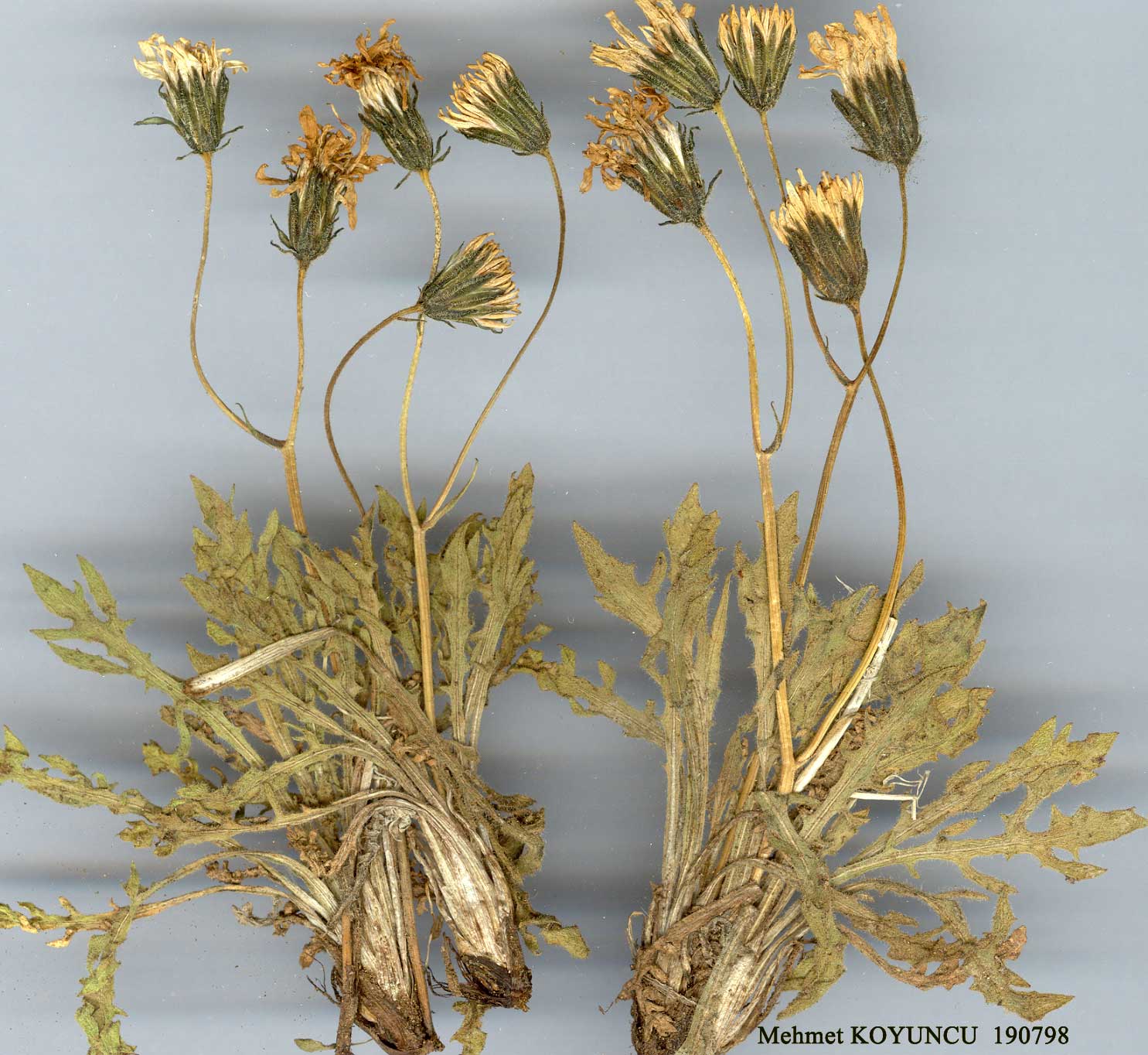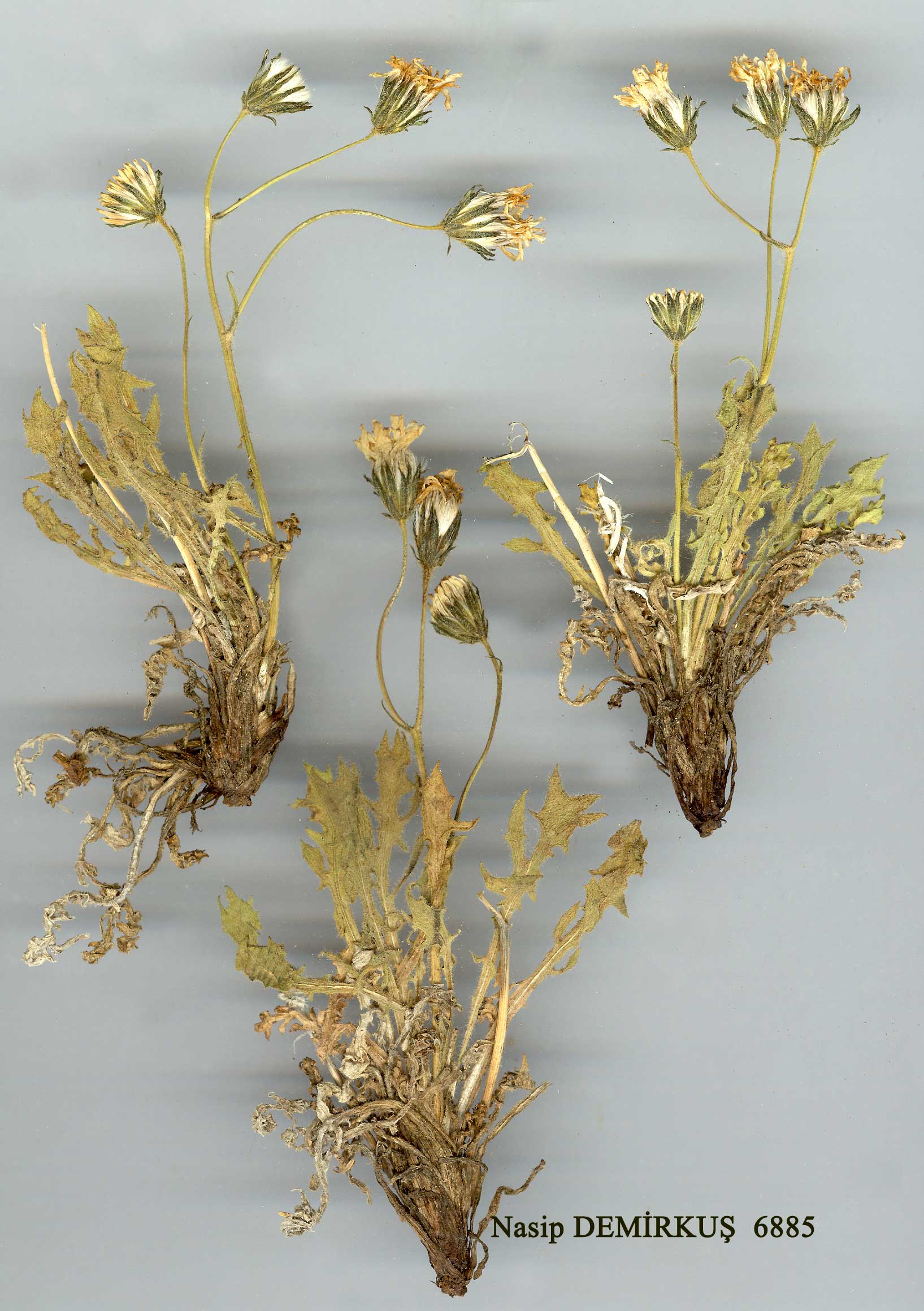 | C. dioritica Schott & Ky. ex Boiss., Fl. Or. 3:842 (1875). Syn: C. albiflora Babcock in Univ. Calif. Publ. Bot. 19:399 (1941). Ic: Babcock, Gen. Crepis f. 30 (as C. albiflora), f. 31 (1947). Dwarf ± scapigerous perennial, 6-15 cm with woody fibrous rhizome. Scapes erect, l-2(-3)-capitulate with fine glandular and eglandular hairs. Leaves 2-7.5 x 0.4-2 cm, ± oblanceolate, irregularly lobed to deeply pinnatifid with dentate lobes, apex acute, hispid with white glandular or eglandular hairs. Capitula 20-40-fiowered. Involucre 7.5-11 mm, pilose with glandular or eglandular hairs. Receptacle glabrous. Ligules 8-11 mm, white with purplish tinge (or pale yellow?). Style branches yellow. Achenes 3.5-4.5 mm, unbeaked, pale greenish-brown, darker when immature, 12-16(-20)-ribbed. Pappus ± included in or partly exserted from involucre. 2n = 8. Fl. 6-8. Dioritic plains, limestone rocks and screes, 2400-3400 m. Syntypes: [Turkey C5 Niğde] in planitie dioritica ad radices montis Gisyl Tepe Tauri Cilicici 8000'†. Kotschy 123 (holo. G! iso. K! P! W! WU!), Balansa. N.E., E. & S. Anatolia. A7 Erzincan: Tayran Da. (S.S.W. of Erzincan), 2500 m, Watson et al. 3349! A8 Gümüşane: Kop Da., between Bayburt and Aşkale, 2438 m, Balls 1795 (type of C. albiflora) (2n = 8)! B9 Van: d. Başkale, Ispiriz Da., 3300 m, D. 23715! C5 Niğde: Bulgarmaden, 1855,Bal.! Endemic. It.-Tur. element? Placed in Sect. Succisocrepis on account of the rhizomatous rootstock and therefore related to C. aurea and C. karakuschensis Czer. (Fl. URSS 29:755, 1964) from Transcaucasia. Babcock separated C. albiflora from C. dioritica on flower and achene colour, size of corolla and stylar arms and on indumentum and phyllary characters. With the material now available it is not possible to maintain them as separate species, the only difference being that of flower colour. C. dioritica was described on dried material by Boissier as having 'ligulae pallide flavae', a description aptly fitting the dried specimens of the white-flowered plants. Further gatherings with detail of flower colour from the Taurus region are needed. Bornmüller (Feddes Rep. 49:246, 1940) records C. dioritica from C5 Adana: Ala Da., 2400 m, Ellenberg 1043 (B!). This is a misidentification of C. willdenowii Czer. Birand (Preliminary list of species collected in Turkey, 304, 1952) cites Balls 1795 as C. heterotricha D C. This is a Persian species related to C. armena and is not known from Turkey. |
