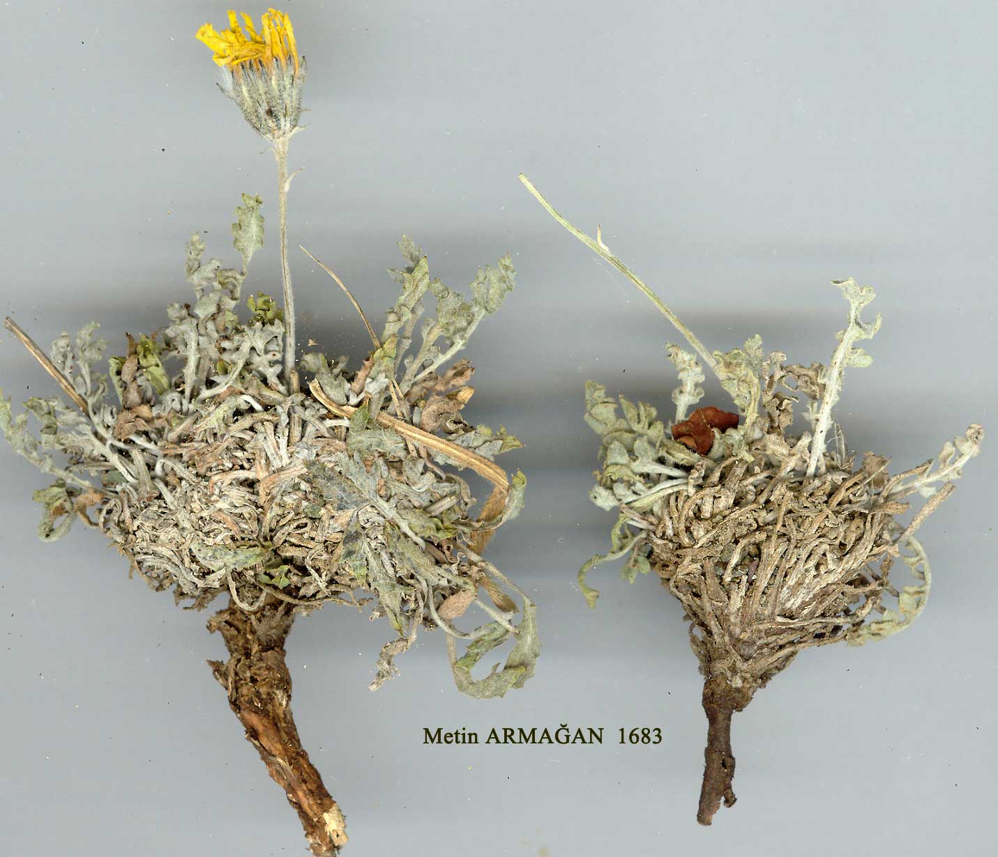 | C. willdenowii Czer. in Fl. URSSt29:645 (1964). Syn: Hieracium pinnatifidum Willd. Sp. PL 3(3): 1560 (1803); Crepis pinnatifida (Willd.) Froel. in DC, Prodr. 7:167 (1838) non Willd. (1803). Ic: Babcock, Gen Crepis f. 133 (1947). Dwarf scapigerous perennial, 2-9 cm, whole plant usually densely canescent-tomentose, with a woody rootstock and deep tap root. Scape erect, 1-capitulate. Leaves 2-6.5 x 0.5-1.2 cm, oblanceolate to elliptic, usually deeply pinnatifid into triangular to oblong sinuate-dentate lobes, apex and teeth acute, often mucronate, sometimes yellow-setulose. Capitula 25-60-flowered. Involucre 10-16.5 mm, phyllaries usually with dark median veins and longer often gland-tipped hairs. Ligules 7-13.5 mm, golden yellow. Style branches yellow. Receptacle shortly ciliate. Achenes 5.5-7 mm, unbeaked, outer pale, inner eventually black, finely ribbed. Pappus partly exserted from involucre. Fl. 6-8. Marly steppe, limestone and igneous slopes and screes, 1000-3400 m. Type: Armenia, Tournefort (BM! B-Willd. 14661, P-Tourn. 4315, photo!). Mainly E. Anatolia and adjacent S. Anatolia. A4 Ankara: Ayaş, by Kayi, 1000 m, Markgraf 1066! A8 Gümüşane: Kop Da., between Bayburt and Aşkale, 2130 m, Balls 1541a! Çoruh: Artvin, Woronow 6144. B6 Sivas: d. Kangal, 37 km S. of Tecer to Gürün, 1570 m, Hub-Mor. 12874! B7 Erzincan: Keşiş Da., above Cimin, 2650 m, D. 31753! B8 Erzurum: Palanteuken (Palandöken) Da. above Erzurum, 2440-2740 m, vii 1853, Huet! B9 Bitlis: Nemrut Da., B.Post 682! Van: d. Gevaş, Artos Da., 3050 m, D. 22761! C5 Niğde: Kizil Tepe, 2800 m, Siehe 246! Adana: d. Karaisali, Bulgar Da., at Meydan Y. above Pozanti, 2400 m, D. 16542! C9 Van/Siirt: Kavuşşahap Da., above Arpit, 2200-2850 m, Mitchell et al. 3569! Transcaucasia. Ir.-Tur. element. Markgraf 11066 from Prov. Ankara is an interesting western extension of the species' range which is otherwise restricted to the Anatolian diagonal eastwards to the mountains around Lake Sevan in Soviet Armenia. The record of the species from B5 Kayseri: Erciyas Da., 2400-2900 m, 1902, Zederbauer! (Ann. Nat. Hofmus. Wien 20, 4:428, 1907) is based on a misidentification of C. frigida. |