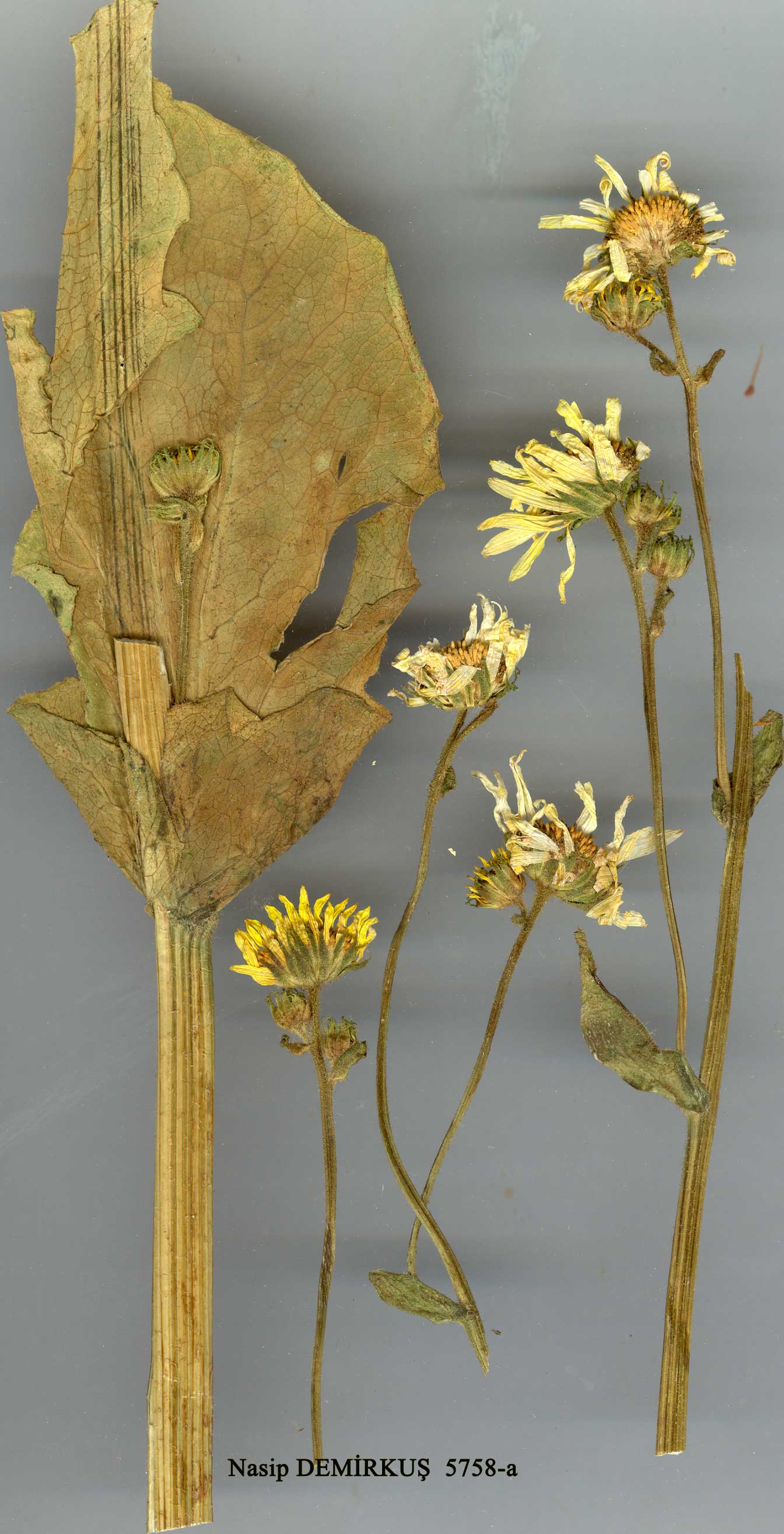 | D. hakkiaricum J.R.Edmondson in Notes R.B.G. Edinb. 32:255 (1972). Map 13, p. 141. ' Plant 100-150 cm. Stem moderately pilose. Leaves moderately to densely glandular-hairy; basal leaves ovate-cordate, 14-18 x 15-18 cm, subacute, margins sparsely clad with short-stalked glands, petioles 20-25 cm, with long multiseriate hairs and short-stalked glands; cauline leaves few and relatively large, ovate to obovate, lowest markedly panduriform, sessile, amplexicaul, clad with numerous short-stalked and some long-stalked glands, sometimes also with blunt-tipped multiseriate hairs. Capitula numerous, up to 18, disc up to 2.5 cm broad; peduncles very densely long-stalked and short-stalked glandular, conical-thickened at apex; each branch of stem bearing a shortly-stalked head, l-2(-4)cm, at apex, and (l-)2(-3) longer-peduncled capitula, 5-7 cm, arising laterally. Phyllaries lanceolate, acute to acuminate, densely clothed with long- and short-stalked glands. Fl. 8. Mountain flushes, 2900 m. Type: Turkey C9 Hakkari: Kara Da., flush, 2900 m, 15 viii 1954, Davis & O.Polunin, D. 24383 (holo. E! iso. BM, K!). The species extends into Nakhichevan, from where it is known from a singlegathering: Kechal Da., in humidis, 2600-2700 m, 4 viii 1934, J.Prilipko & J. Isaev (K!); in addition, a rather late-gathered specimen from Iraq: Algurd Da., on mountain slope, 3000-3300 m, 3 ix 1957, A. el Rawi & Serhang (K!), also approaches this species. Ir.-Tur. element. Related to D. hyrcanum Widder & Rech. fil. |