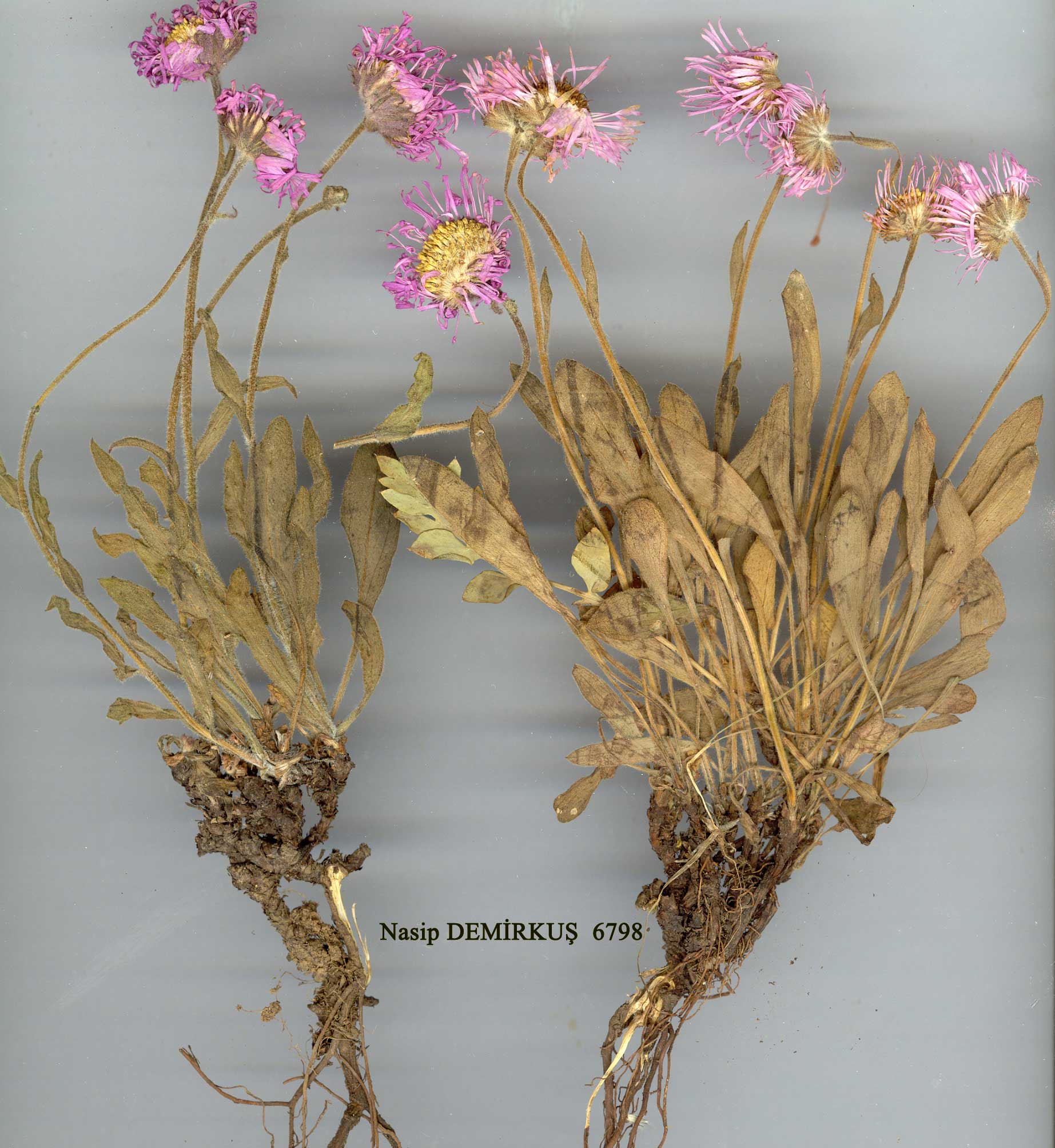 | E. caucasicus Stev. in Mem. Soc. Nat. Mosc. 4:63 (1813). Perennial with sparsely to densely pilose indumentum sometimes intermixed with glandular hairs. Stems ± erect, 5-35 cm, simple or branched above. Basal leaves oblanceolate or spathulate, 2-15x0.5-1.5 cm, acute or obtuse at apex, attenuate to subpetiolate at base, margins entire; cauline leaves lanceolate or ovate, 1-7x0.3-1.5 cm, narrowed or rounded and semi-amplexicaul at base. Capitula solitary or several (up to 6) in loose corymbs. Involucre 1.75-2.25 cm broad, green or purplish-tinged, sparsely to densely pilose, sometimes glandular; phyllaries linear-lanceolate, acuminate, 6-10x0.75 mm. Ray flowers 70-200, mauve-pink or white; ligules 5-15 x 0.4-1.5 mm. Disc corollas 3.5-5 mm. Achenes 2.5-3 mm, pubescent. Pappus brownish, 3.5-5 mm. Fl. 6-8. Rocky (often limestone) slopes and screes, 1620-4385 m. 1. Ligules 5-6(-10) x 0.4-0.5(-0.75) mm, generally inrolled; capitula usually several, less often solitary; cauline leaves usually ovate subsp. caucasicus 1. Ligules (6-)8-15 x 1-1.5 mm, usually flat; capitula often solitary; cauline leaves usually lanceolate subsp. venustus subsp. venustus (Botsch.) Grierson, in Notes R.B.G. Edinb. 33:430 (1975). Syn: Aster pulchellus Willd., Sp. Pl. 3:2019 (1803); Erigeron pulchellus (Willd.) DC, Prodr., 5:287 (1836), non Michx. fil. (1803); E. pulchellus Willd.) DC. var. leucactis Boiss., Fl. Or. 3:164 (1875)! E. venustus Botsch. in Not. Syst. (Lenin-grad) 16:387(1954). Described from Armenia (B-Willd. 15842, photo!). N. & E. Anatolia. A4 Kastamonu: N. side of Ilgaz Da., 2200 m, D. 38371! A5 Kastamonu: Tosya, Sint. 1892:3778! A6 Sivas: Yildiz Da., 1800-2300 m, Sorger 69-58-30! A7 Gümüşane: Kop Da., 2285 m, Balls 1775! A8 Rize: Verçinin Tepe, 3000-3200 m, D. 21146! A9 Çoruh: d. Ardanuç, Kordevan Da., 2700 m, D. 30400! B7 Tunceli: Munzur Da., 2700 m, T. Bay top (ISTE 23178)! B8 Erzurum: Palandöken Da., 20-23 km from Çat to Erzurum, 2300-2350 m, D. 47339! B9 Bitlis: Süphan Da., 3200 m, Stileman 14! B10 Ağri: Ağri Da., 2745 m, B.Post 2107! C9 Van: d. Çatak, Kavuşşahap Da., 3200 m, D. 23094! C10 Hakkari: Cilo Da., 3655 m, D. 24151! N.W. Iran. Most specimens from the S.E. part of this subspecies' range (B9, C9, C10) are small plants less than 15 cm tall (rarely as little as 3 cm), some of . which are found at considerable altitudes (e.g. B9 Bitlis: Süphan Da., up to 4385 m, Stileman 39!). Dwarf plants are, however, not confined to this area; Sint. 3778 (A5 Kastamonu) is less than 10 cm tall. The following specimens appear to be intermediate between the two subspecies: A7 Gümüşane: Stavri (Istavri), 3220 m, Balls 450a! A8 Rize: Cermanin Tepe above Cimil, 3100 m, D. 21079! A9 Kars: Yağmurlu Da. between Sarikamiş and Karaurgan, 2300 m, D. 30809! B10 Kars: Büyük Ağri Da. above Serdar Bulak, 2800 m, D. 46986! Although this is a variable species there is little chance of confusion between it (especially subsp. caucasicus) and E. uniflorus; the former taxon includes larger plants, usually with branched stems, and has finer, less dense indumentum at the base of the phyllaries and on the stems which apparently lack the adpressed hairs of E. uniflorus. Inrolling of the ligules, which has been used by some workers for separating Erigeron species, is probably not always a reliable character and its expression may depend on several factors, not merely the narrowness of the corolla. It is useful in some species (e.g. E. uniflorus) which consistently have short inrolled ligules, but much less so in species such as E. caucasicus which exhibit variation in Iigule width. |