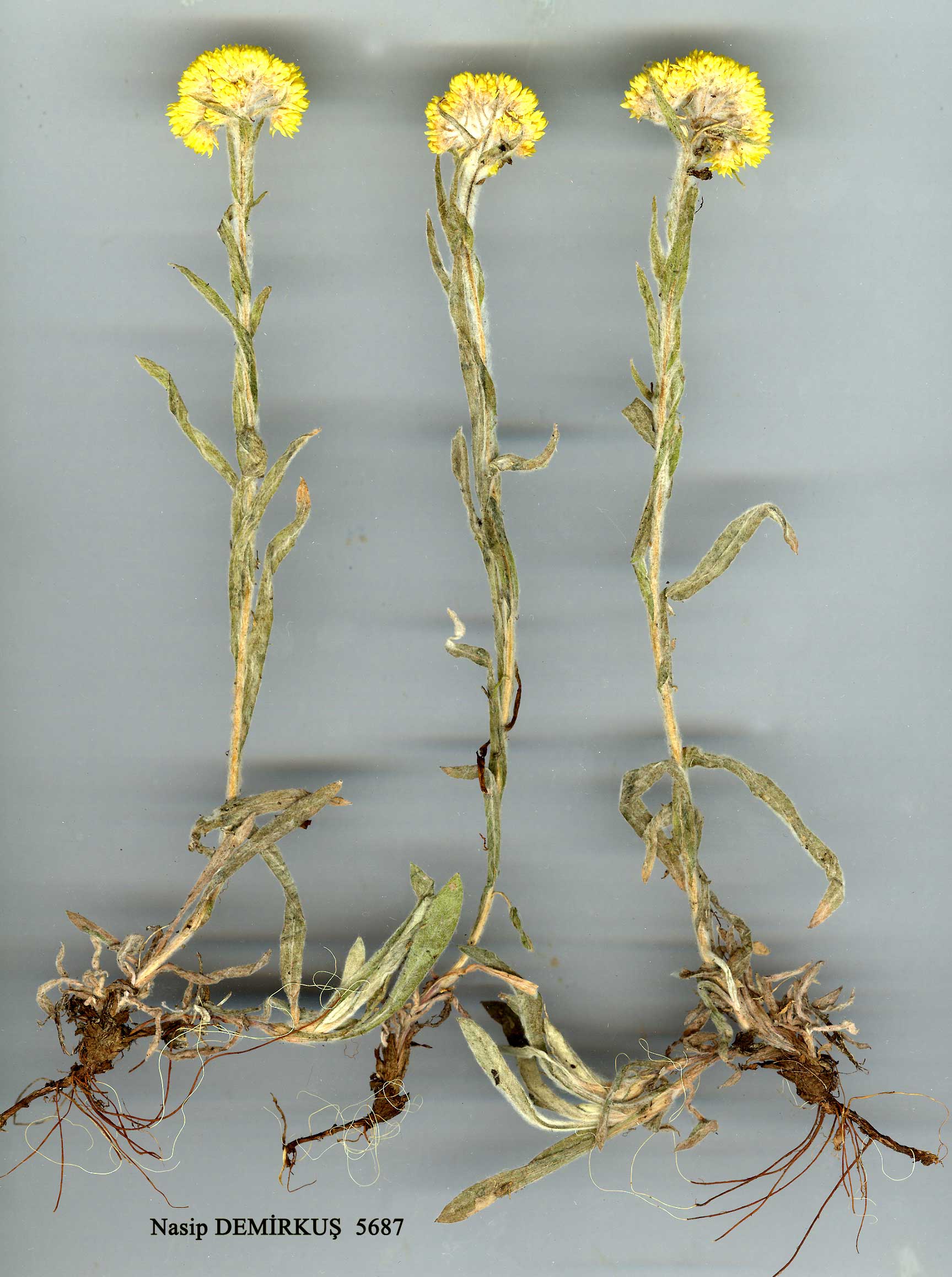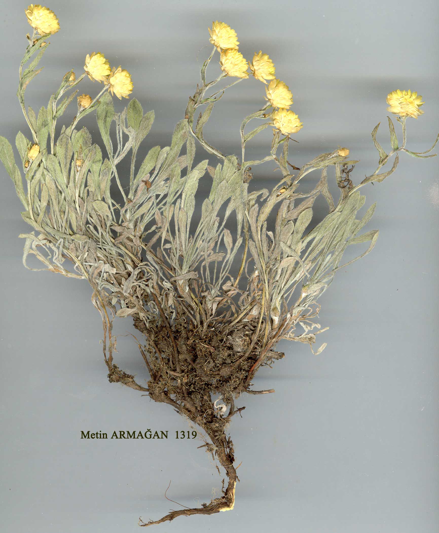 | H. arenarium (L.) Moench, Meth. 575 (1794). Syn: Gnaphalium arenarium L., Sp. PL 854 (1753). Plant grey-adpressed-tomentose, eglandular. Flowering stems 9-46 cm, arising from short stout branched caudices. Sterile shoots with prominently swollen leaf-bases. Basal leaves often crowded, linear-oblanceolate to spathulate, 7-60x1∙5-8 mm; cauline ones narrowing to linear above; sometimes with crisply undulate margin. Capitula numerous, subglobose. Phyllaries ± flat or cucullate, yellow (rarely straw-coloured) or apricot. All flowers hermaphrodite. Fl. 5-8. Dry calcareous or sandy soils; steppe, banks, 250-3200 m. 1. Phyllaries cucullate, apricot, yellow or straw-coloured subsp. rubicundum 1. Phyllaries flat, yellow 2. Leaves undulate; basal leaves 7-20 x 1∙5-4 mm subsp. erzincanicum 2. Leaves not undulate; basal leaves 10-50 x2-8 mm subsp. aucheri subsp. aucheri (Boiss.) Davis & Kupicha in Notes R.B.G. Edinb. 33:239 (1974). Syn: H. aucheri Boiss., Diagn. ser. 1(11):28 (1849). Figure 5, p. 87. Map 11, p. 91. Syntypes: in Persia, Aucher 4789 (P!); [Turkey] Cappadocia ad Euphratem, Aucher 3115 p.p. (iso. K! G!); Mesopotamia, Kotschy 355 (iso. P! K! W! G!). Two sheets of Aucher 3115 (P!) belong to subsp. erzincanicum Davis & Kupicha. Mainly Inner and adjacent N. Anatolia. A3 Ankara: N.W. of Beypazari. S. of Karaköy, Kiihne 607! A4 Çankiri: Çakmaklı De. nr Çankiri, c. 800 m, Bornm. 1929:14259! A5 Sinop: nr Kargi, 250 m, Tobey 2808! Kastamonu: nr Sapaca, Sint. 1892:4387! B4 Ankara: d. Şerefli koçhisar, nr Tuz G., 930 m, Hub.-Mor. 15994! Konya: Konya to Aksaray, 16 km from Sultanhani, 1000 m, D. 35894! B5 Kayseri: Bakir Da. above Kisge, 1400 m, D, 19293! Nevşehir: Göreme, 1200 m, Sorger 69-63-6! Kırşehir: Mucur, D. 21822! B9 Bitlis: nr Adilcevaz, Birand & Karamanoğlu 393! C5 Konya: Bulgar Da. nr Ereğli, Birand & M.Zohary 2713! C6 Maraş: nr Maraş, 610 m, 12 vii 1865, Hausskn.! Endemic? Ir.-Tur. element. Subsp. aucheri is characterized by the presence of densely lanate, spathulate basal leaves. The following specimens appear to be somewhat intermediate between subspp. rubicundum and aucheri. They have oblanceolate-spathulate leaves and sometimes apricot capitula like members of subsp. rubicundum, but usually non-undulate leaves and flat phyllaries as in subsp. aucheri. The letters after each citation are used, as in subsp. rubicundum, to indicate leaf-waviness and colour of capitula: A6 Sivas: 17 km W. of Suşehri, 780 m, M.Zohary 971124 (ab)! A8 Erzurum: 26 km from Tortum to Oltu, 2200 m, D. 47546 (Ab)! B6 Sivas: Kayseri to Sivas G., c. 1280 m, Birand & Karamanoğlu 93 (ab)! B8 Erzurum: c. 14 km from Erzurum to Pasinler, 2000 m, D'. 47447 (ab)! B9 Erzurum: Horasan to Karaur-gan, 1850 m, D. 30744 (aBb)! |