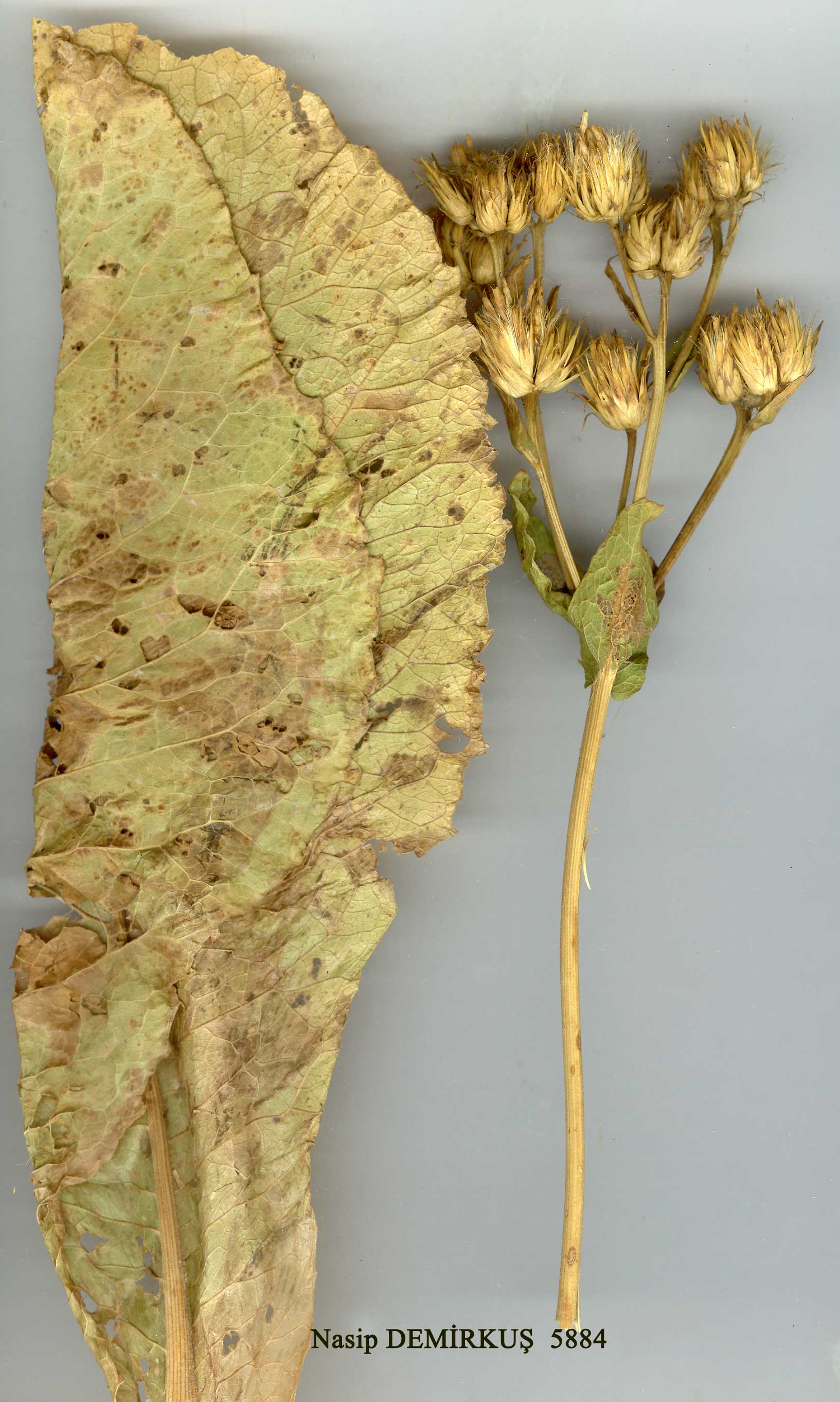 | I. peacockiana (Aitch. & Hemsl.) Korovin, Rastit. Srednei Azii i Yuzhn. Kazakhst. 2:511 (1962). Syn: Codonocephalum peacockianum Aitch. & Hemsl. in Trans. Linn. Soc. London (Bot.) ser. 2, 3:75, t. 31, 32 (1886). Stout perennial herb up to 2 m: base surrounded by fibrous remains of leaves. Basal leaves oblong or ovate, 30-50x15-25 cm (incl. petiole up to 12 cm), attenuate at base, acute or subacute at apex, margin repand-dentate, sub-coriaceous, venation prominent, villous-pubescent and minutely glandular, especially beneath; cauline leaves smaller, sessile, amplexicaul and auriculate at base. Capitula discoid, numerous, in corymbs. Involucre 1 -2 cm broad; phyllaries imbricate, 5-seriate, lanceolate-triangular, acuminate; outer 5 mm; inner 1 ■ 8 mm, finely pubescent and glandular. Flowers yellow. 10-12 mm. Achenes ± 4-5-angular, 65 mm, finely ribbed, minutely glandular. Pappus yellowish, hairs numerous, finely barbellate, 6-12 mm, rather brittle, connate at base. Fl. 6-7. Rocky slopes, 1650-1950 m. Type: [Iran] Khorasan, Aitchison 646 (holo. K!). S.E. Anatolia. B9 Van: Gevaş, D. 22608! C9 Van: S. shore of Van G., 5 km W. of Gevaş, 1670-1700 m, Hub.-Mor. 10859! C10 Hakkari: Yüksekova, 1950 m, D. 44954! Iran, Tien-Shan, İr.-Tur. element. |