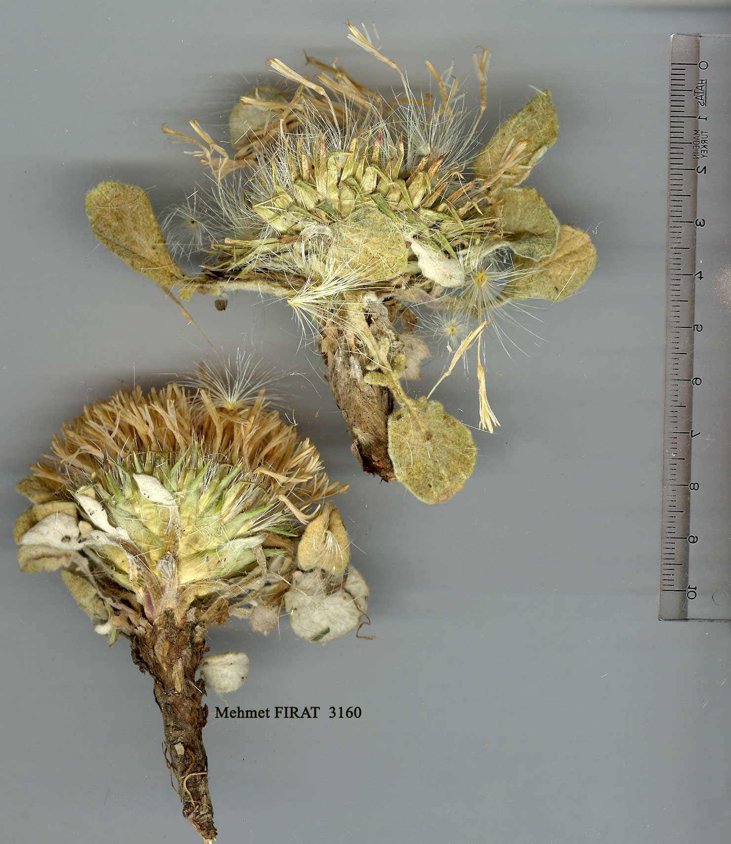 | J. moschus (Habl.) Bobrov in Bot. Zhurn. 43:1545 (1958). Dwarf, rosulate perennial, stoutly taprooted. Leaves petiolate, simple, lyrate or pinnatisect, sparsely arachnoid and densely glandular-pitted to glabrescent, smooth and eglandular above, white and densely arachnoid beneath. Capitula sessile, usually solitary in each rosette. Involucre subglobose, 25-40(-50) mm broad; phyllaries 4-5-seriate, lanceolate, outer arachnoid, recurved or reflexed, inner glabrescent. Flowers lilac-pink, very fragrant. Achenes longitudinally striate or transversely rugulose, 4-5 mm. Pappus 2-4 x as long as achenes, deciduous, hairs barbellate. 1. Leaves simple to lyrate, 1-7-lobed, woolly and glandular-pitted above (terminal segment ovate to orbicular with obtuse apex) subsp. moschus 1. Leaves l(-2)-pinnatisect with numerous narrow segments, mostly glabrescent,± smooth and eglandular above subsp. pinnatisecta subsp. moschus. Syn: Centaurea moschus Habl. in Neue nord. Beitr. 4:54 (1783) et in Gmelin, Reise Russl. 4:61 (1784); Jurinea depressa (Stev.) C.A.Meyer, Verz. Pfl. Cauc. 67 (1831); Jurinella aucheri Jaub. & Spach, I11. PL Or. 2: t. 183 (1847); Jurinea depressa (Stev.) C.A.Meyer var. subintegrifolia Bornm. in Feddes Rep. Beih. 89:368 (1944)! Jurinella moschus (Habl.) Bobrov in Bot. Zhurn. 47:580 (1962). Ic: Jaub. & Spach, loc. cit. (1847); Trans. Linn. Soc. London (Bot.) 11: t. 38 (1815) as Serratula depressa. Map 50, p. 449. Fl. 7-8. Limestone and basic igneous screes and rocky slopes, 1500-3700 m. Described from E. Caucasia. Inner and adjacent S. & N. Anatolia. A4 Kastamonu: Büyük Ilgaz Da., 2500 m, Sint. 1892:4781! A8/B8 Armenia, Calvert & Zohrab! A9 Kars: Killik Da. W. of Akçay to Cumaçay road, 2250-2500 m, Watson et al. 3363! B3 Konya: Sultan Da., 2200 m, Bornm. 1899:4687 (type of J. depressa var. subintegrifolia) ! B5 Kayseri: Argaeus (Erciyas Da.), 2700 m, Bornm. 1791 ! B6 Sivas: 30 km S.W. of Kangal (Gürüm), 1500 m, Sorger 70-32-10! B7 Erzincan: Sipikör Da., Sint. 1889:1224 p.p.! B8 Erzurum: mountains above Erzurum, Hitet. B9 Van: d. Başkale, Ispiriz Da., 3300 m, D. 23713! B10 Kars: Ararat (Büyük Ağri Da.), 2590 m, B.Post 2145 (atypical)! C3 Isparta: Dedegöl Da., c. 2200 m, Sorger 65-42-25 ! C4 Antalya: d. Alanya, Geyik Da., c. 2600 m, D. 14575! C5 Niğde: Kizil Tepe above Maden, 2800 m, Siehe 1912:184! C6 Maraş: Berit Da., 3000 m, 9 viii 1865, Hausskn.! Caucasia, N.W. Iran, N. Iraq. Ir.-Tur. element. |