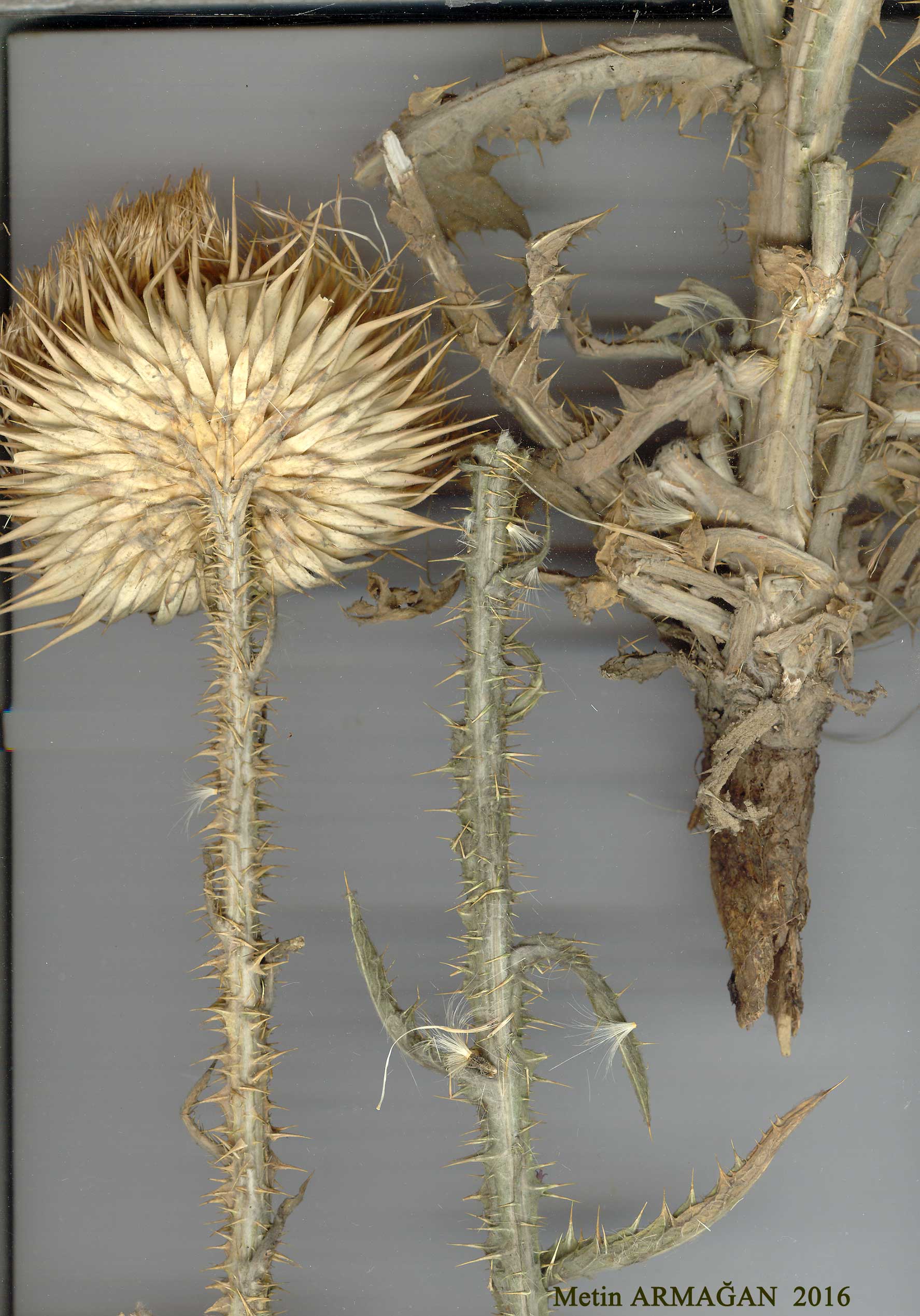 | O. acanthium L., Sp. Pl. 827 (1753). Ic: Reichb., Ic. Fl. Germ. 15: t. 813 (1853); Fiori, Ic. Fl. Ital. f. 3805 (1904). Biennial, 30-150 cm, sparsely to densely arachnoid. Stem erect, branched above into compound corymbs with 2-7 capitula, leafy and winged throughout; wings 2-4, spinose and sinuate; spines 2-11 mm. Basal leaves elliptic; cauline leaves becoming linear-lanceolate upwards, pinnatilobed, lobes triangular with 2-11 mm spine. Capitula on winged leafy stems. Involucre globose, 2-3 x 2-6 cm (excl. spines), with flat to concave base; phyllaries slender, subulate, 7-25 x 2-3 mm (incl. spine), gradually attenuate from 2-3 mm broad base to 2-6 mm weak yellow spine, glabrous to slightly arachnoid; outer and median phyllaries reflexed to patent, inner erect. Flowers longer than inner phyllaries. Pappus hairs barbellate, lateral projections 0.5-1.5 x as long as rachis width. Fl. 6-8. Rocky slopes, screes, clearings in forests, roadsides and weed in fields, 600-2600 m. Lectotype designated here: [E. Germany] Misnia (nr Dresden), Bohemia, Bavaria, Burser, Hortus Siccus 21:44 (UPS photo!). Widespread in E. Anatolia; local in N. & S.W. Anatolia. A2(A) Istanbul: Kadiköy, 22 xii 1912, Azn.! A5 Kastamonu: Tosya, Sint. 1892:4917! A7 Gümüşane: Taltaban, Sint. 1894:6286! A8 Çoruh: Çoruh gorge between Artvin & Borçka, 600 m, D. 29991! B4 Ankara: Kayaş, Krause. B7 Diyarbakir: Khan Kezzin to Arghany (Ergani), B.Post 424! B8 Erzurum: Erzurum, Zohrab! B9 Van: Başkale, Ispiriz Da., 2600 m, D. 23731! B9/10 Ağri: Bazargan to Doğubayazit, Rech. 37654! B10 Kars: Pamuk Da., Iğdir to Doğubayazit, 1500 m, D. 47042! C3 Isparta: Dedegöl Da., 1300 m, Sorger 68-43-33! C8 Mardin: Mardin, Sint. 1888:1202! C9 Hakkari: Zab gorge, 32-45 km from Çukurchas probably been long naturalized in Europe, where it reaches much bigger vegetative dimensions than in Turkey. It occupies secondary habitats in Europe, while in Turkey (and N. Iraq) it has a rather distinctive distribution pattern (pre-dominantly eastern) and grows in primary habitats as well, e.g. screes and rocky slopes. White-flowered populations occur. Hybrid populations with O. tauricum (q.v.) occur in S. France. a to Hakkari, 900-1000 m, D. 44785! C. Asia to W. Europe. Introduced in N. America. It seems that O. acanthium |