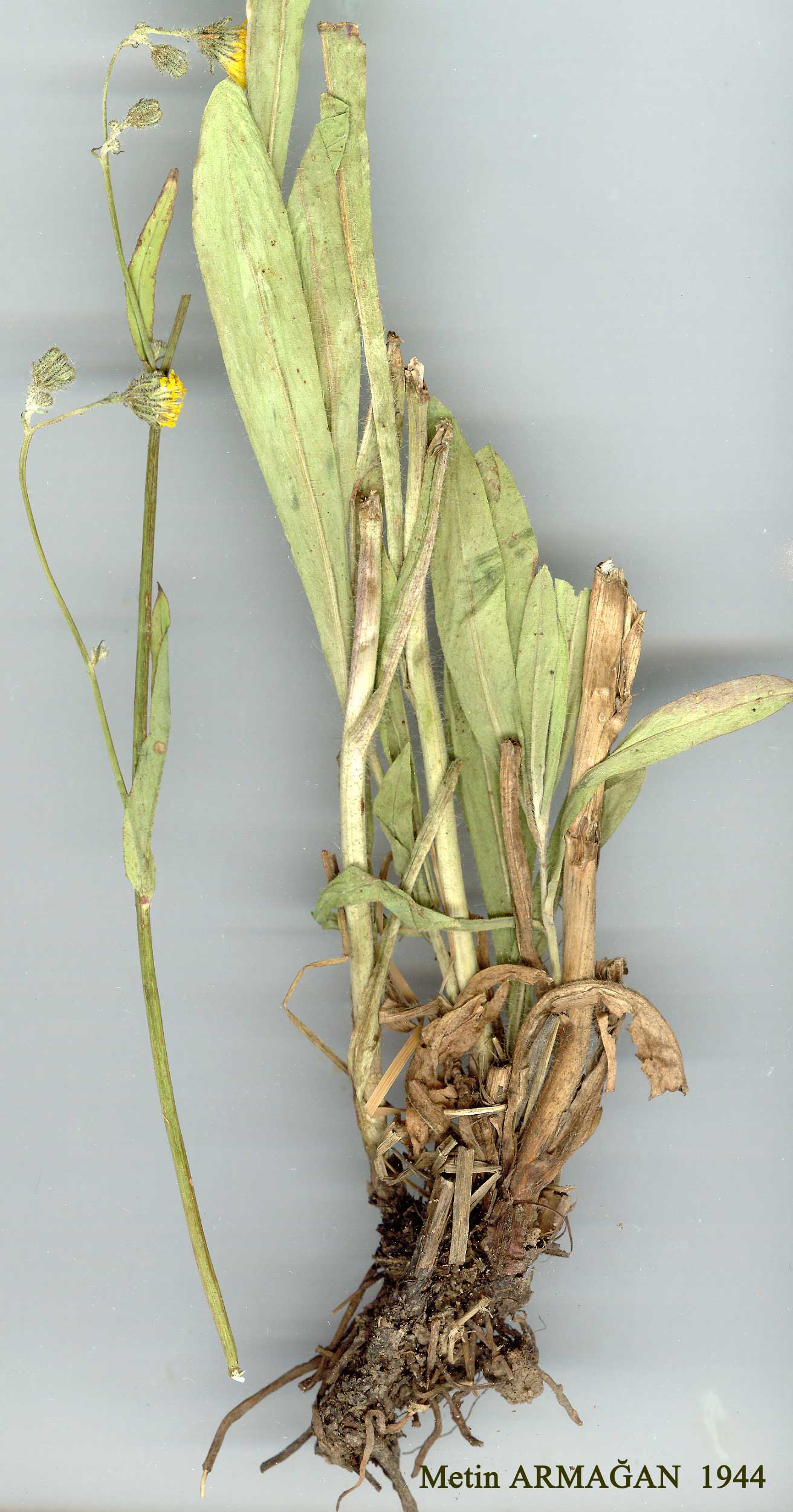 | P. x maschukensis (Litw. & Zahn) Sojak in Folia Geobot. & Phytotax. 6:218 (1971). (P. echioides x verruculata). Syn: ?Hieracium procerum subsp. buhsei NP. op. cit. 489; H. maschukense Litw. & Zahn in Feddes Rep. 4:182 (1907); H. maschukense subsp. caucasiciforme Litw. & Zahn, op. cit. 183; H. woronowianum Zahn in Monit. Jard. Bot. Tiflis 12:3 (1908); ?H. buhsei(NP.) Juxip in Fl. URSS 30:411 (1960). Differs from P. echioides in having ± numerous yellowish-brown glandular hairs on the involucre, and from P. verruculata in having ± numerous simple eglandular hairs on the involucre and upper part of the stem. Fl. 6-7. Alt. 1100-2800 m. Type: [Caucasus] prov. Terek, in M. Maschuka pr. Pjatigorsk, 600-960 m, vi, Litwinow. N.E., Inner & S.W. Anatolia. A4 Ankara: nr Ankara, Çubuk Dam, Plitm. 50623! A7 Giresun: Eribel pass, 28 km N. of Şebin Karahisar, 1760 m, Hub.-Mor. 16378! A8 Erzurum: 7 km from Tortum to Erzurum, 1800 m, Hub.-Mor. 16365! A9 Kars: d. Ardahan, Yalnizçam pass, 2300 m, Hub.-Mor. 16417! B3 Konya: Sultan Da. nr Akşehir, 1100 m, 28 vi 1899, Bornm. ! B6 Sivas: 11 km from Gürün to Pinarbaşi, 1740 m, Hub.-Mor. 16364! B7 Tunceli: 1 km from Pülümür to Mutu, 1450 m, Hub.-Mor. 16371! B9 Van: d. Başkale, Ispiriz Da., 2800 m, D. 23639! C3 Antalya: d. Kemer, Teke Da. nr Ovacik, 1100-1200 m, D. 15201! Caucasus, Iran. |