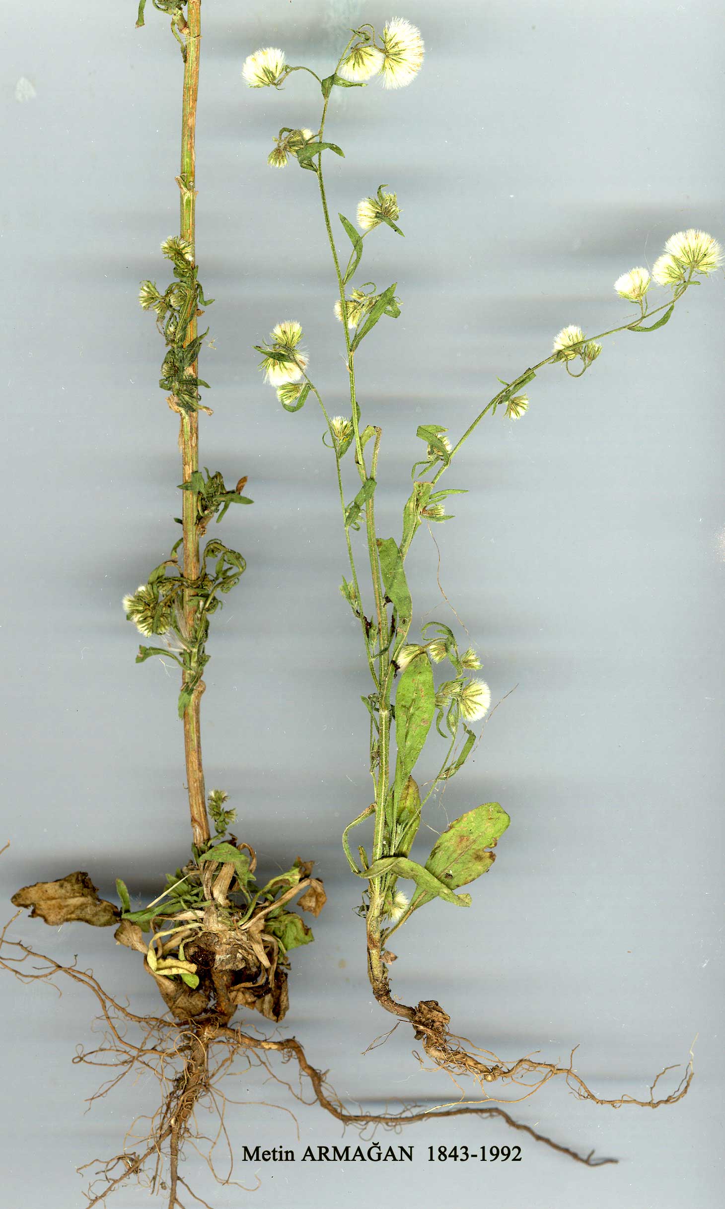 | P. nigromontanus (Boiss. & Buhse) Grierson in Notes R.B.G. Edinb. 27:144 (1967). Syn: Erigeron nigromontanus Boiss. & Buhse in Nouv. Mem. Soc. Nat. Mosc. 12:114 (1860), non M. Pop. (1940); E. aucheri (DC.) Boiss., Fl. Or. 3:170 (1875) pro parte quoad syn. E. nigromontanus Boiss. & Buhse. Biennial. Stems 15-90 cm, crispate-pubescent, bearing 7 to many capitula in racemose panicles. Lower cauline leaves oblanceolate, up to 8 x 2.5 cm, attenuate at base, acute at apex, entire or with a few coarse teeth; upper leaves elliptic, up to 3 x 0.75 cm, usually entire, crispate-pubescent on both surfaces. Involucre 0.5-1 cm broad; phyllaries lanceolate, 3-4x0.5-0.75 mm, pilose and glandular near base. Flowers yellow; female ones numerous, corollas filiform, 1.75-2 mm; functionally male ones 6-12, corollas 3-3.5 mm. Fertile achenes 1.75-2 mm, sparsely pubescent. Pappus brownish-white, 3-4.5 mm. Fl. 7-9. Moist places, fields and stream sides, 1220-1920 m. Type: [Iran] Karadagh, vii 1847, Buhse (holo. LE! iso. K!). Mainly Inner Anatolia. A4 Çankiri: nr Çankiri, 1430 m, Buttler 15588! A8 Erzurum: Tortum, Calvert. Gümüşane: Almuska nr Bayburt, Bourgeau 147! B3 Afyon: Afyon to Sandikli, Jenkins 2163! B7 Erzurum: Pirnakapan Köyu, 1730 m, Buttler 14261! Erzincan: Sipikör nr Yerbatan. Sint. 1890:3267! Tunceli: 7 km S. of Kirmiziköprü, 1220 m, Buttler 15884! B9 Bitlis: 32 km E. of Muş, D. 24775! Van: Van to Hoşap, 15 km from Hasbasa (Asbaşin), 1920 m, 8 vii 1951, Simon! C5: Bulgardagh, mt. Armadschek, 1500-1600 m, 21 viii 1931, Eig & M.Zoharyl C6 Maraş: nr Maraş, Hausskn. C9 Hakkari: Zab river nr Çölemerik, Nâbelek 3512. N. Iraq, W. & N.W. Iran. Ir.-Tur. element. |